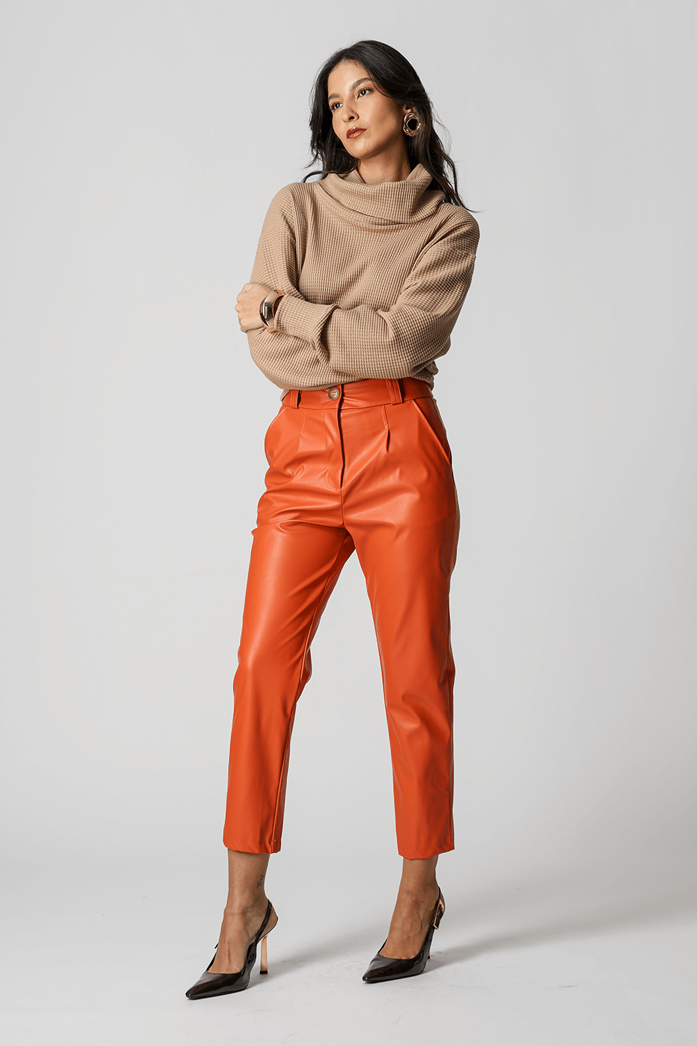 Pantalón con forma de zanahoria fabricado en piel sintética con tira cosida en dos tonos. Es una pieza súper única que añade un toque súper elegante a tu look.