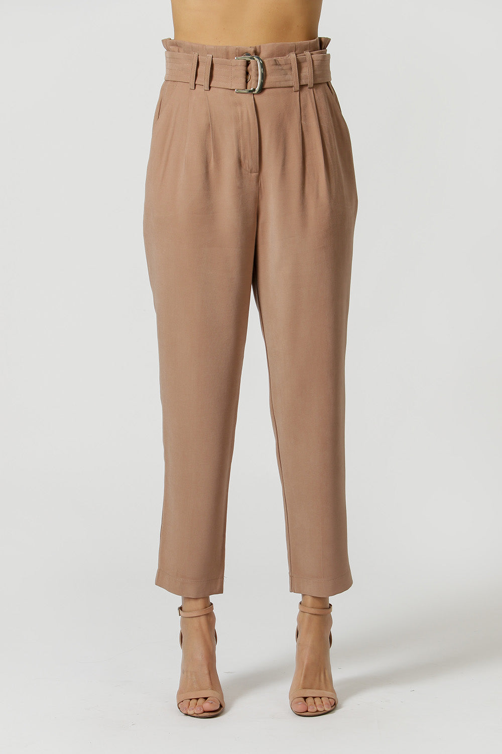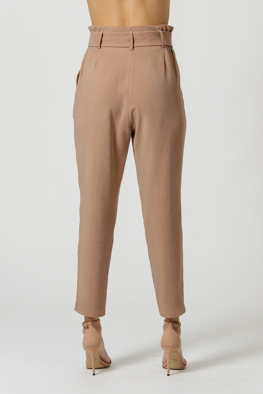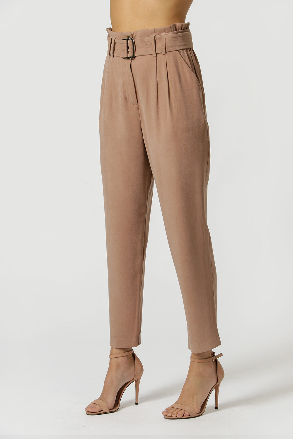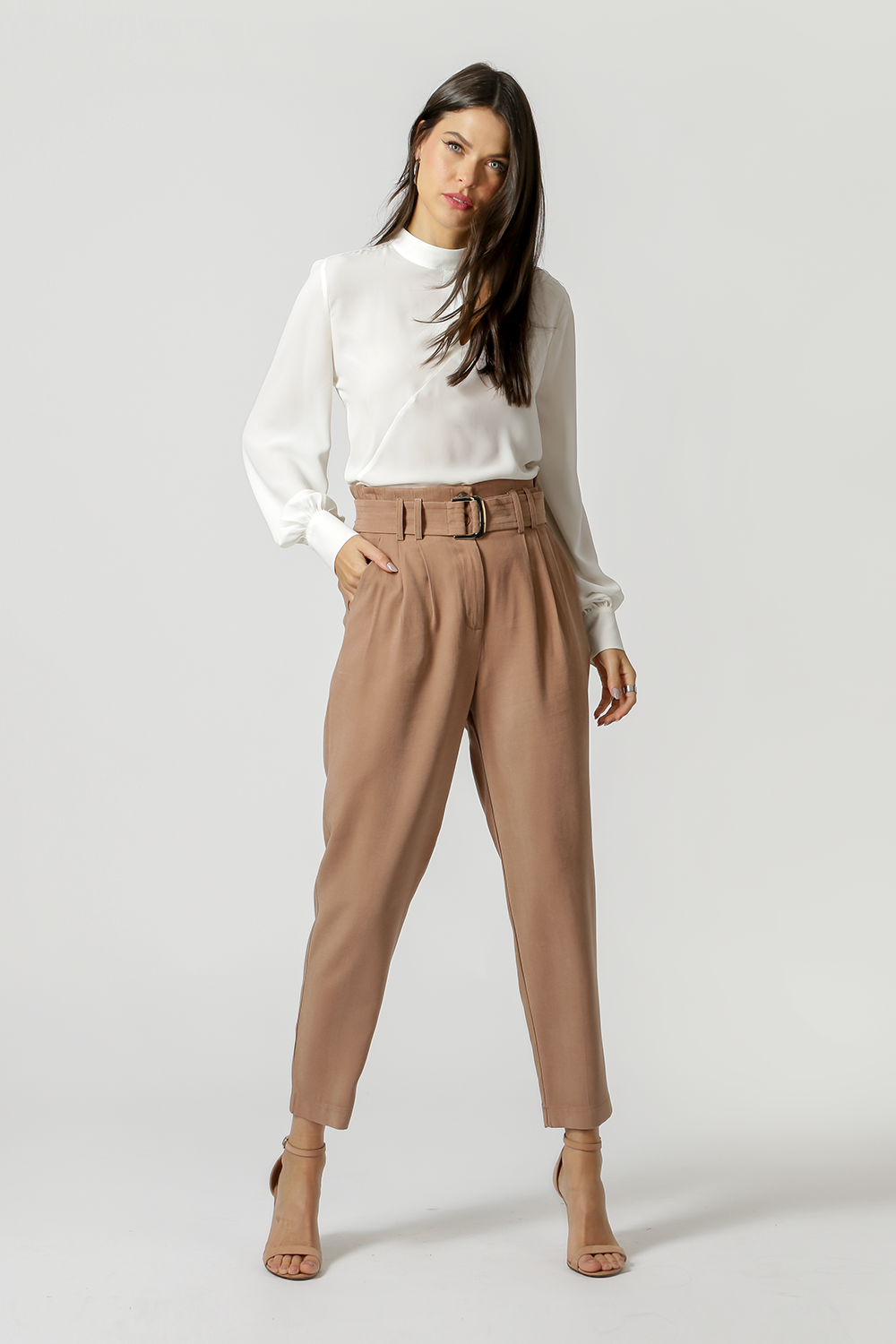 Pantalón Clochard, confeccionado en viscosa, tiene detalles plisados ​​y elástico. Viene con un cinturón con hebilla para hacer la pieza más ajustada y realzar la silueta.