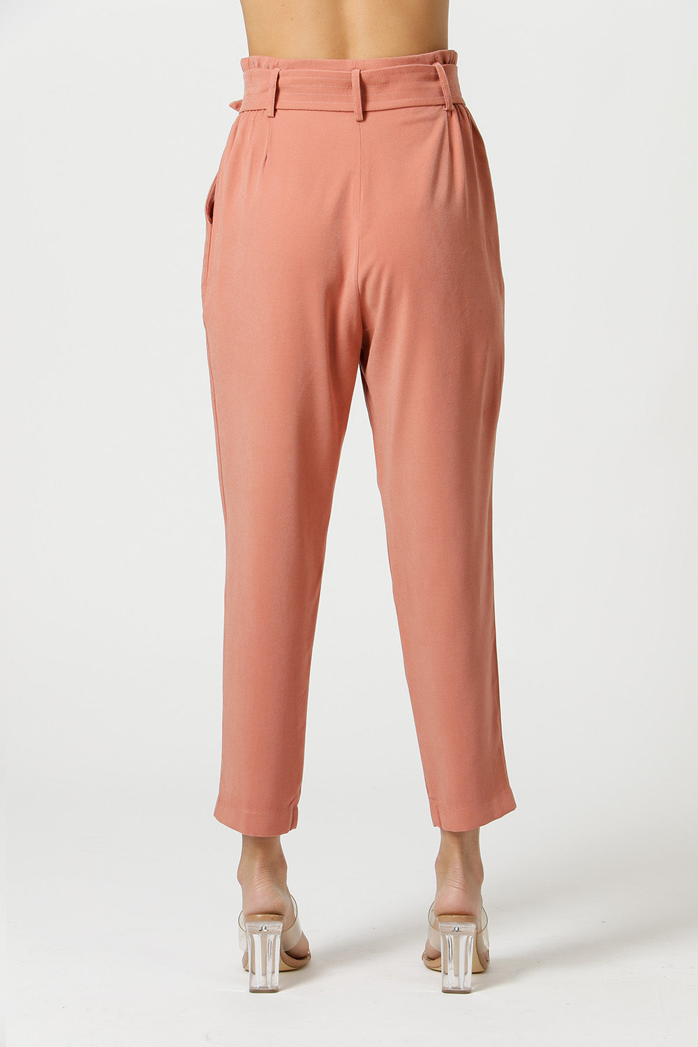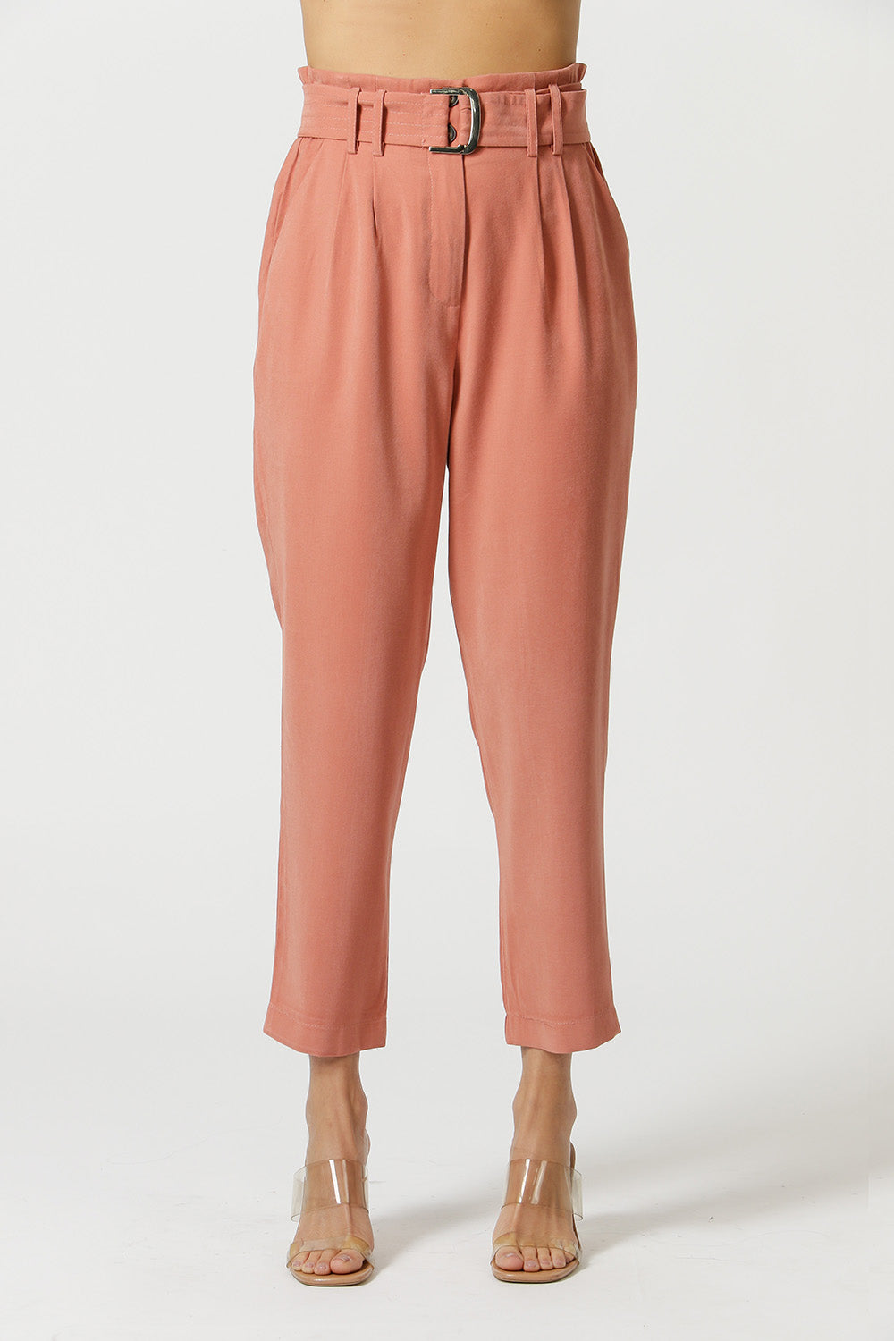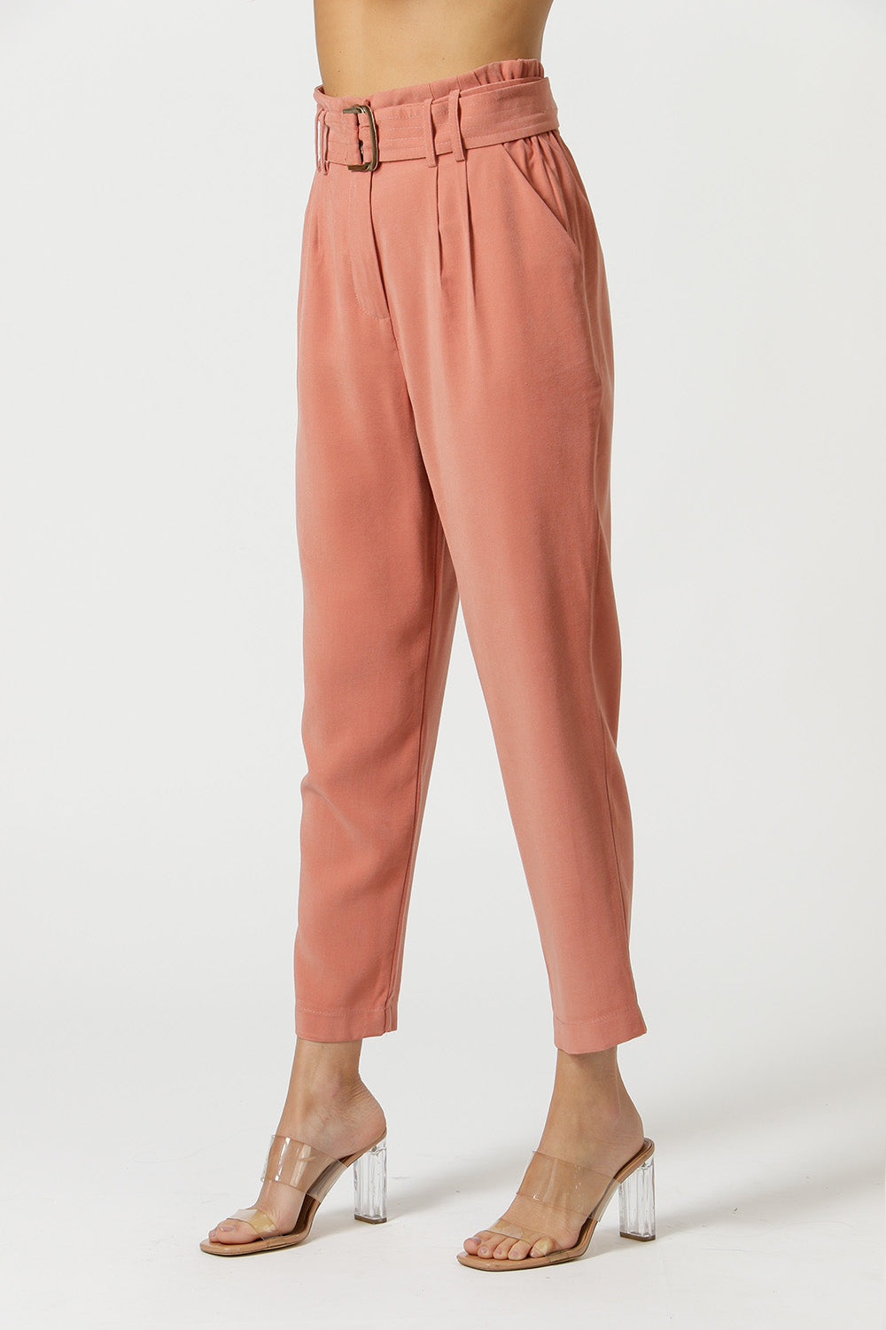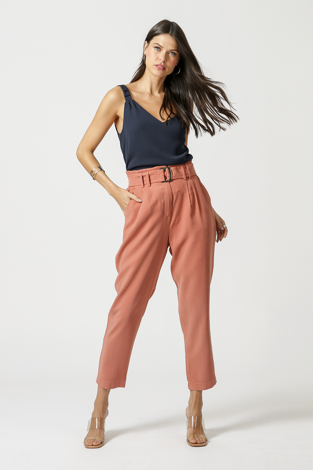 Pantalón Clochard, confeccionado en viscosa, tiene detalles plisados y elástico. Viene con un cinturón con hebilla para hacer la pieza más ajustada y realzar la silueta.