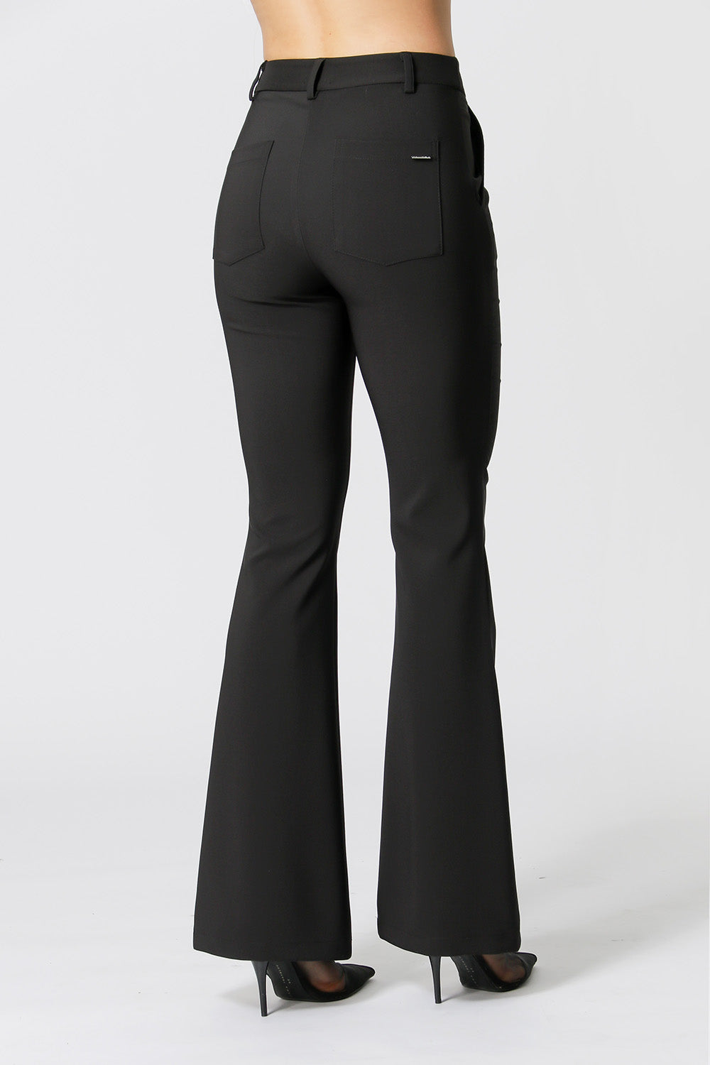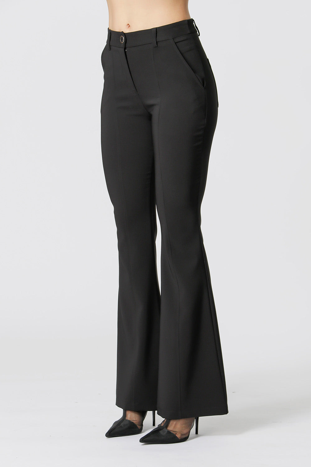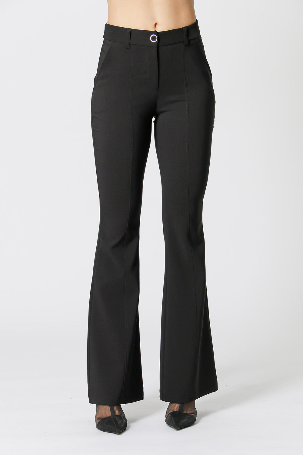 Pantalón acampanado con corte frontal y botón forrado en su propio tejido. Fabricado con tejido de sastrería. Una pieza imprescindible en tu armario para una mujer moderna que busca comodidad, para un estado de ánimo de trabajo.