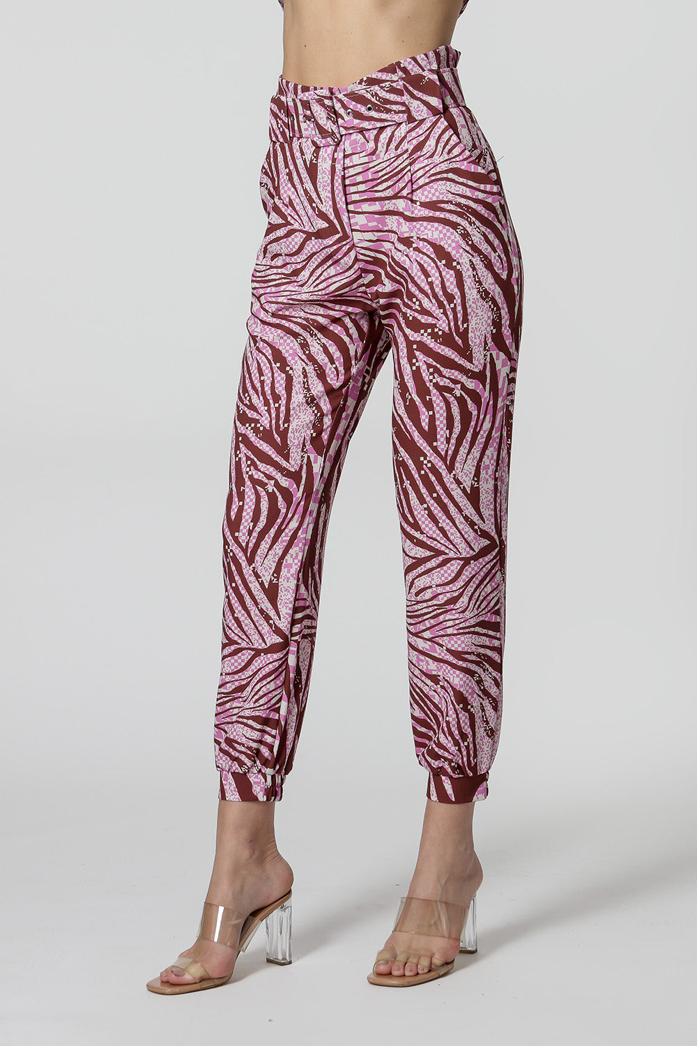 Pantalón jogger confeccionado en crepe estampado de sastrería. Tiene cinturón forrado y detalle elástico en el puño. Elegante pieza que realza la silueta femenina.