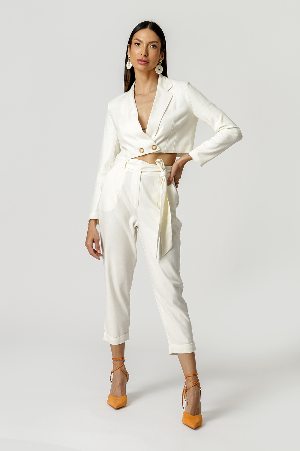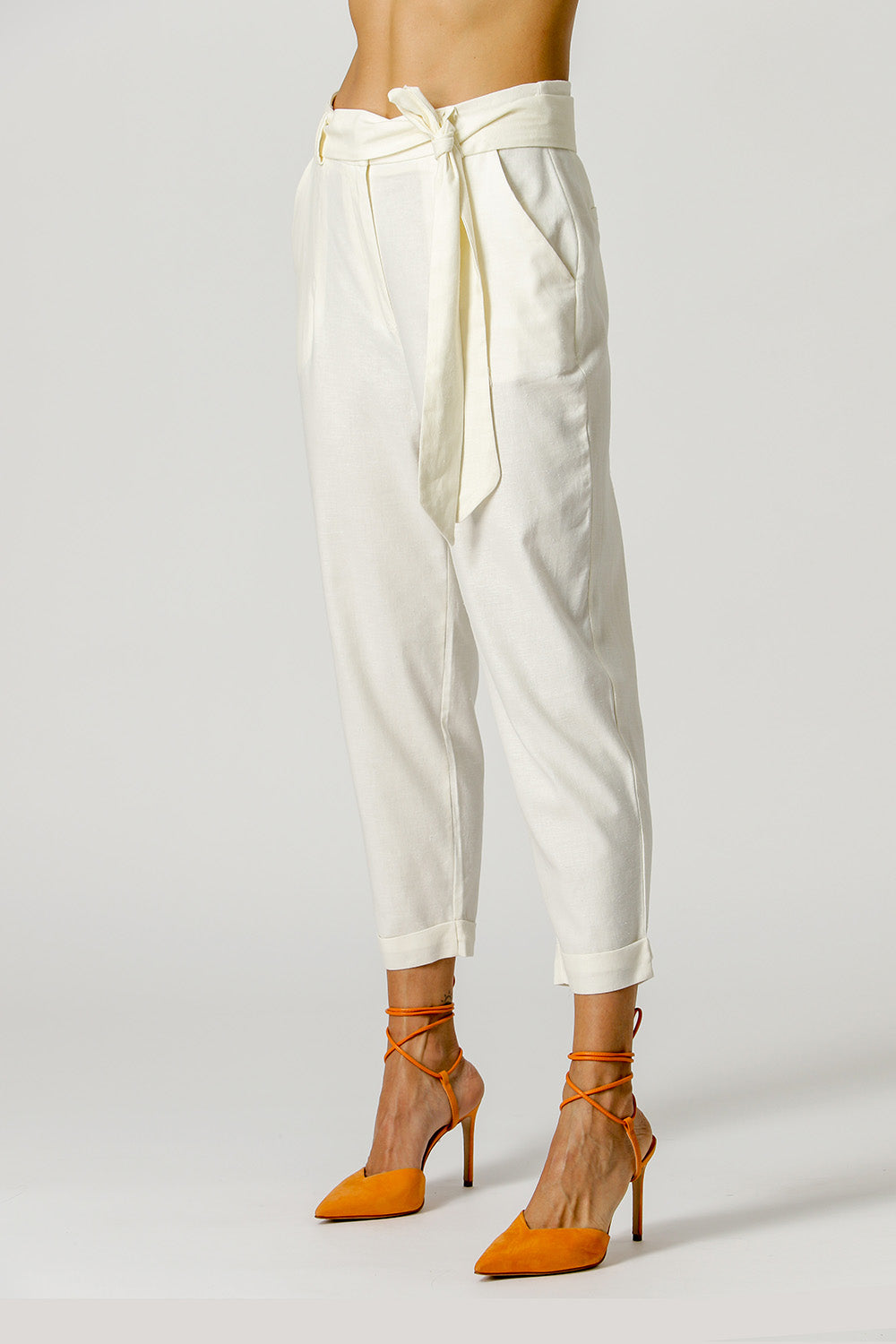 Calça com shape mais jogger com barra italiana, um shape prático e versátil para o dia a dia, confeccionado em linho de viscose, acompanha uma faixa de cinto.