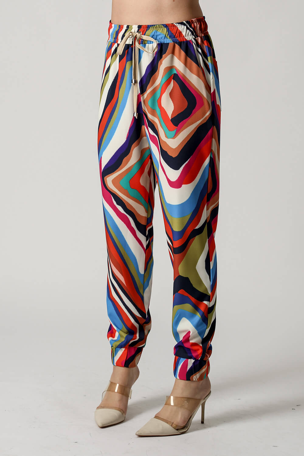 Calça de crepe estampado em silhueta jogging com elástico na cintura e na barra. Peça incrível para looks super trandy.