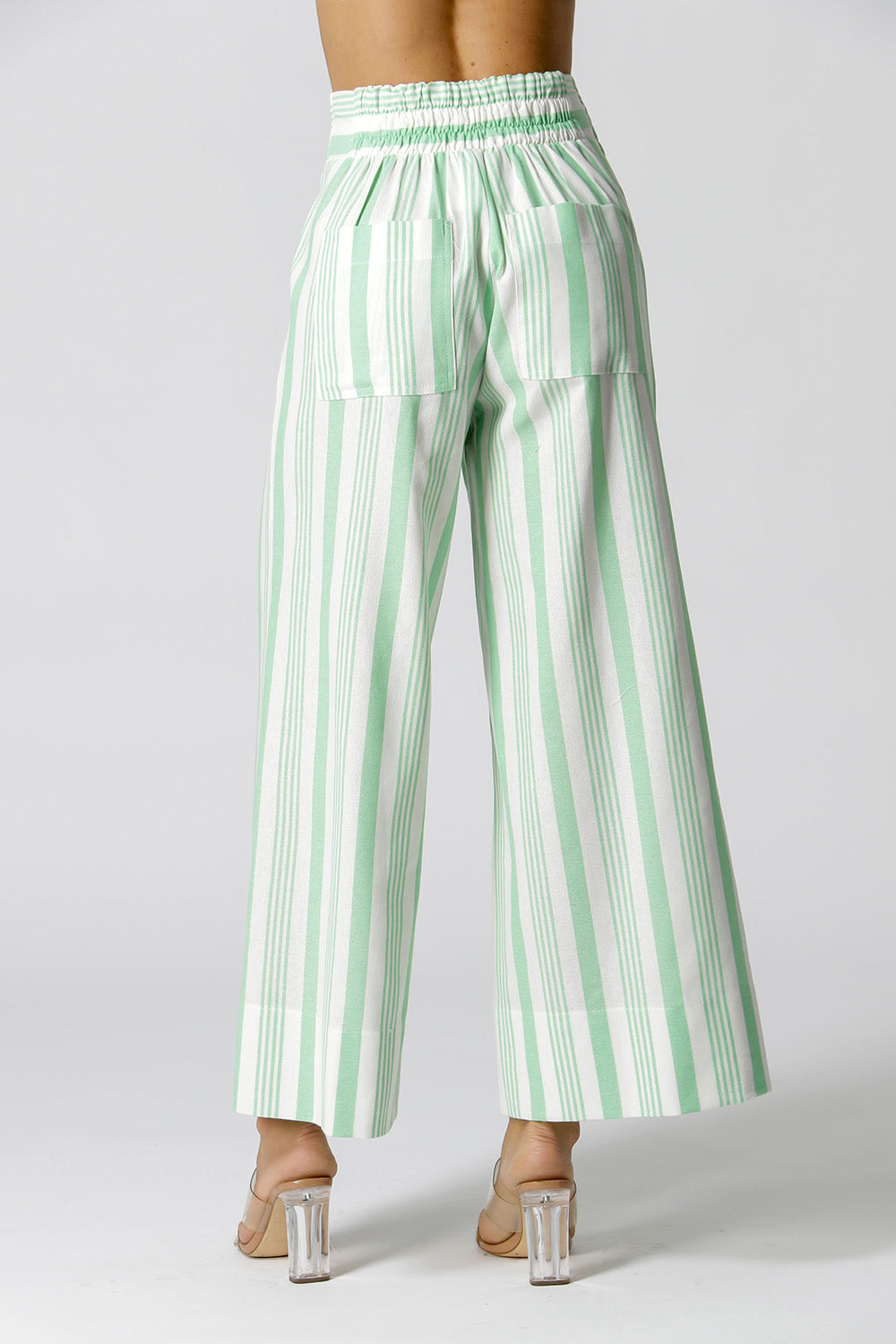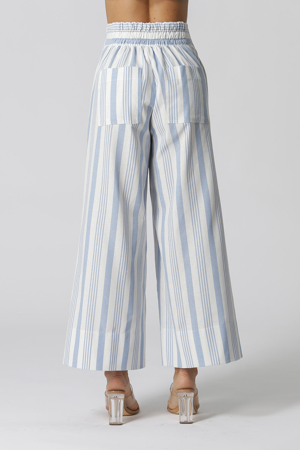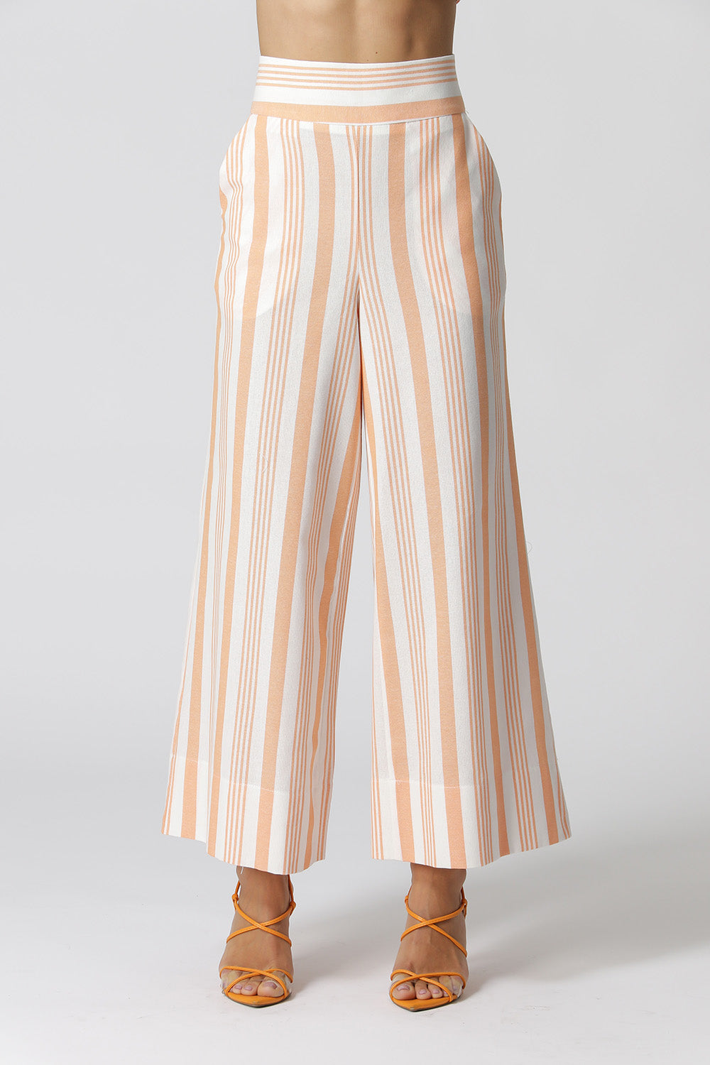 Calça curta com barra larga e elástico no cós atras. Peça confeccionada em tecido linho listrado. Uma Peça confortável e elegante ótima proposta para mood casual.