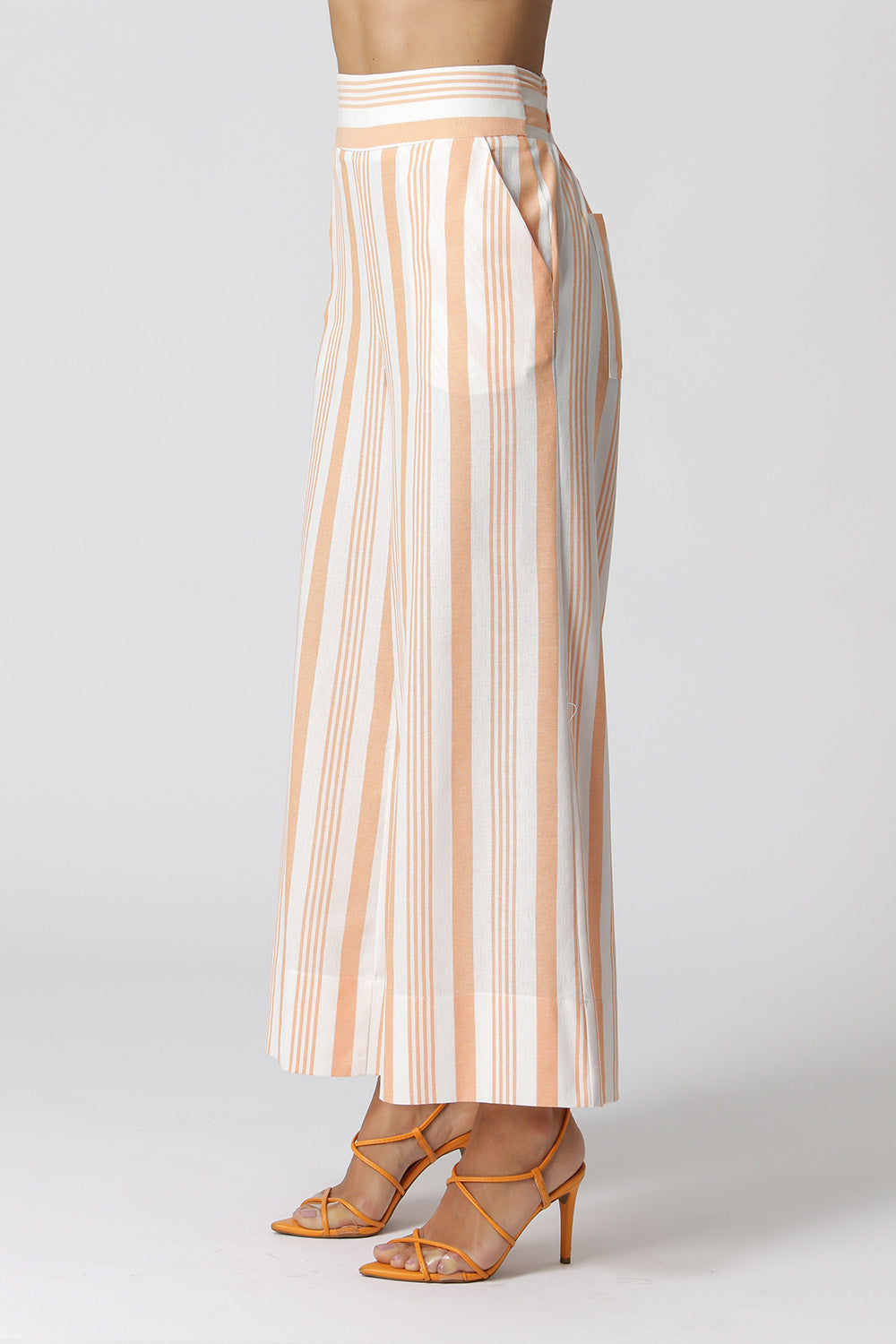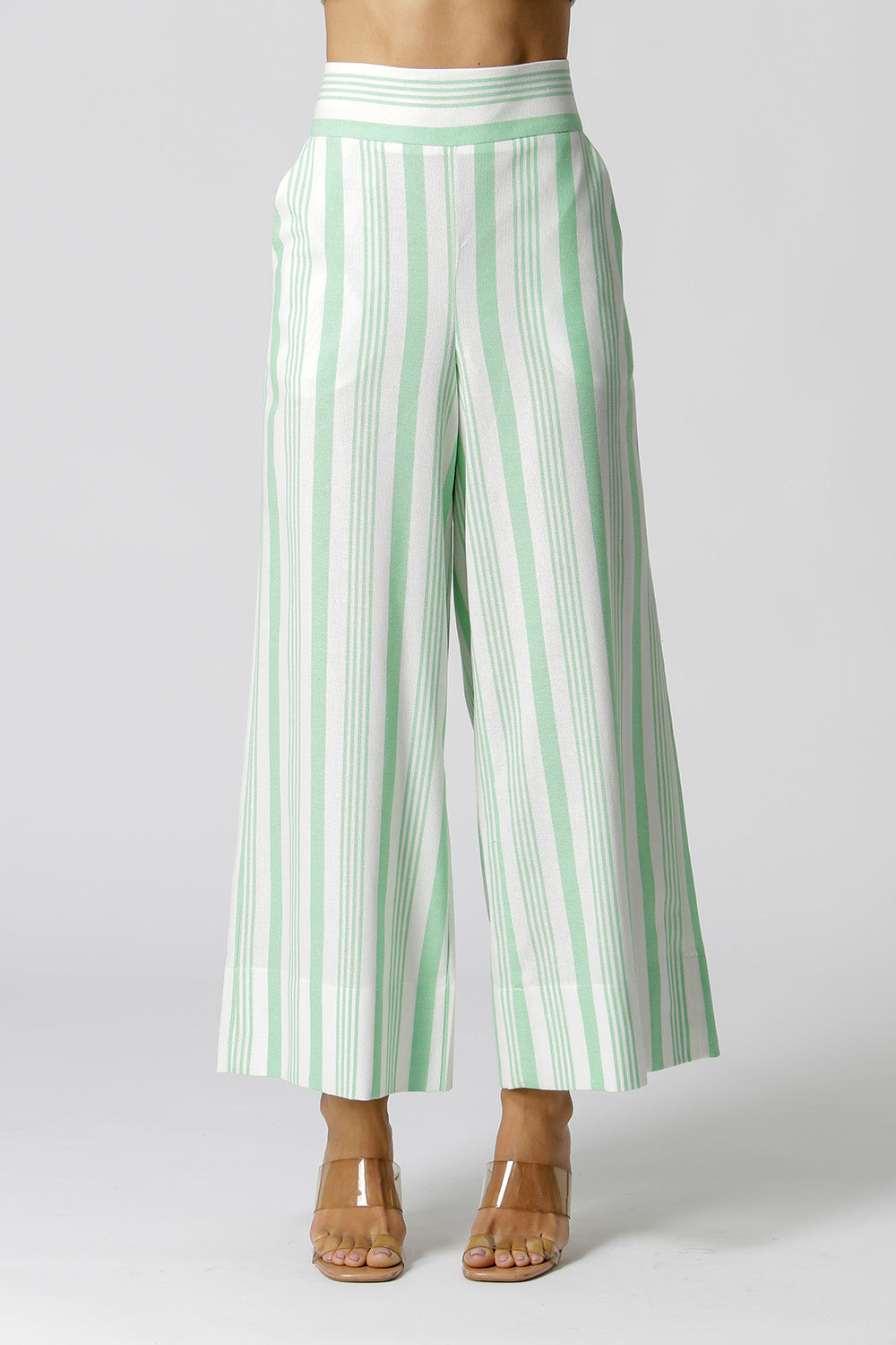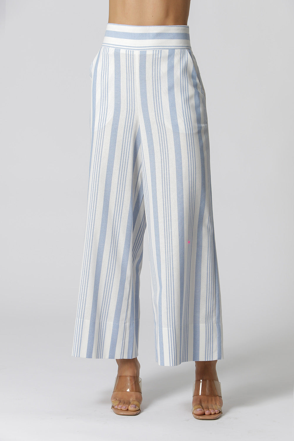 Calça curta com barra larga e elástico no cós atras. Peça confeccionada em tecido linho listrado. Uma Peça confortável e elegante ótima proposta para mood casual.