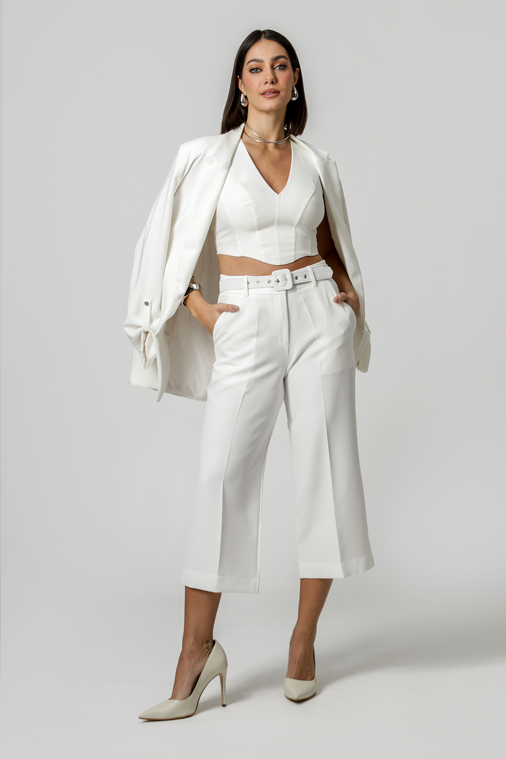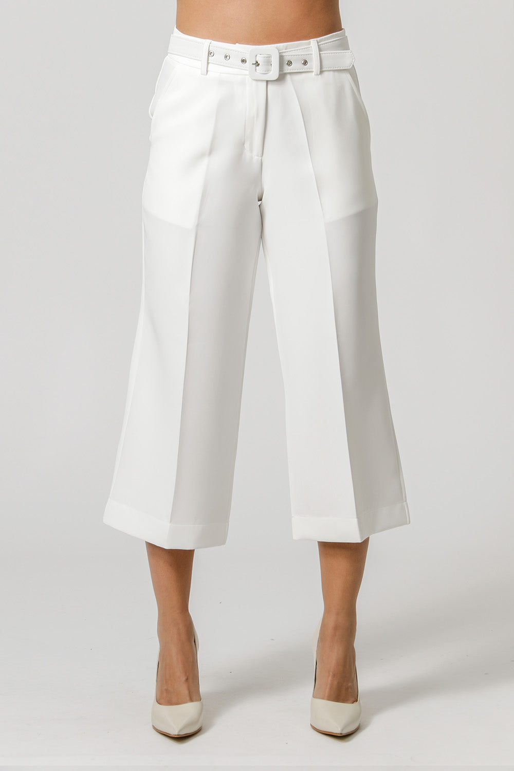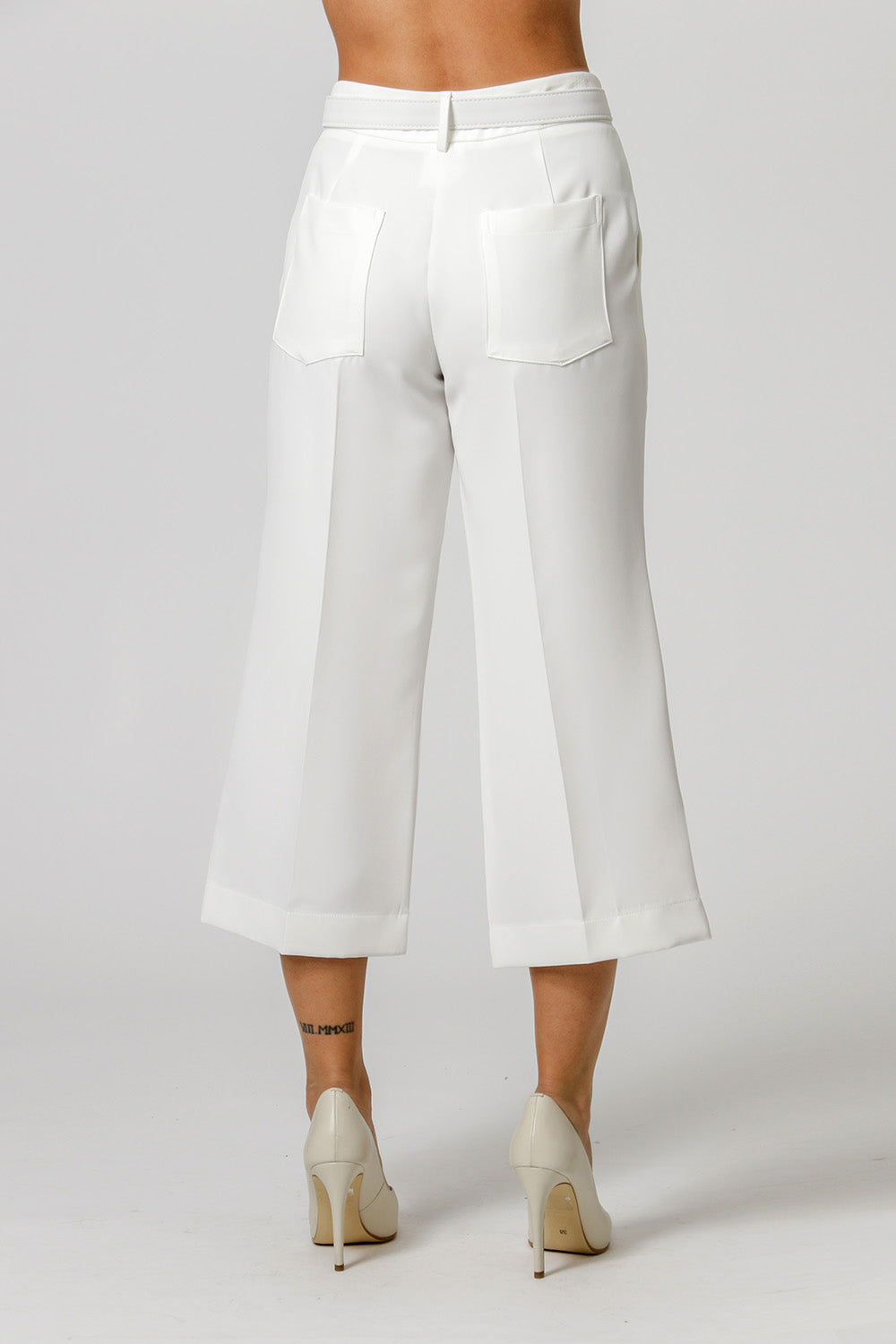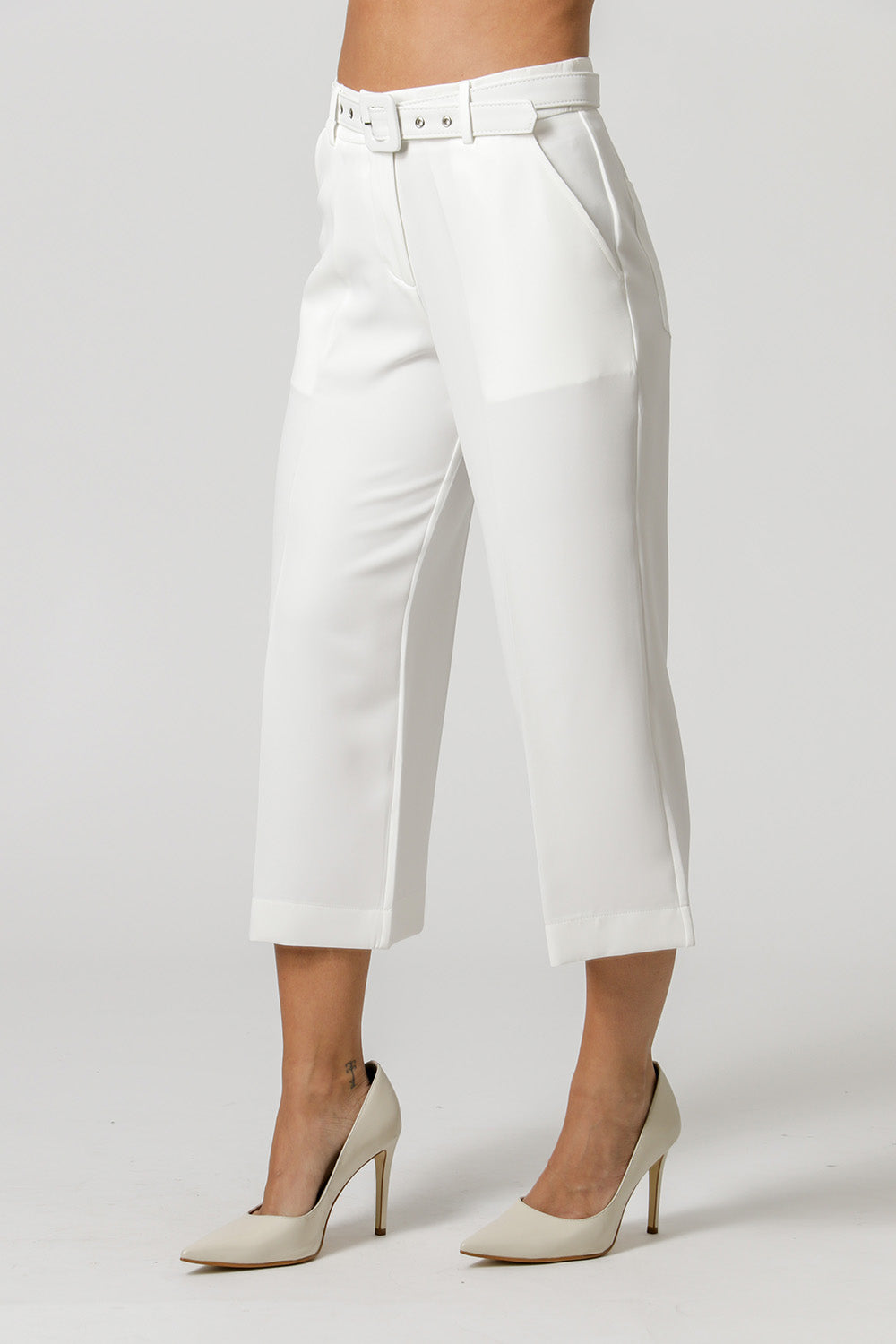 Pantalón pantacourt con cinturón sastre. Tiene un bolsillo inclinado y un corte recto, una pieza versátil para diferentes looks de trabajo.