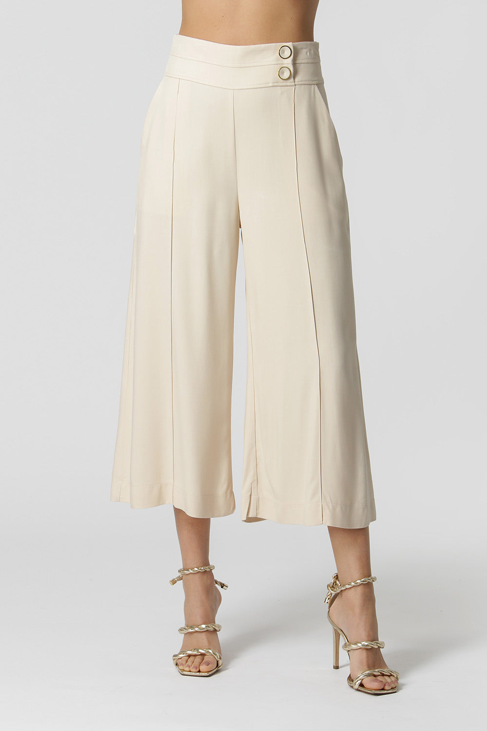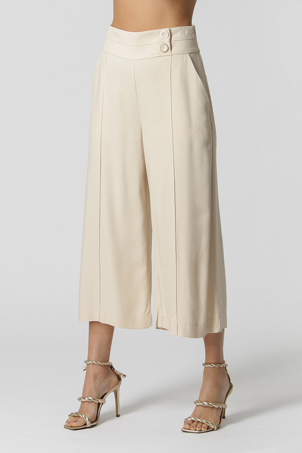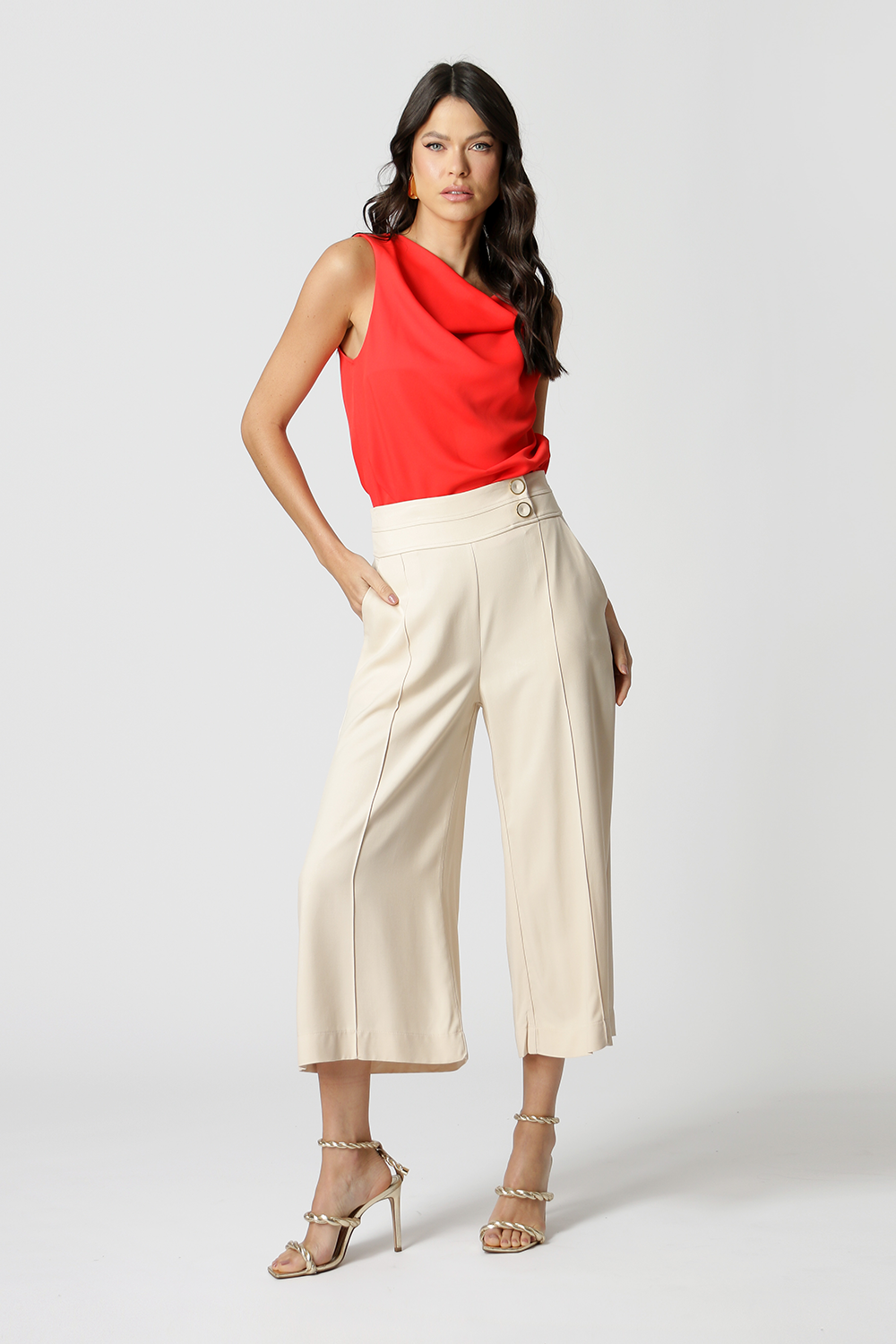Calça pantacourt confeccionada em viscose texturizada. Possui cós duplo com botões em detalhe de metal.