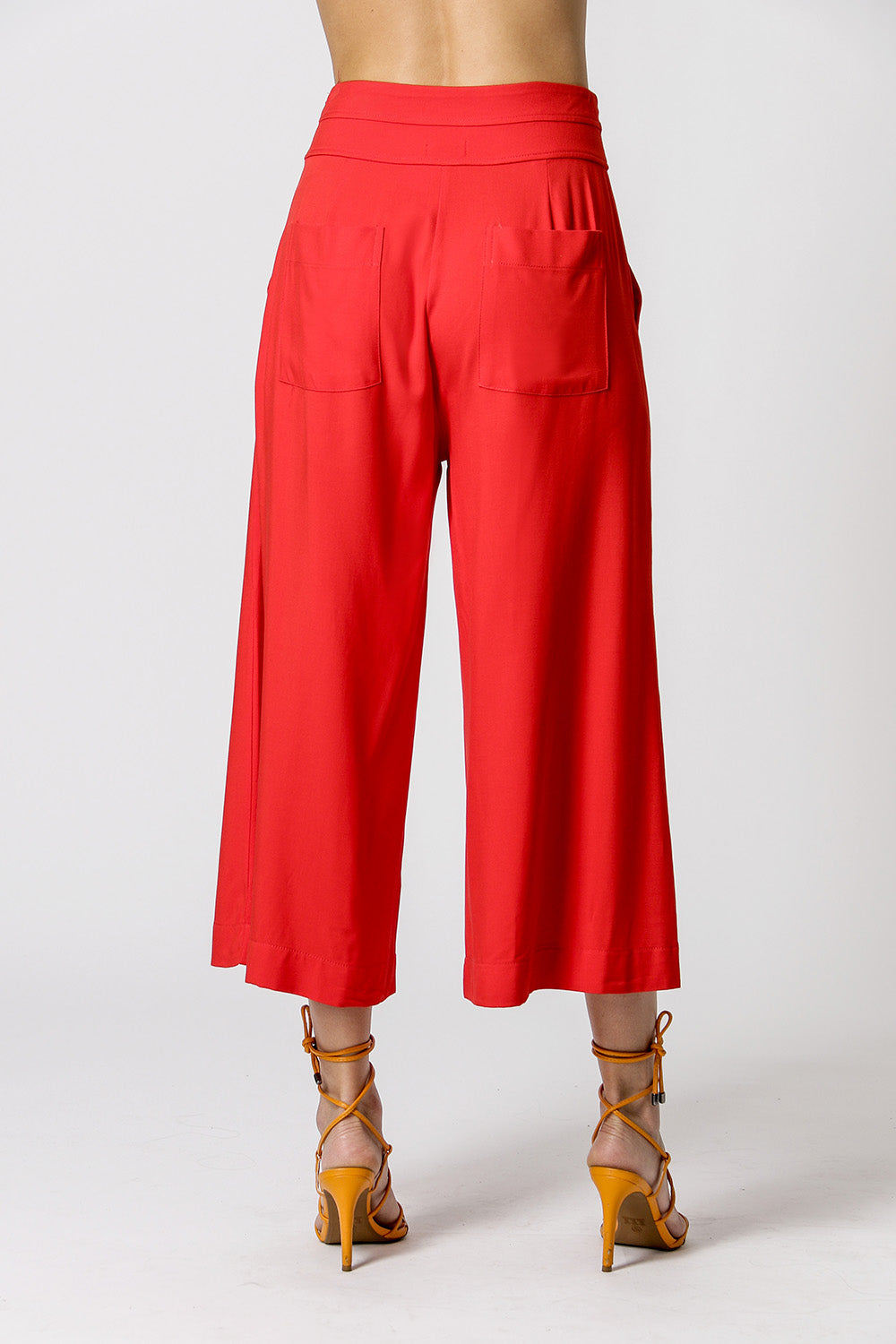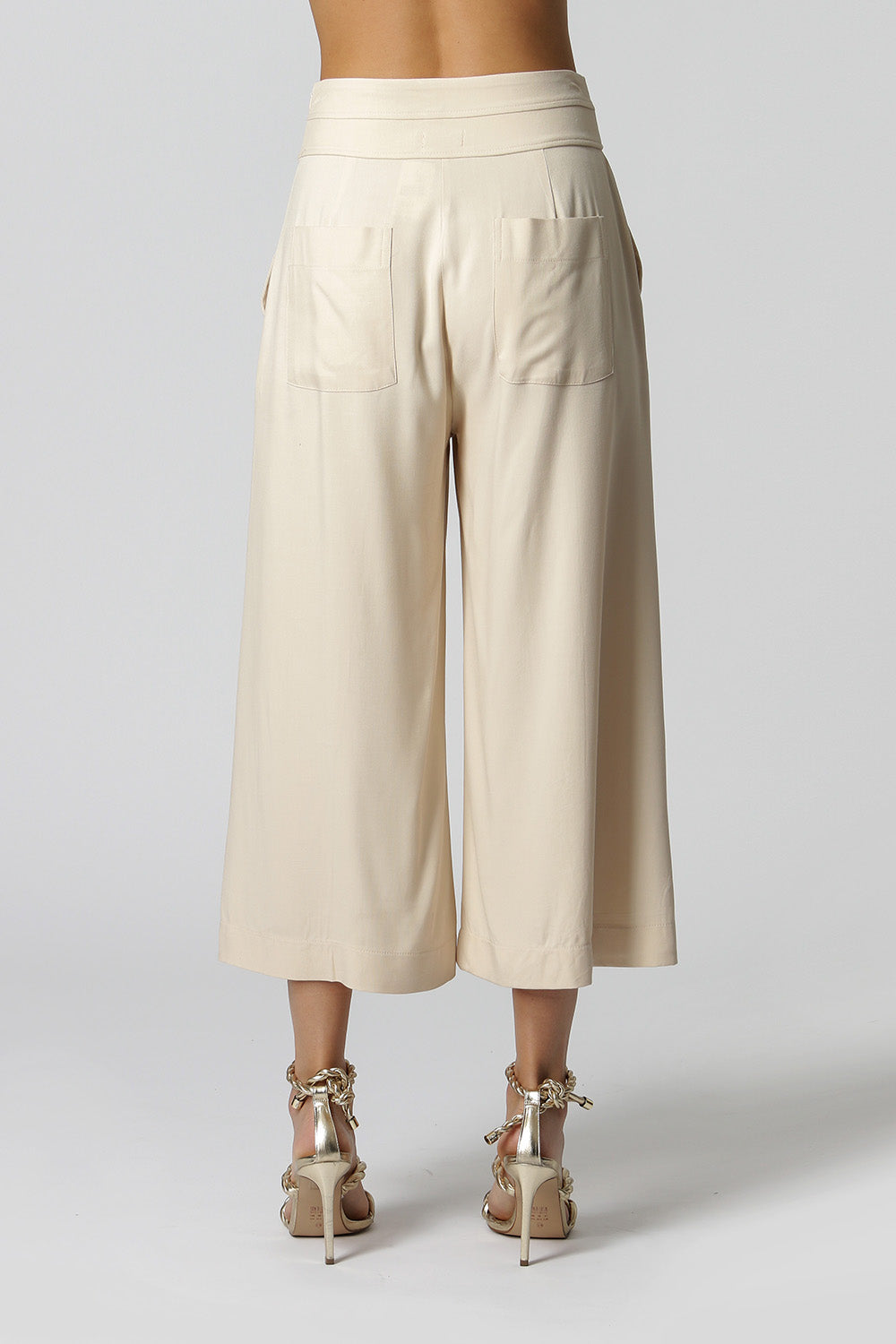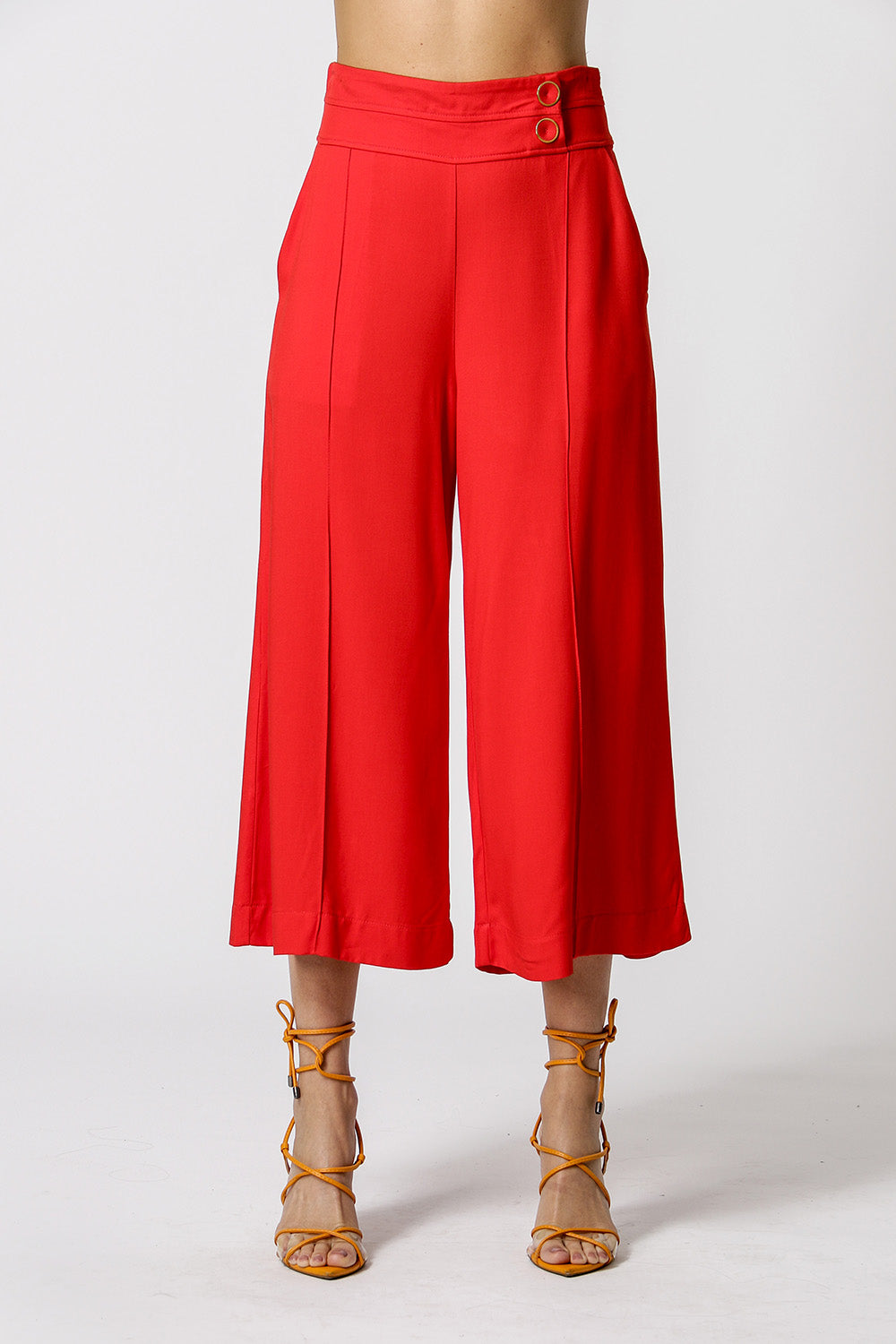 Calça pantacourt confeccionada em viscose texturizada. Possui cós duplo com botões em detalhe de metal.
