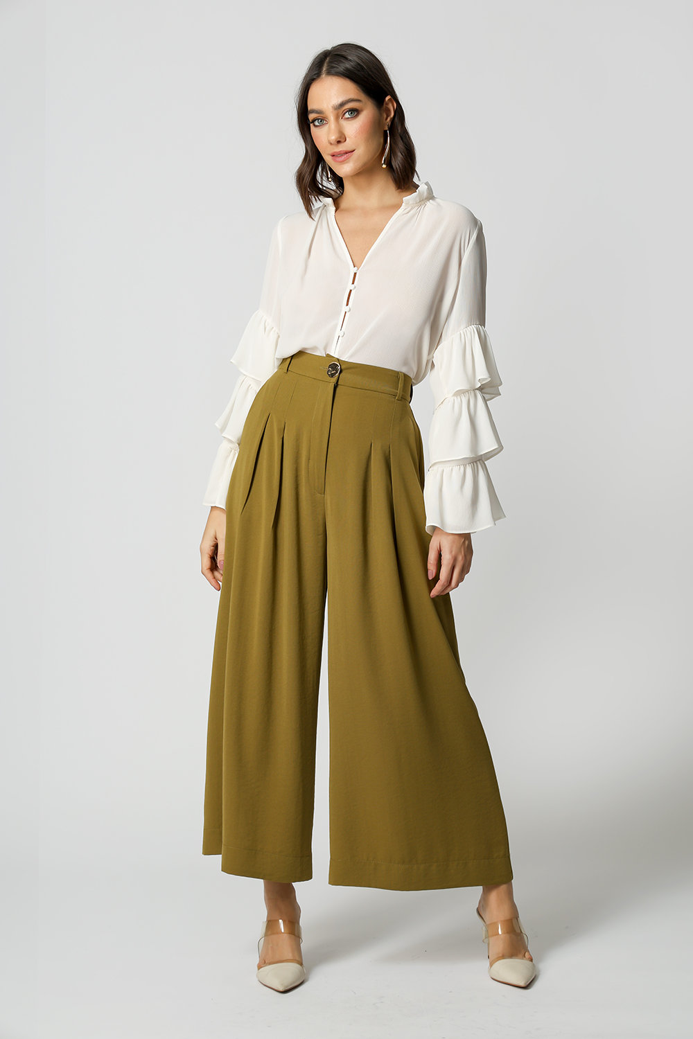 Possui bolsos laterais com botão dourado e pregas frontais