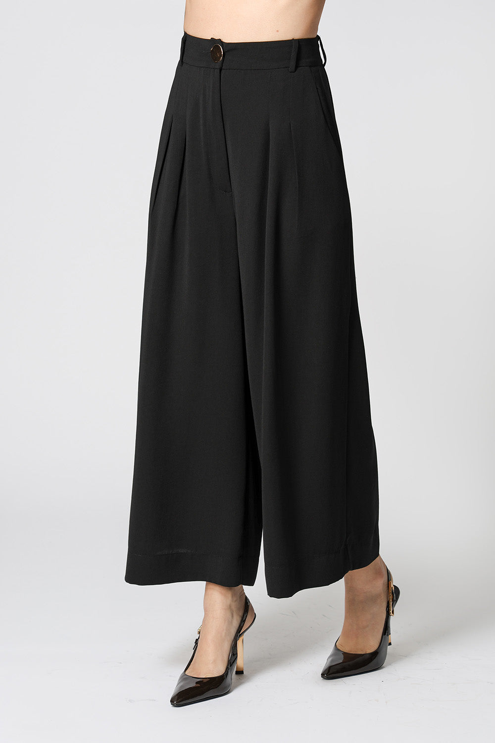 Tiene bolsillos laterales con botones dorados y pliegues delanteros.