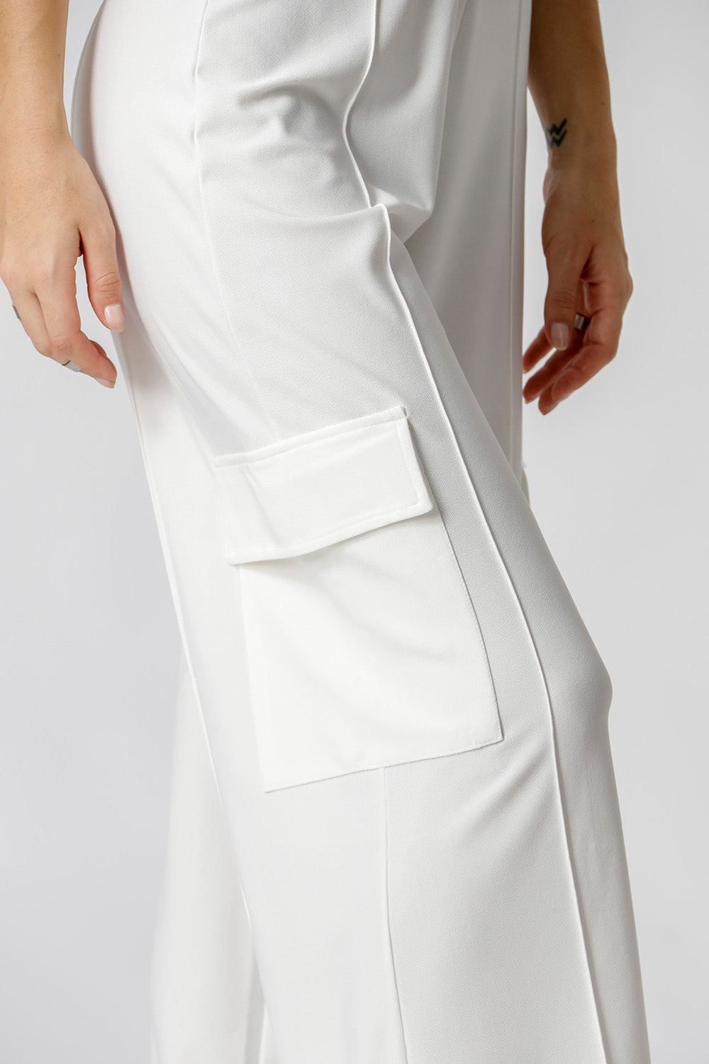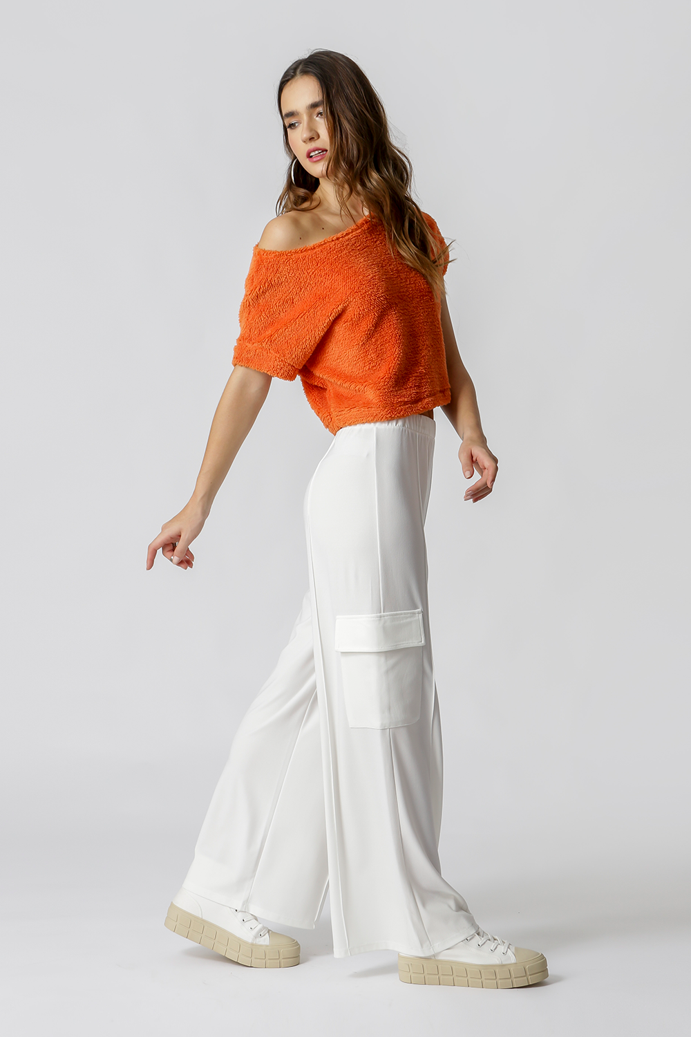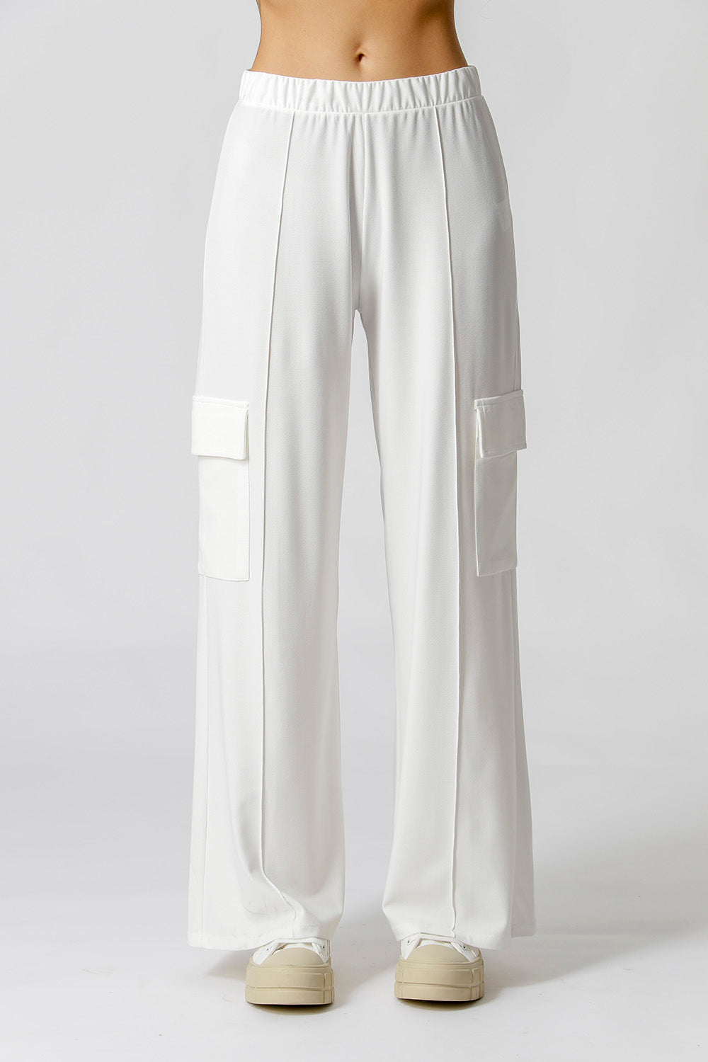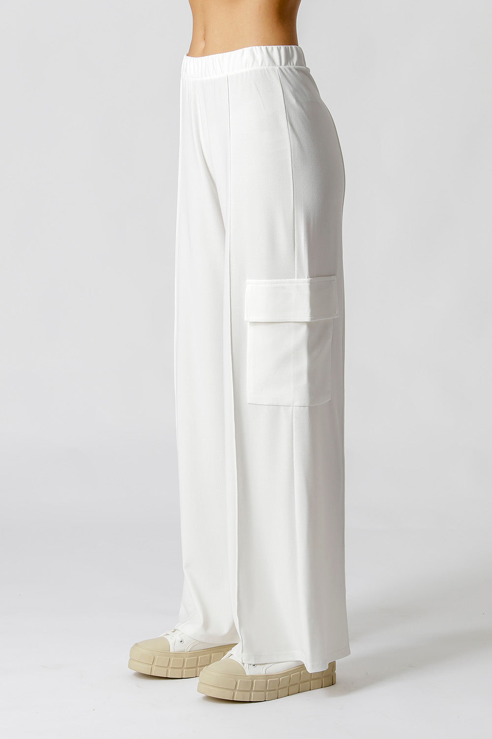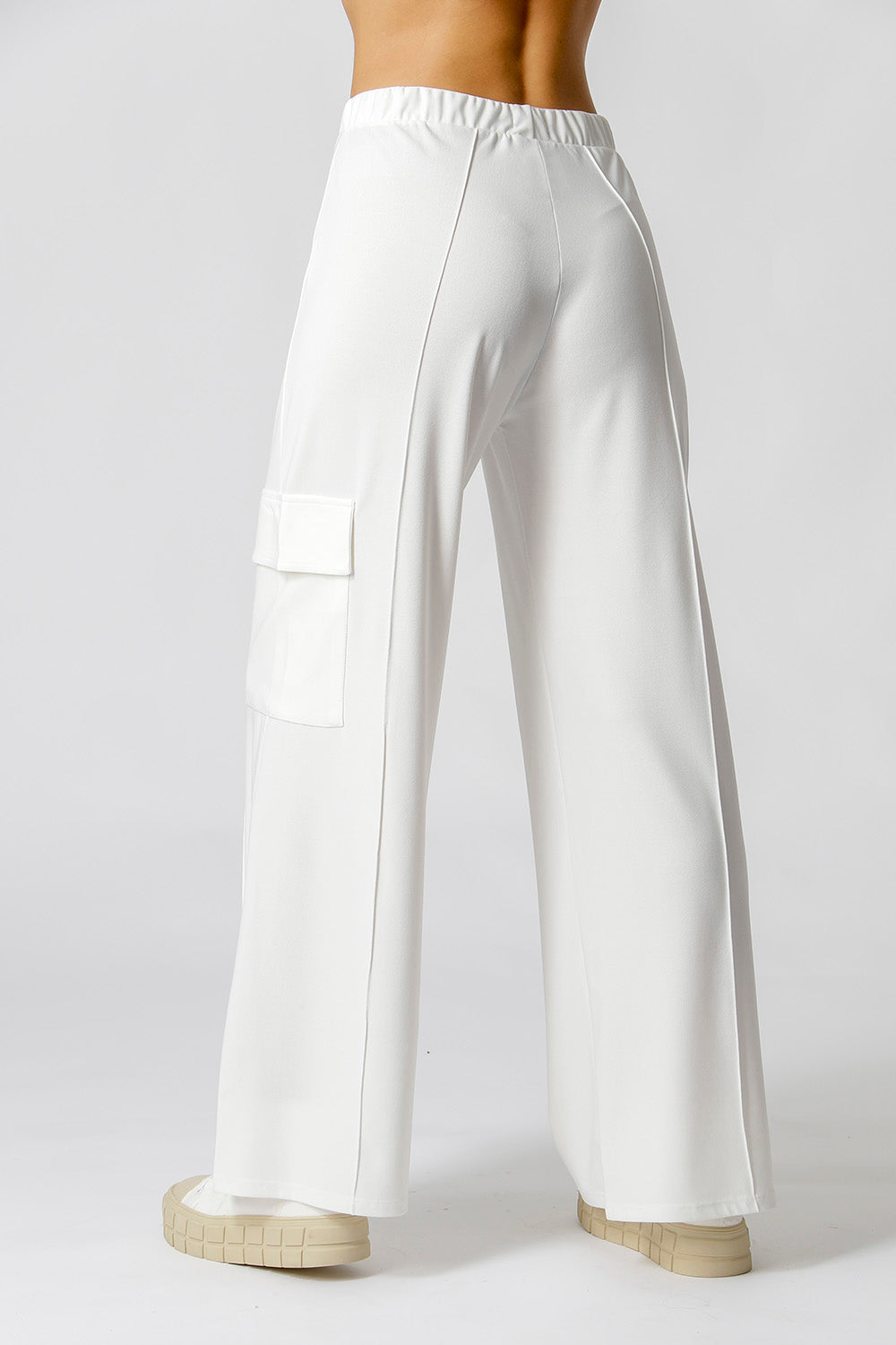 Pantalón palazzo con cinturilla elástica y detalle de bolsillos laterales. Realizado en tejido crepe. Una pieza versátil y cómoda para crear un look casual y con estilo.