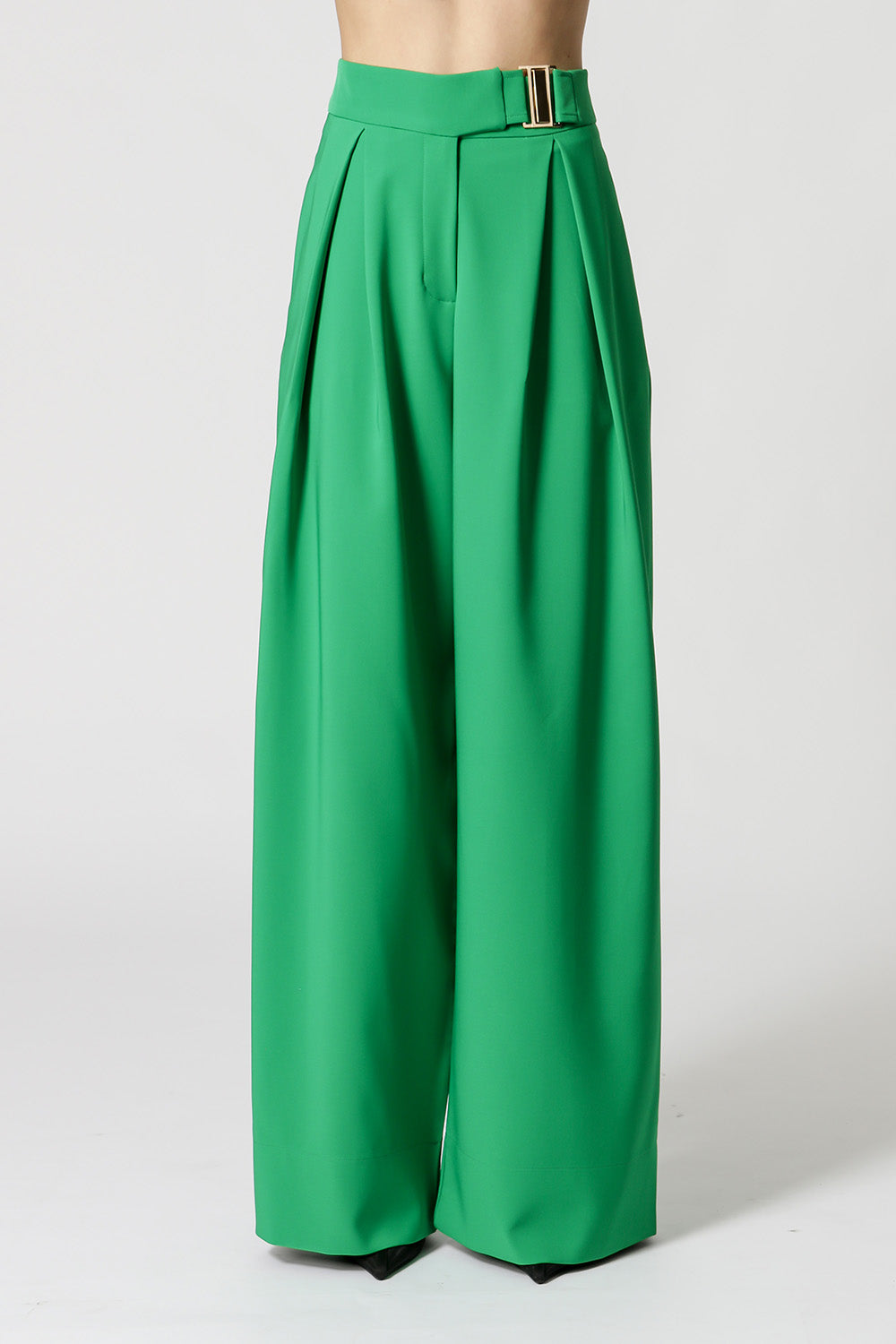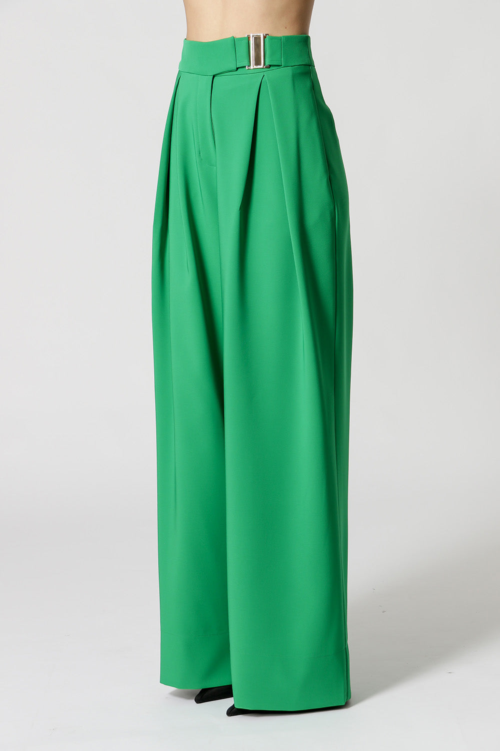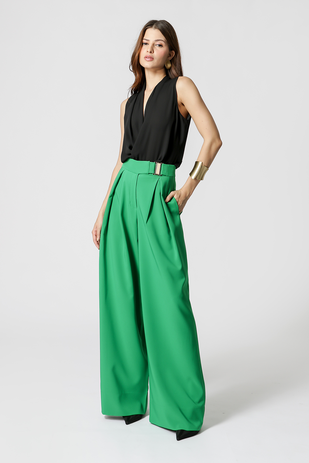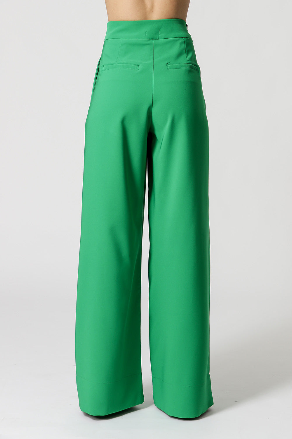 Pantalón palazzo con bolsillos delanteros y traseros, botón interior y hebilla metálica. Una pieza confeccionada con tejido a medida. Un modelo muy solicitado, ya que tiene la elegancia y comodidad para un ambiente de trabajo.