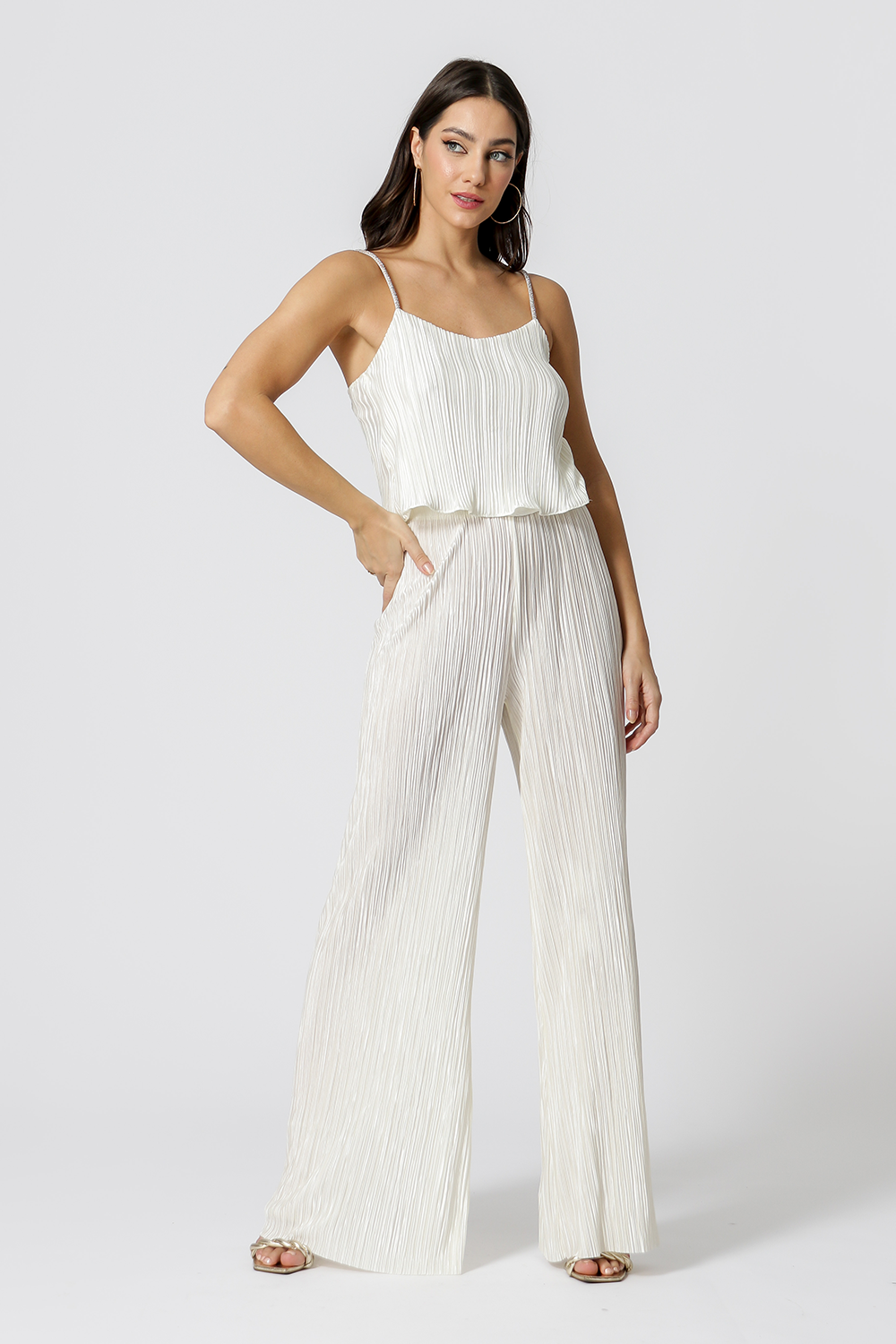 Pantalón palazzo ligeramente plisado, acompañado de short de malla con forma de hot pants. Una pieza con cinturilla elástica, mantiene la comodidad sin perder su encanto.