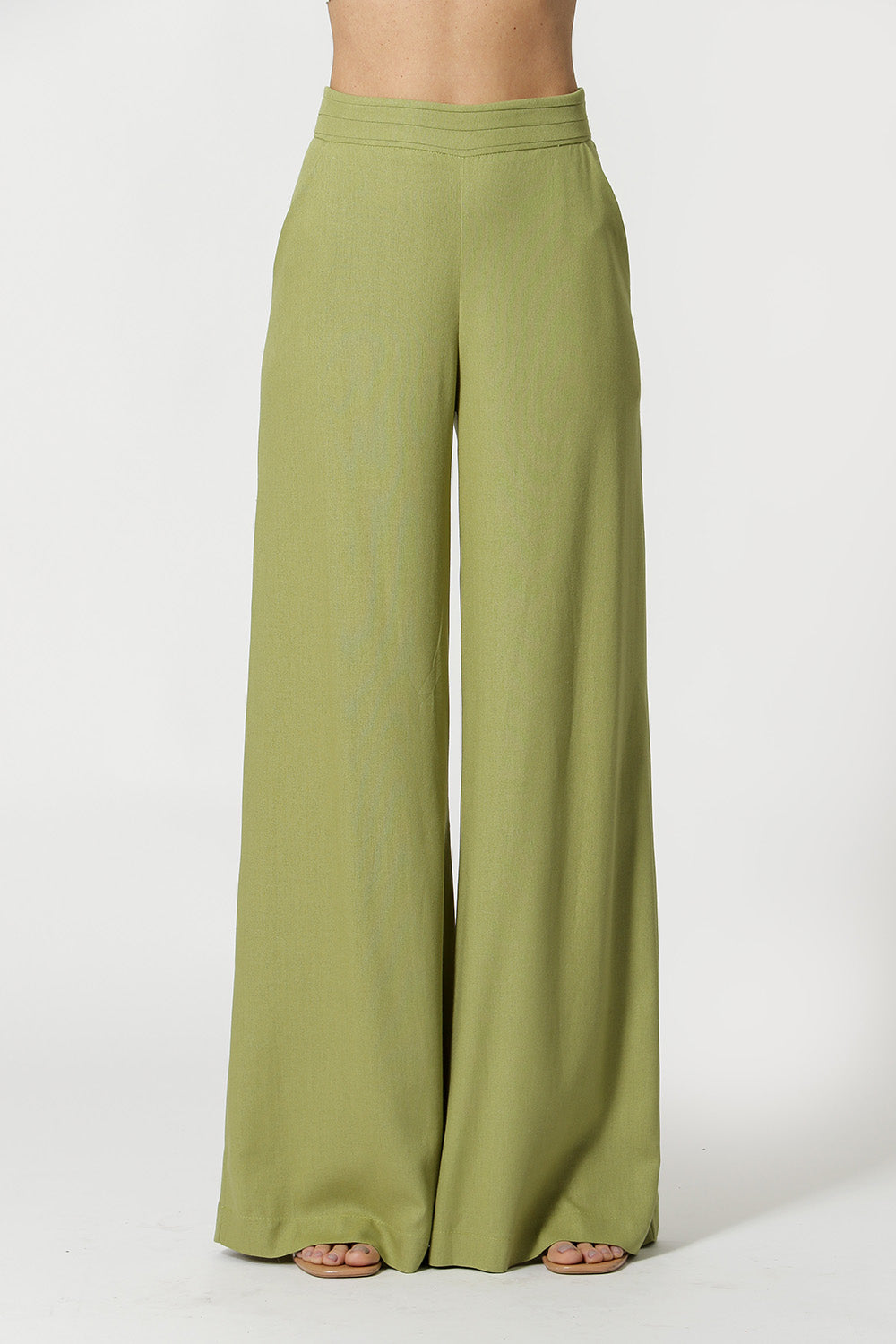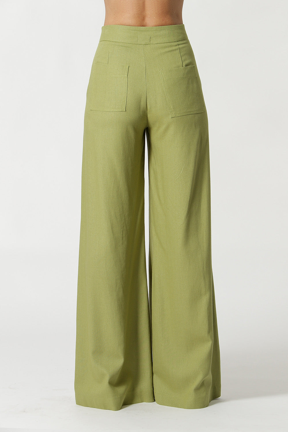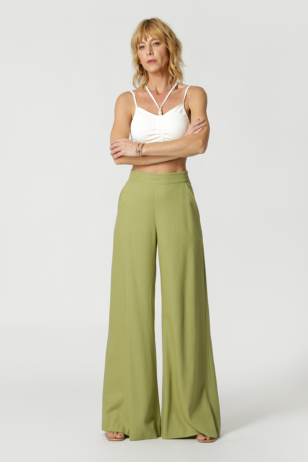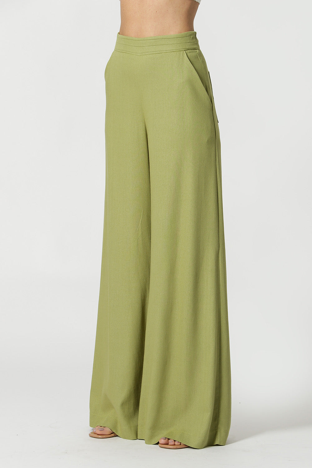 Pantalón palazzo con detalle plisado en la cinturilla, bolsillo inclinado, cremallera invisible en el lateral y pinza en la espalda. Modelo confeccionado en lino fresco, ideal para un look casual chic.