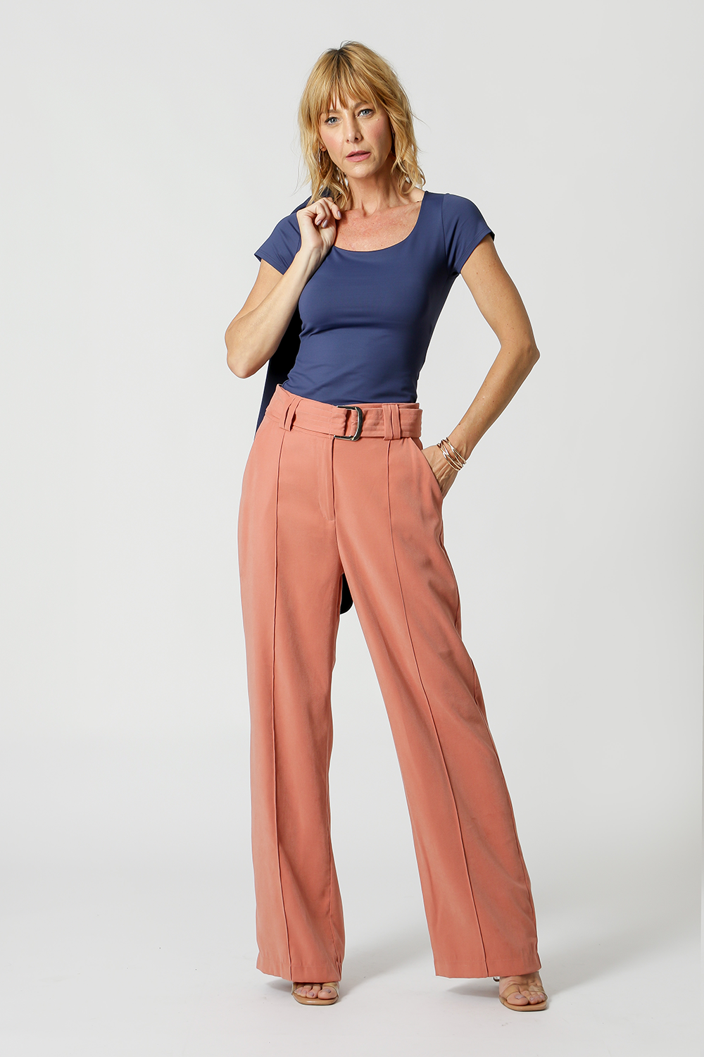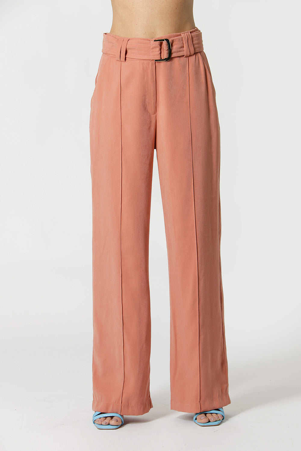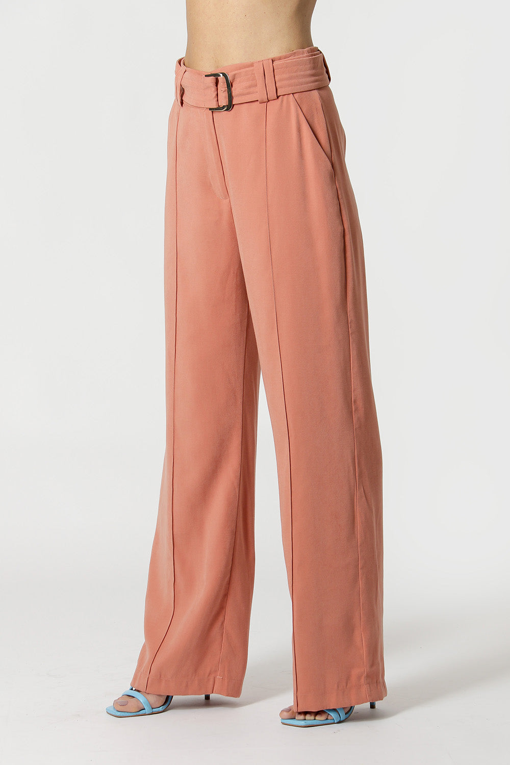 Pantalón recto confeccionado en viscosa, con detalle de canalé. Tiene una banda con hebilla de metal. Una pieza que le dará un aire casual chic a tu look.