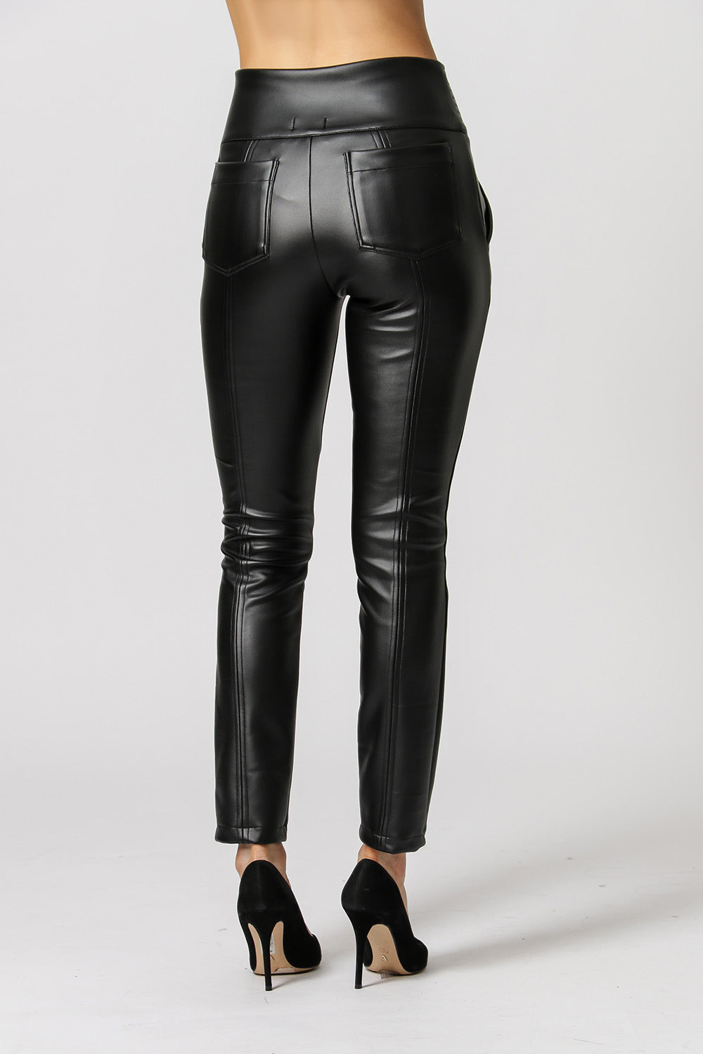 Pantalón Skynny fabricado en neopreno recubierto de resina. Detalle de cinturilla ancha cosida y recortes. Tiene una cremallera en el lateral. Pieza casual, ideal para un look de noche.