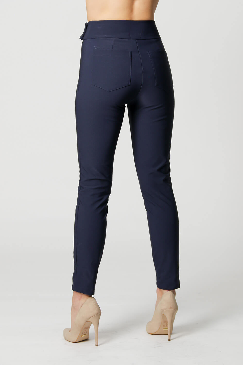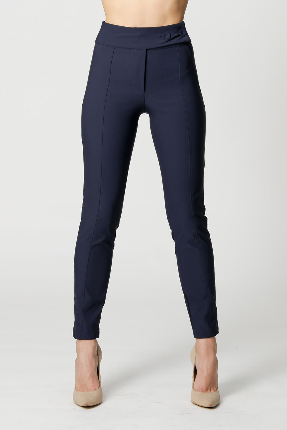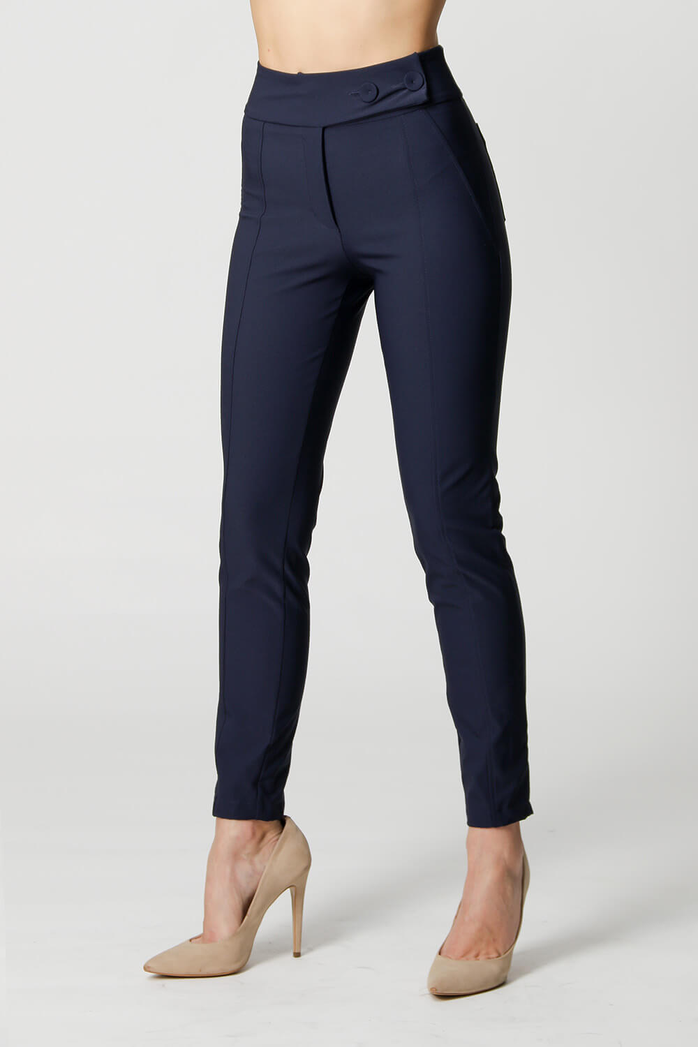 Pantalón pitillo con cinturilla ancha y botones forrados en el propio tejido. Pieza confeccionada en sastrería de algodón. Ideal para realzar la silueta femenina.