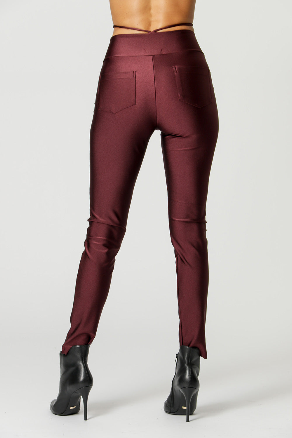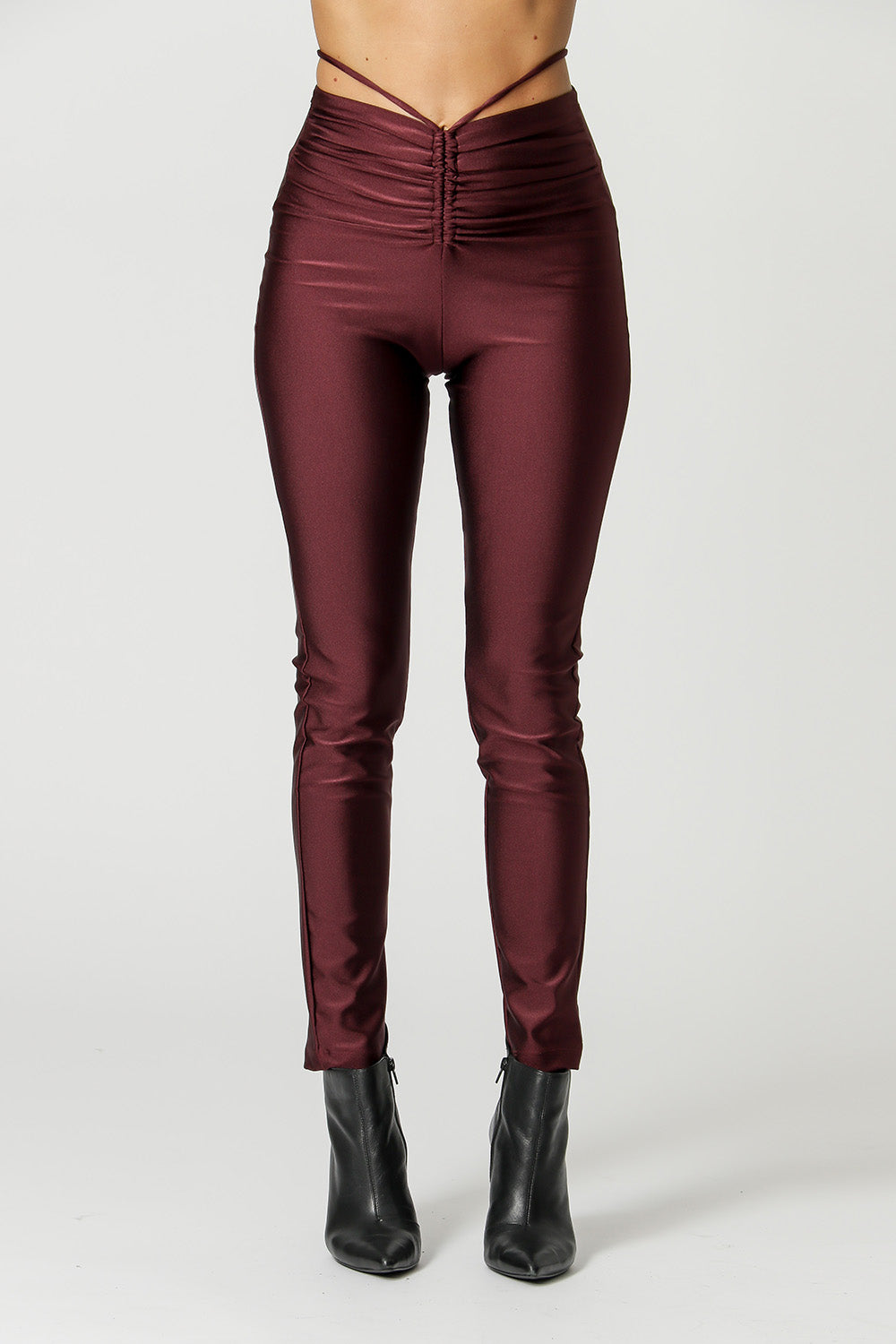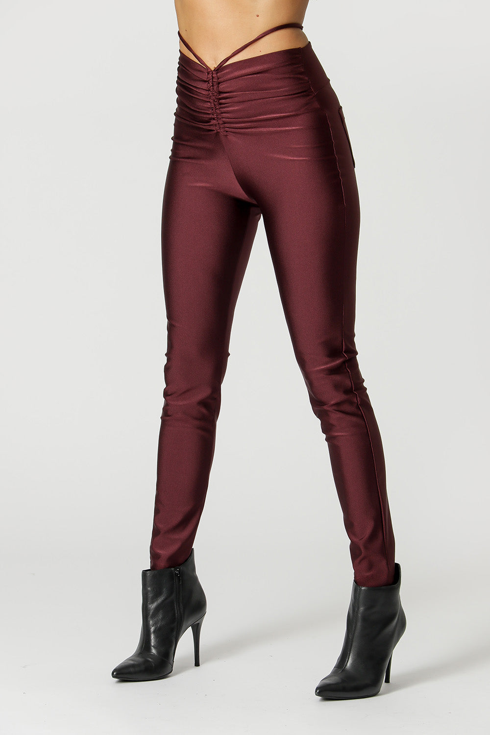 Pantalón de corte ajustado al cuerpo, confeccionado en tejido de punto fuerte y con detalle fruncido con lazo en la cintura. ¡Una pieza atrevida que le dará un toque especial a tu look de noche!
