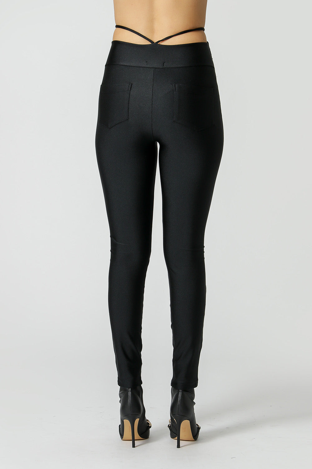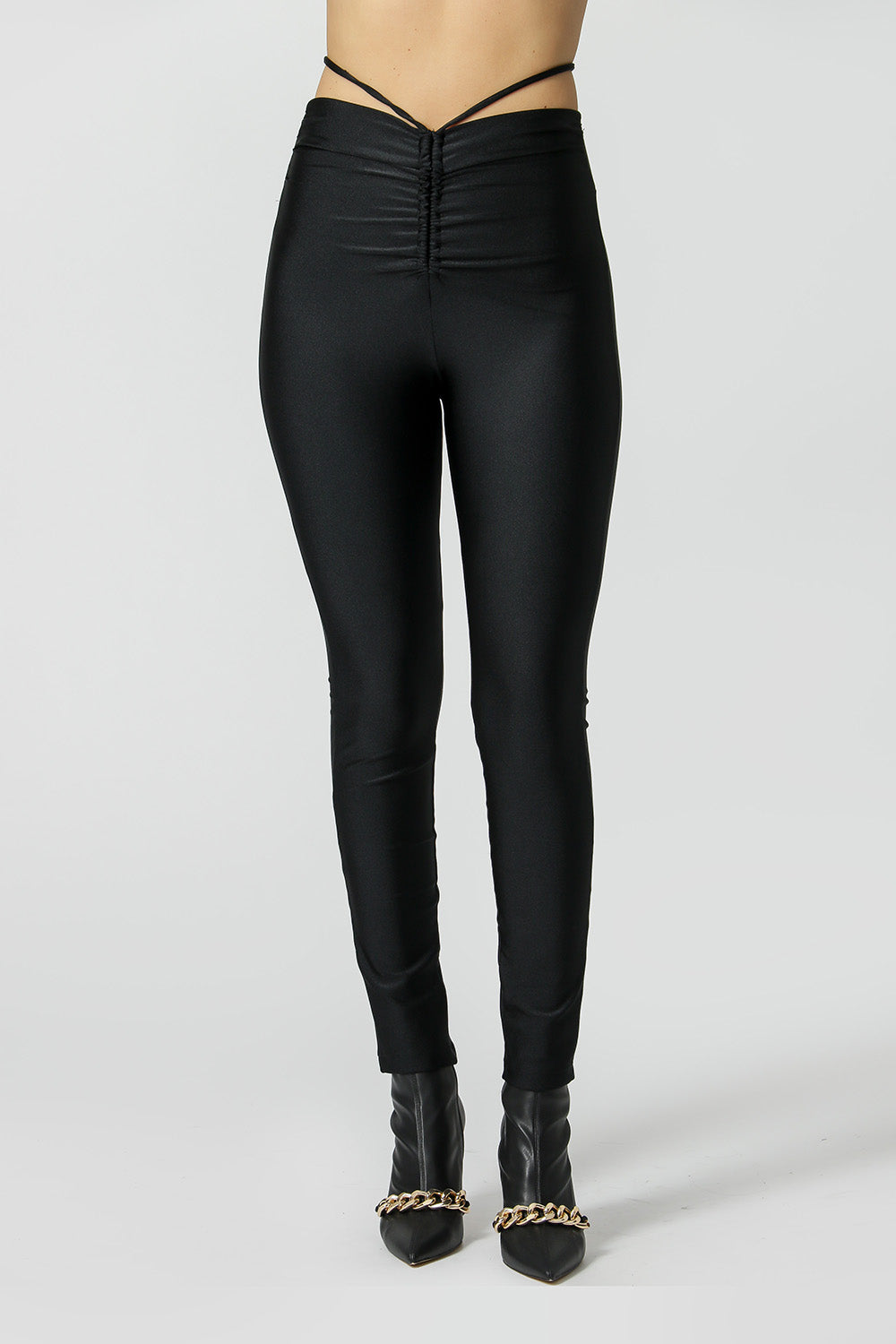 Pantalón de corte ajustado al cuerpo, confeccionado en tejido de punto fuerte y con detalle fruncido con lazo en la cintura. ¡Una pieza atrevida que le dará un toque especial a tu look de noche!