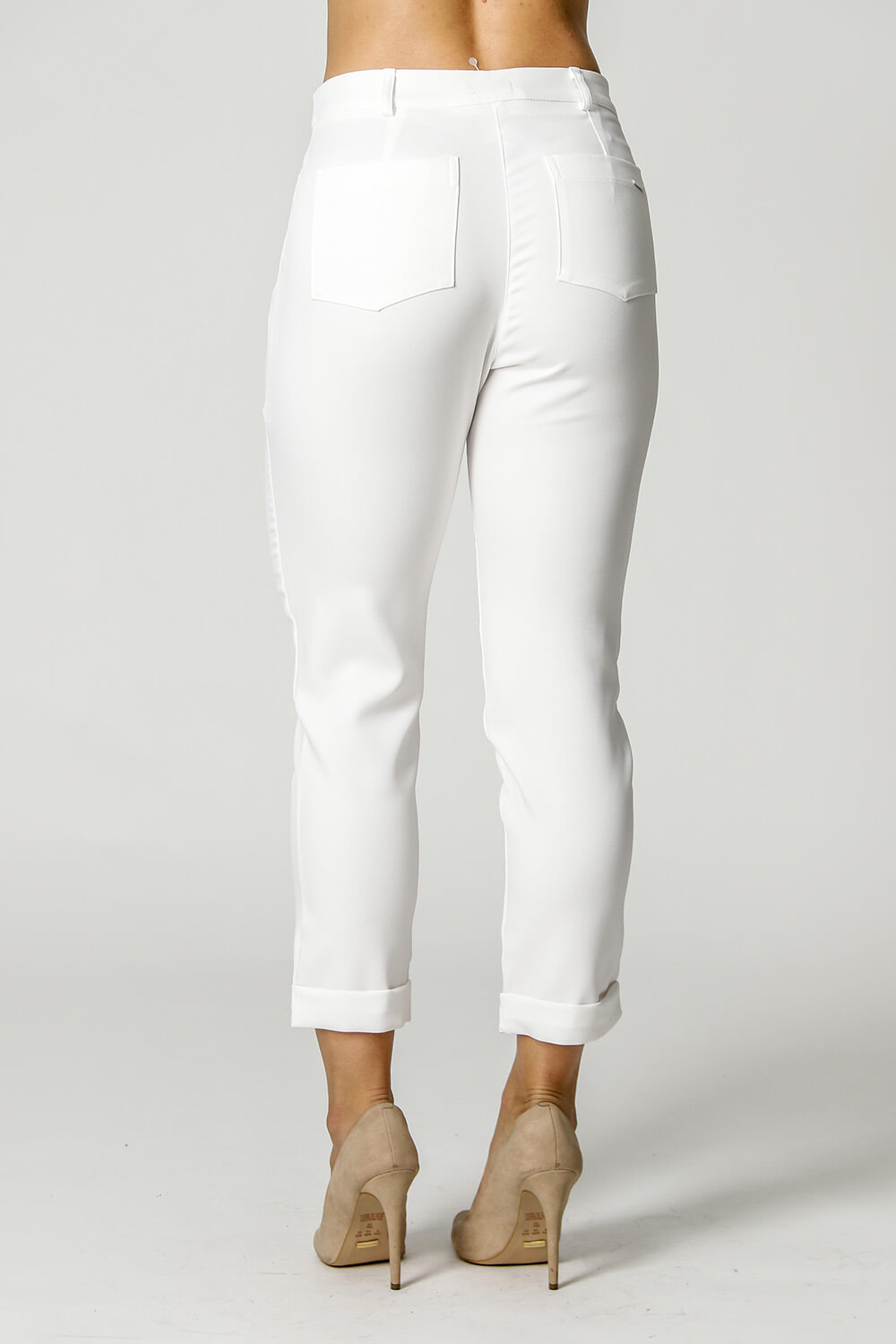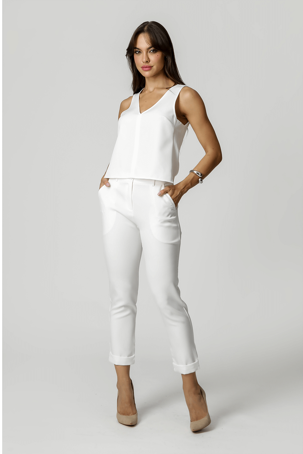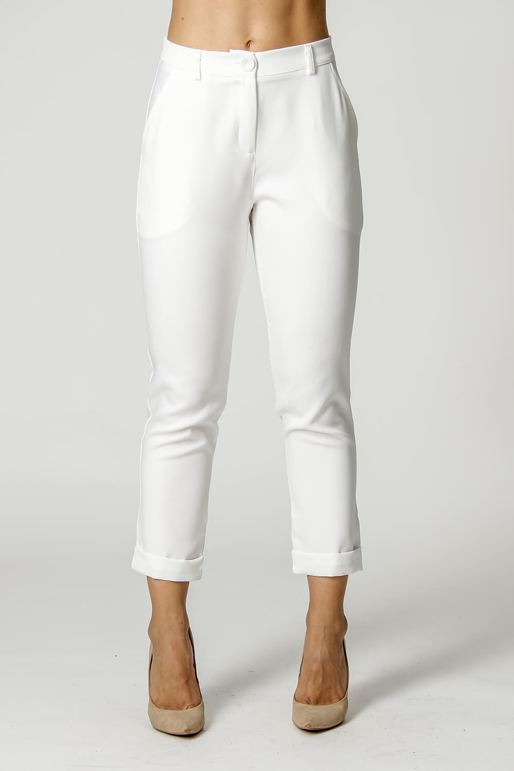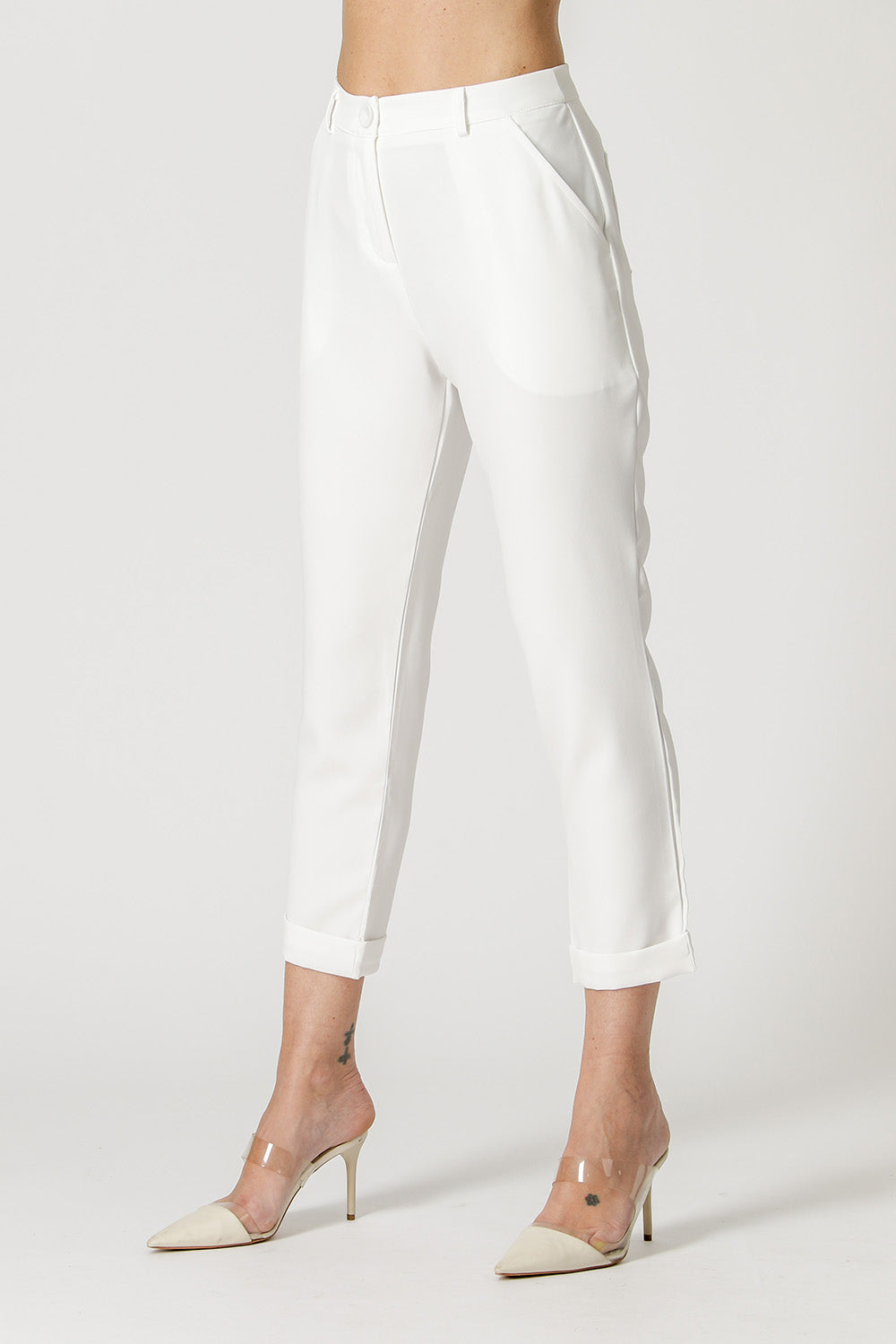 Pantalón entallado con apertura de cremallera y botón, bolsillo lateral y trabillas para cinturón. Pieza ideal para looks laborales y cotidianos.
