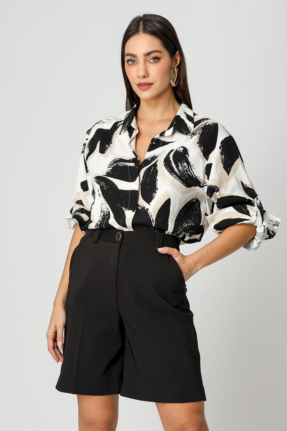 Camisa ampla e botões. Modelo confeccionado em tecido Linho estampado. Uma peça ampla, confortável e otima proposta para looks casual.