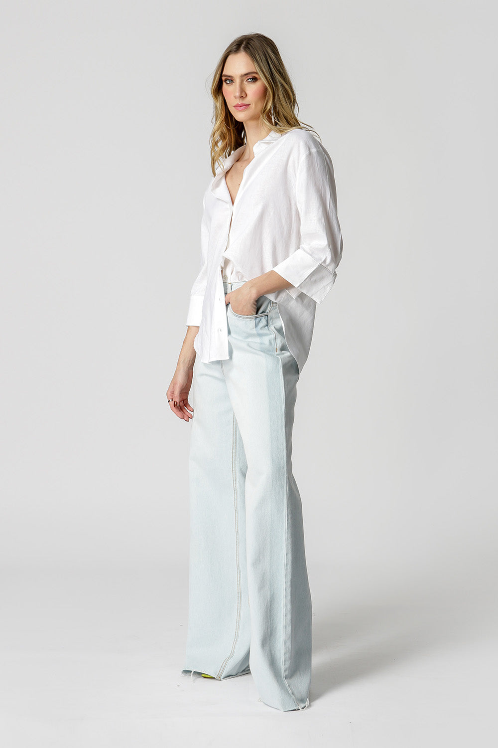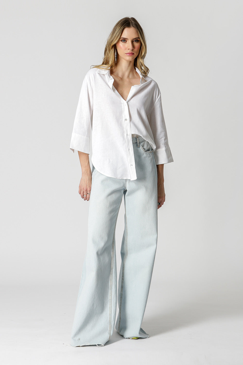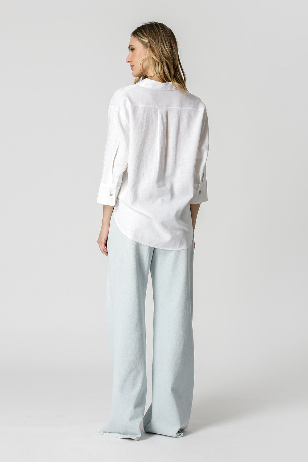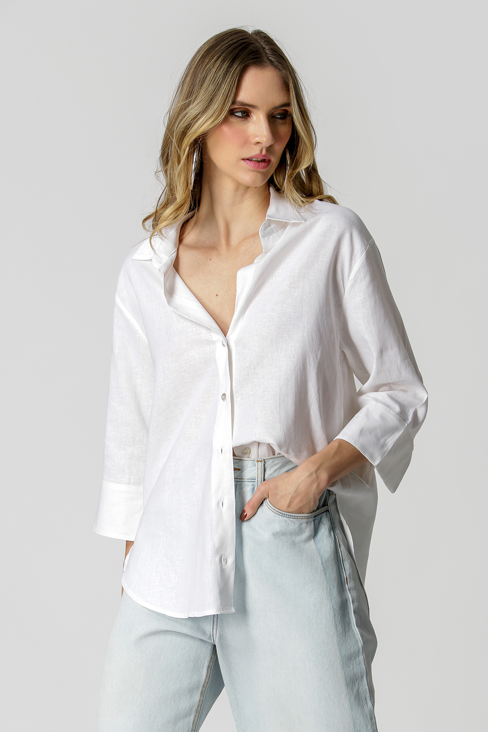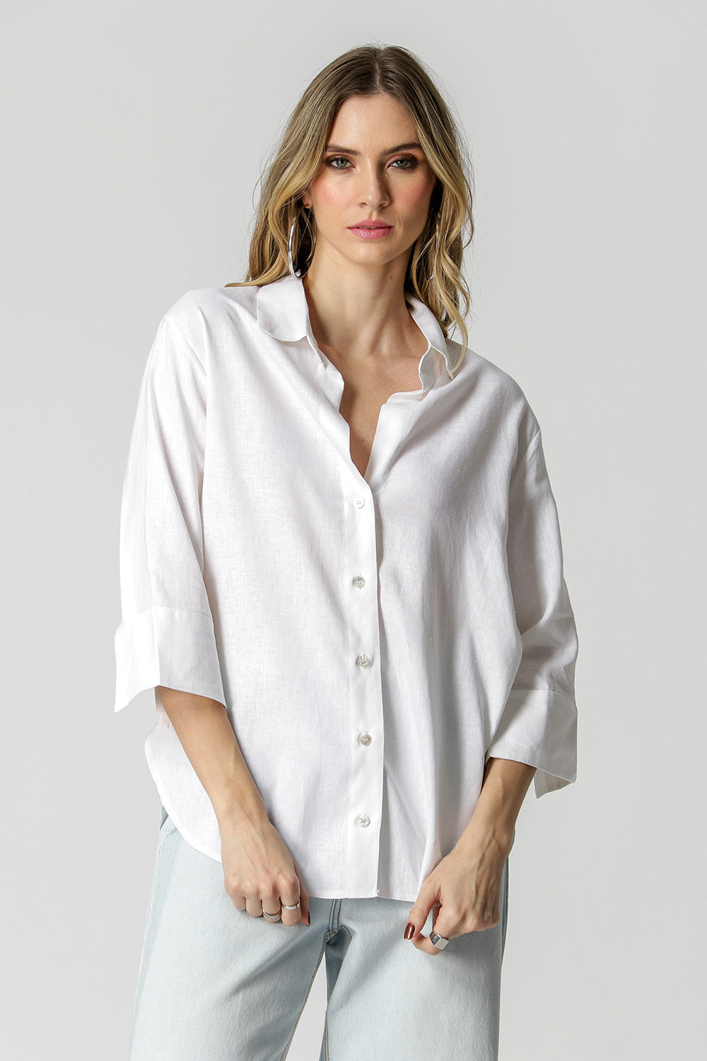 Camisa de corte más holgado, botonadura delantera y mangas 3/4. Pieza confeccionada en lino fresco, ¡perfecta para esta temporada!