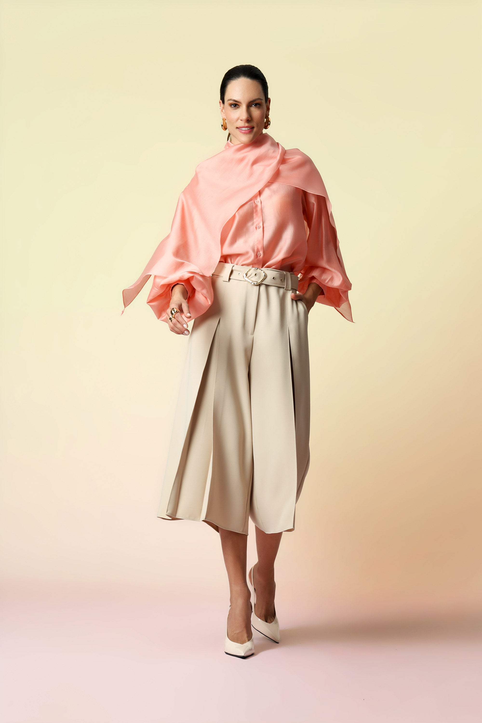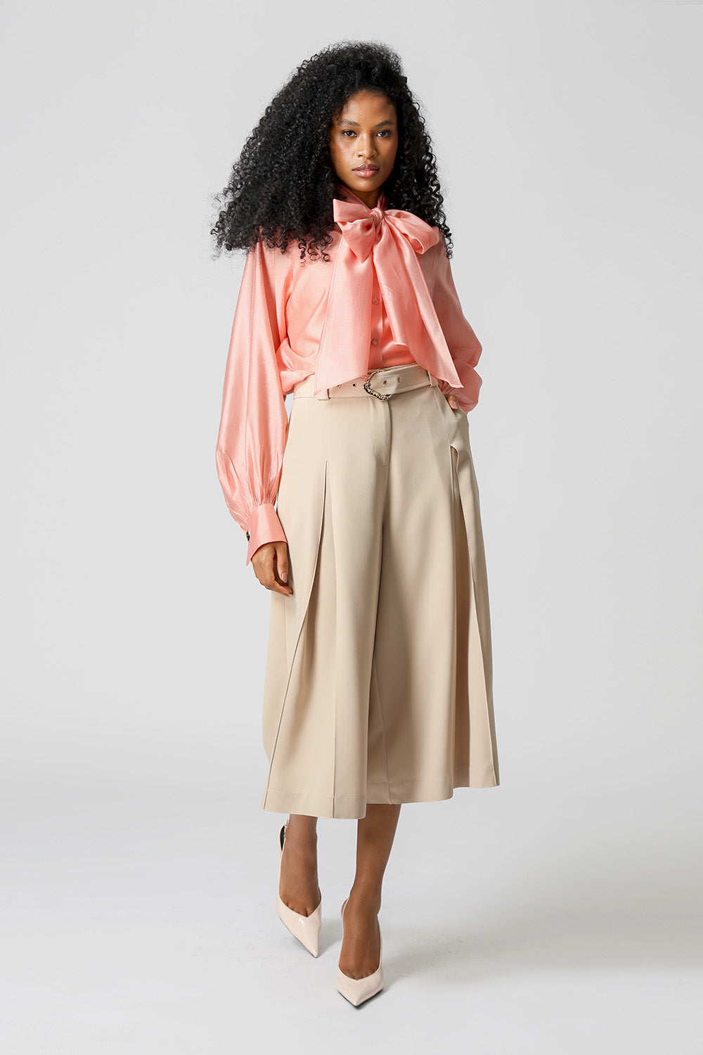 Camisa de manga longa bufante em tecido de liocel, leve e sofisticado. Destaque para o laço amplo no decote, que traz um toque elegante e feminino à peça.