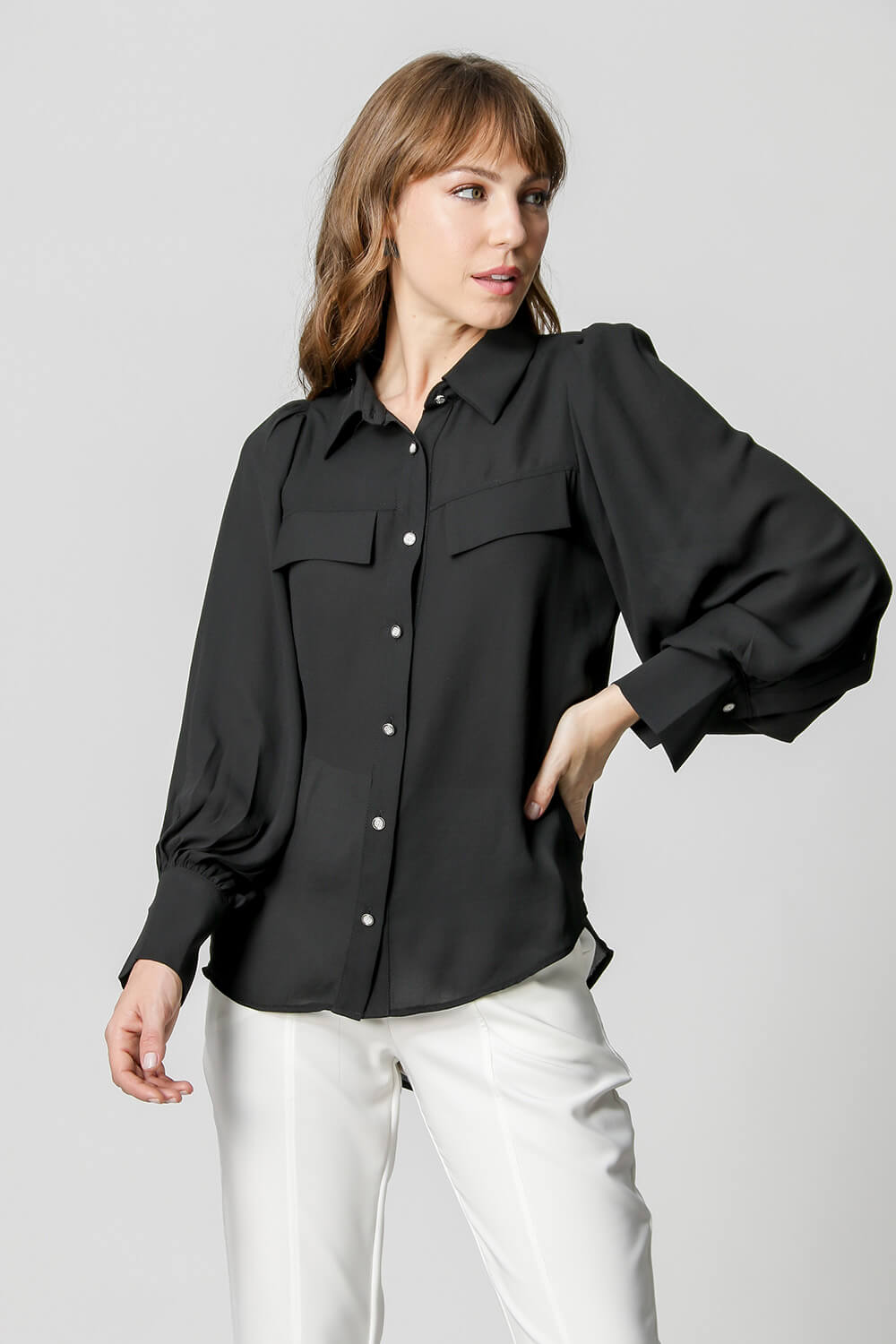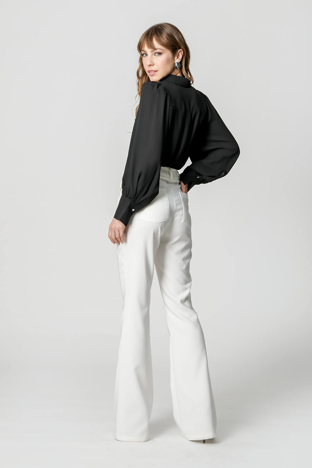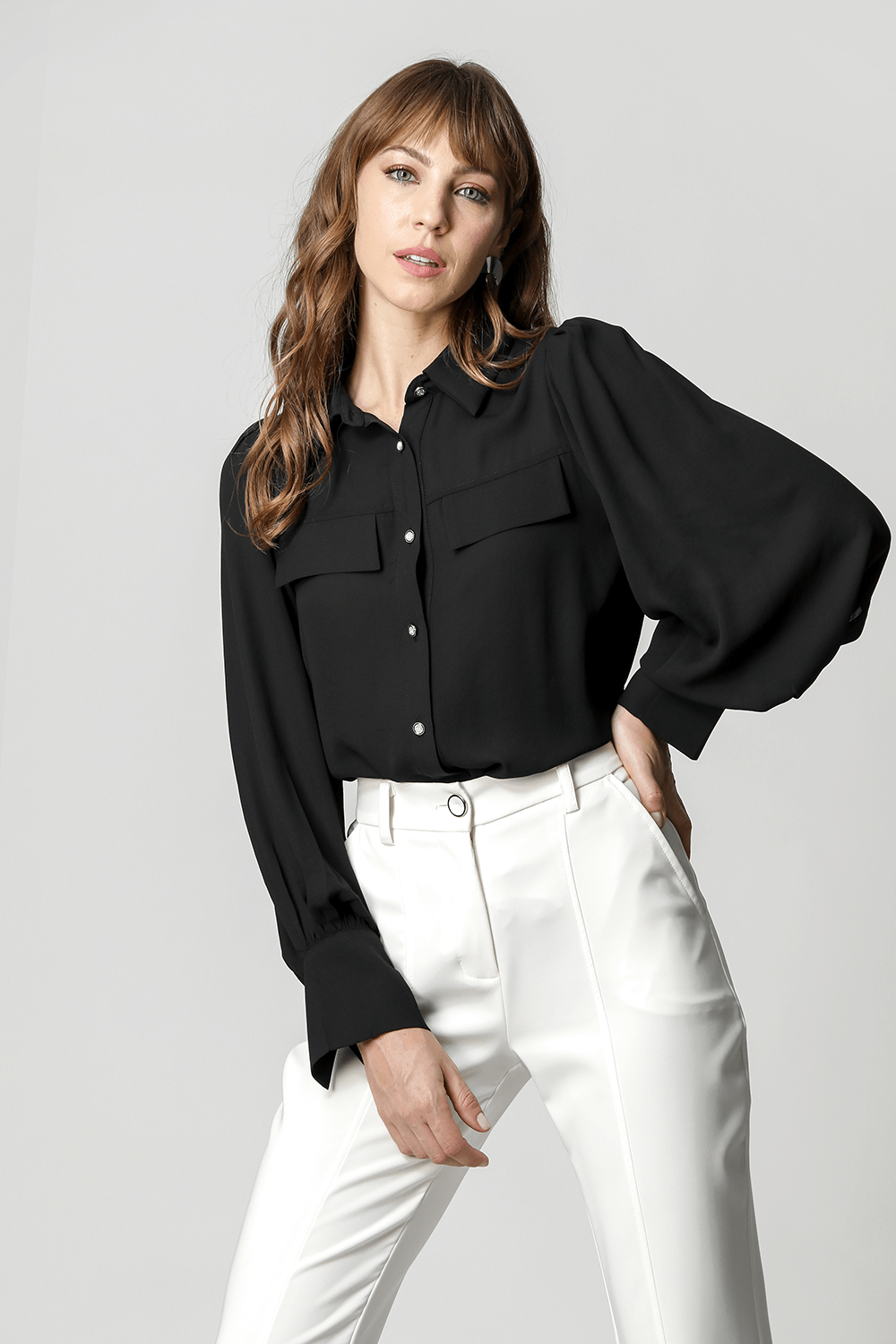 Camisa com manga longa bufante, com detalhe lapela na frente. Um modelo confeccionado em crepe fluído. Modelo perfeito para mood work cheio de charme.
