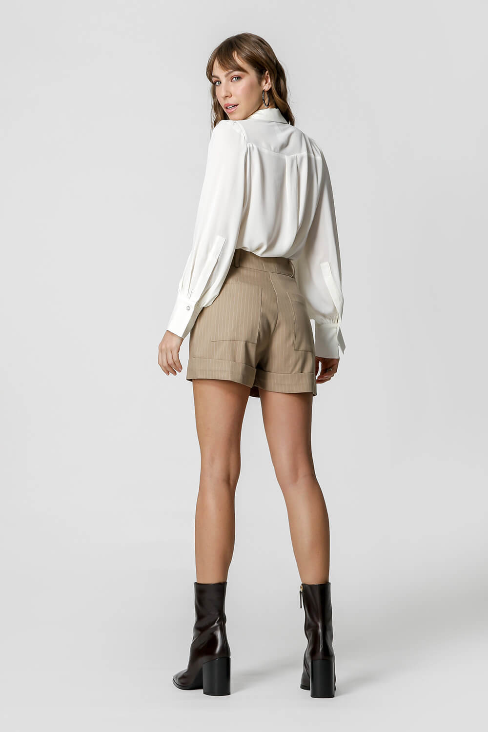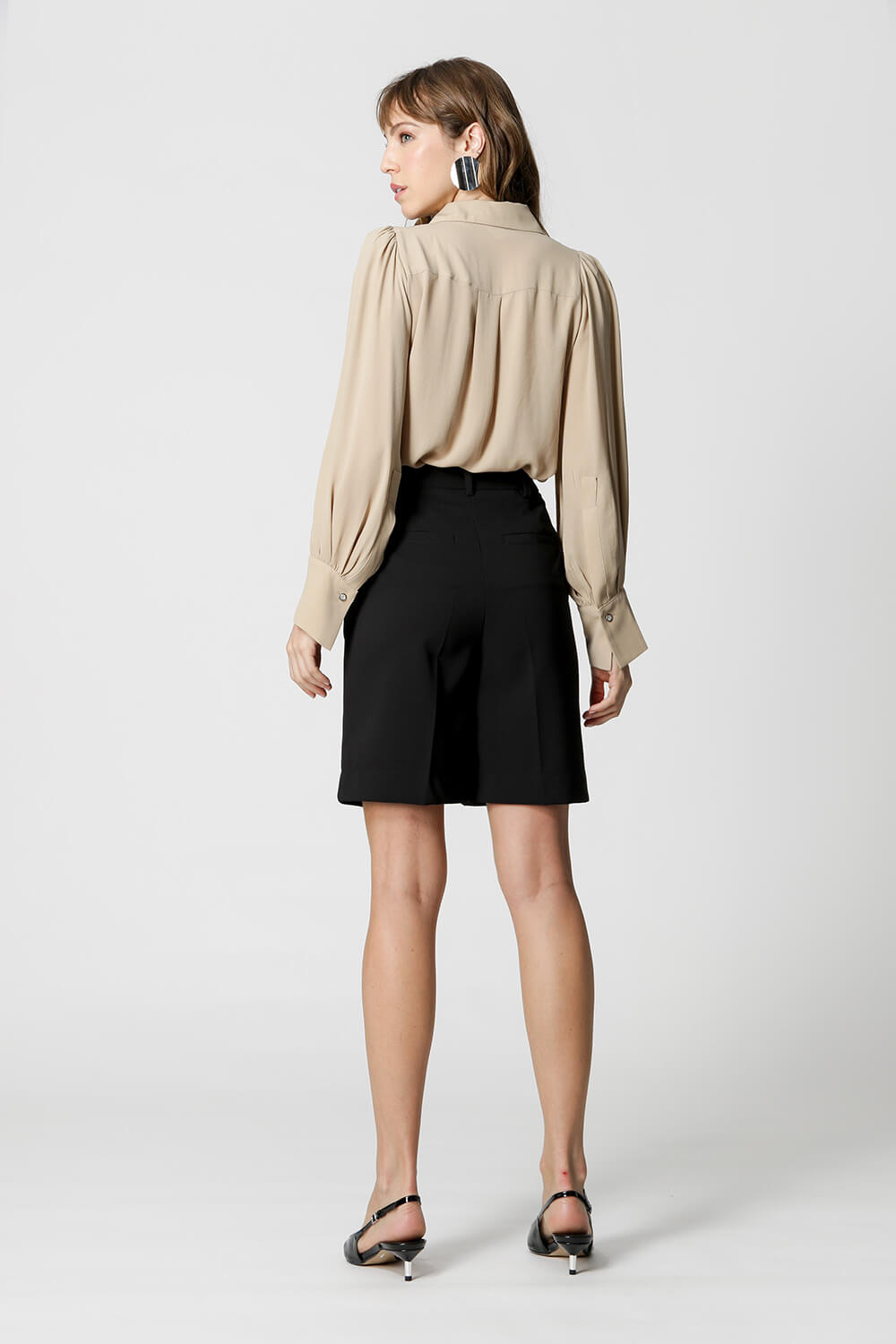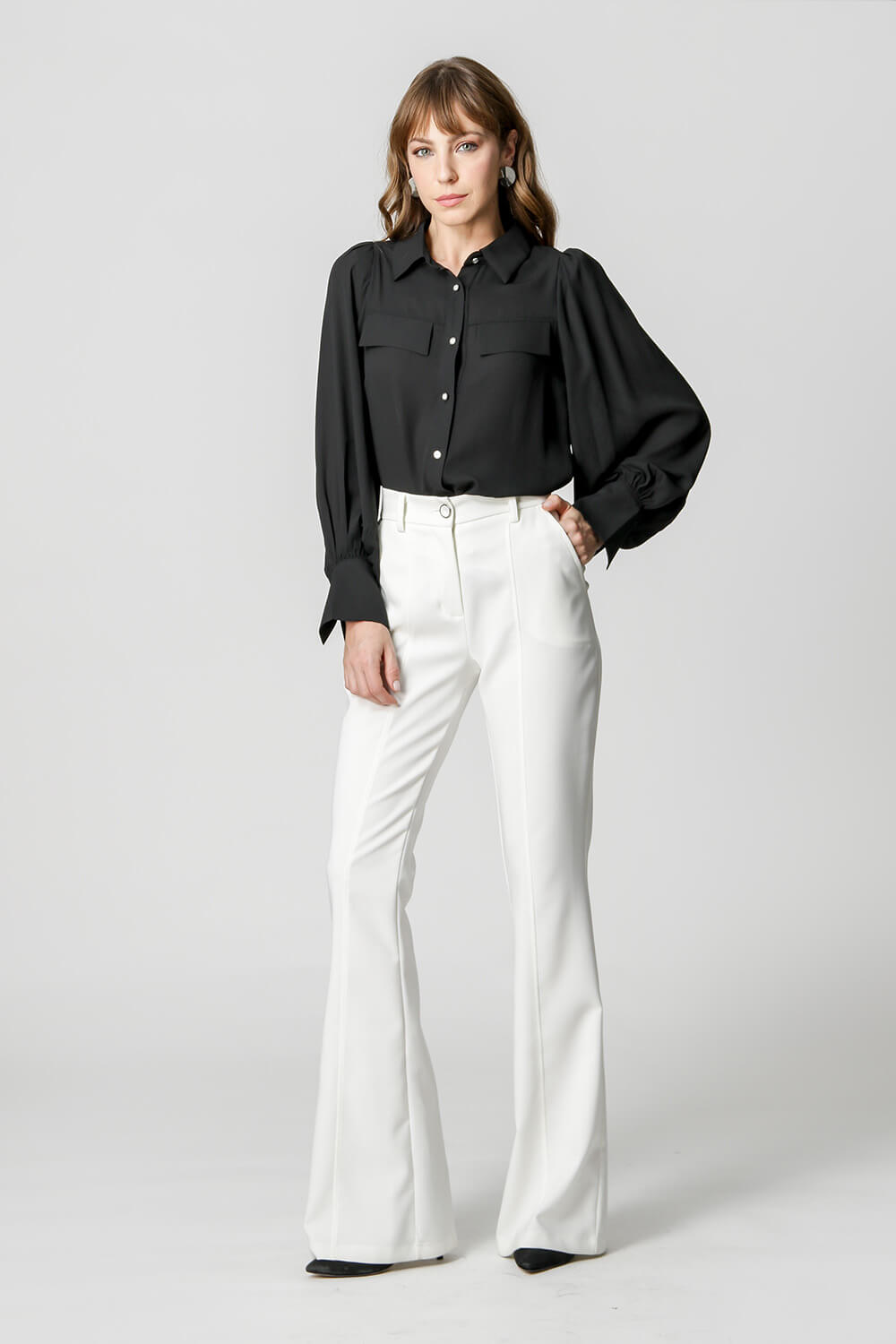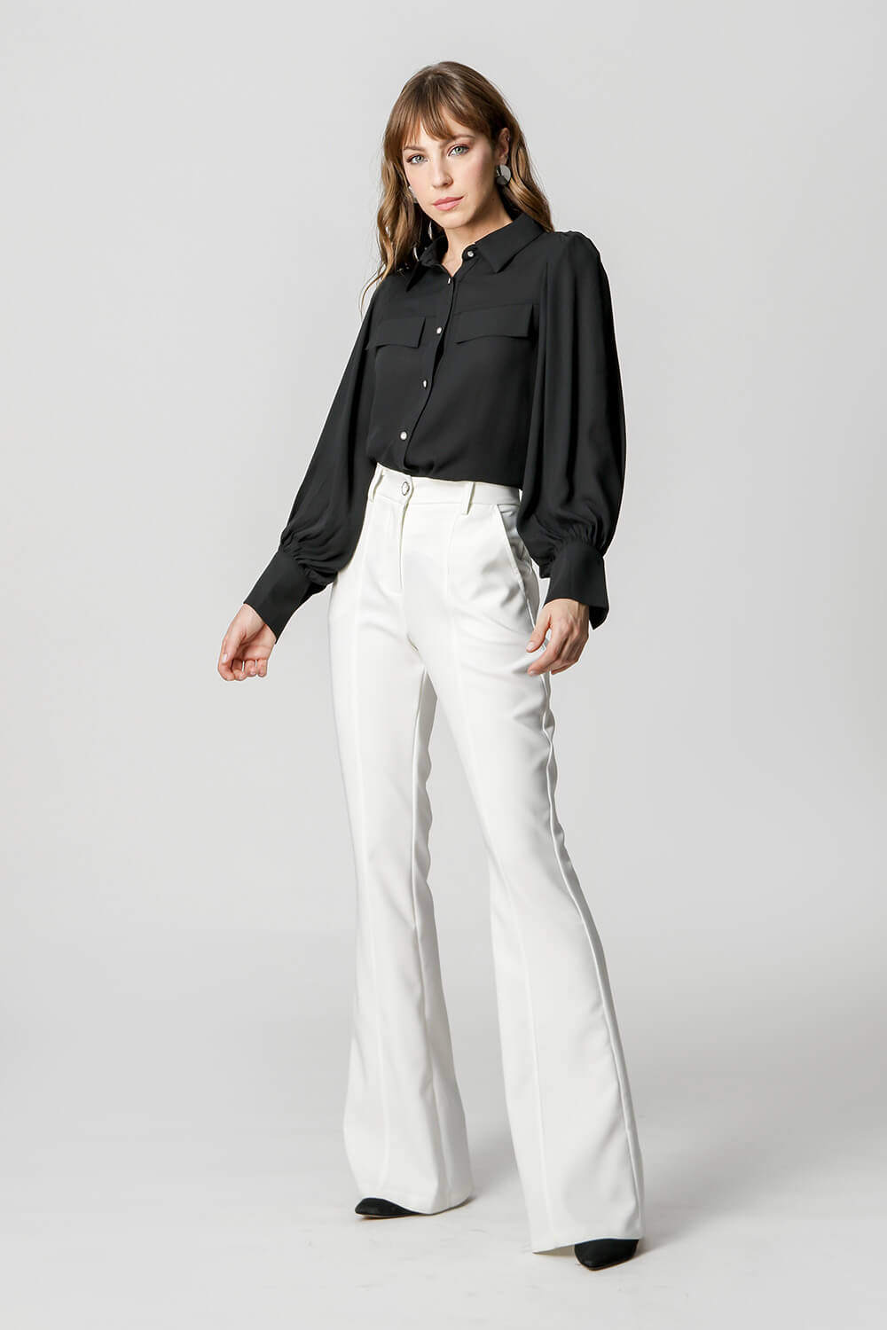 Camisa com manga longa bufante, com detalhe lapela na frente. Um modelo confeccionado em crepe fluído. Modelo perfeito para mood work cheio de charme.