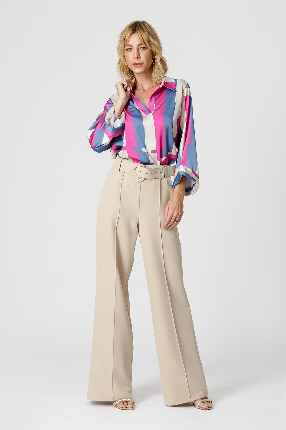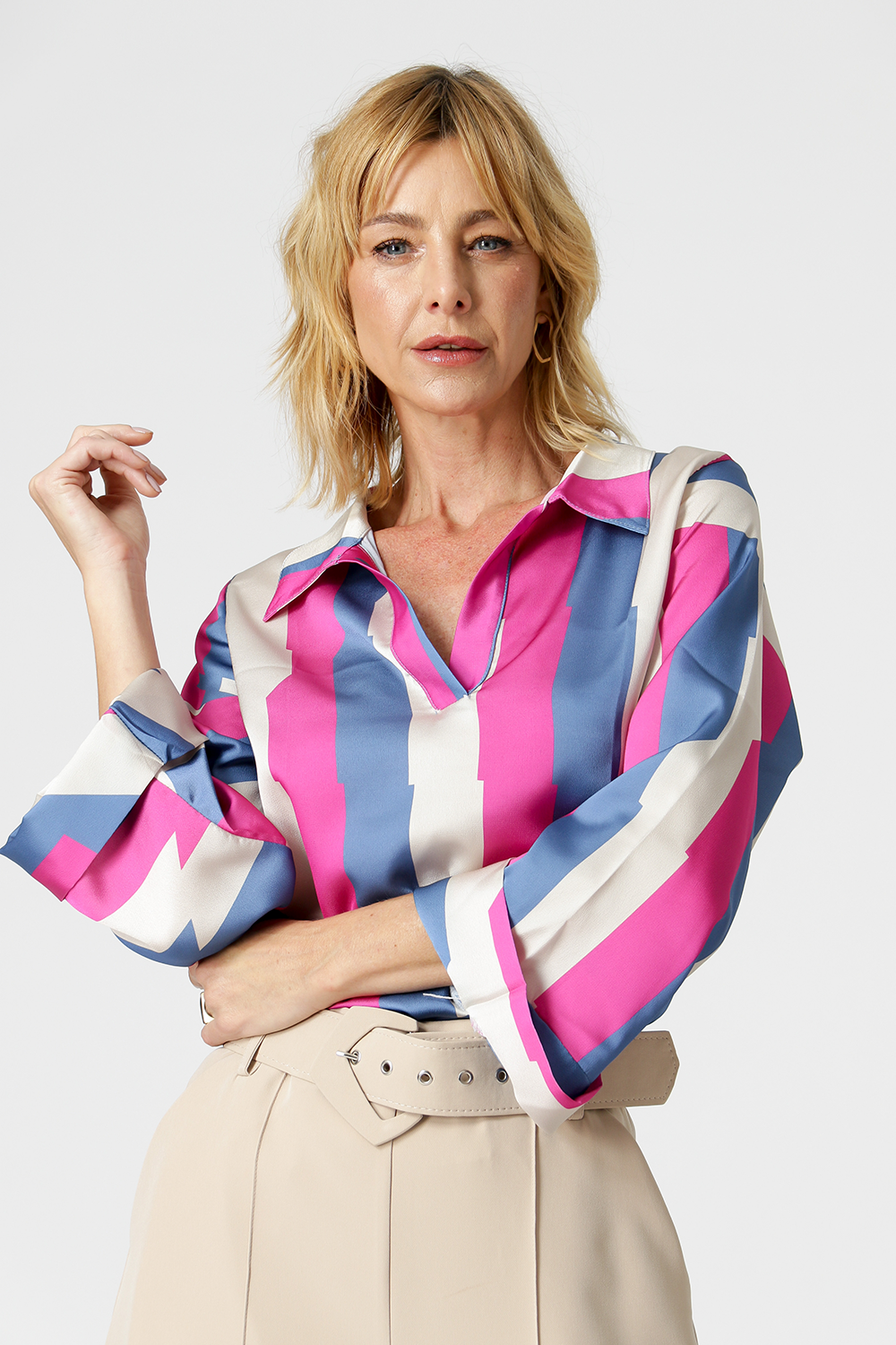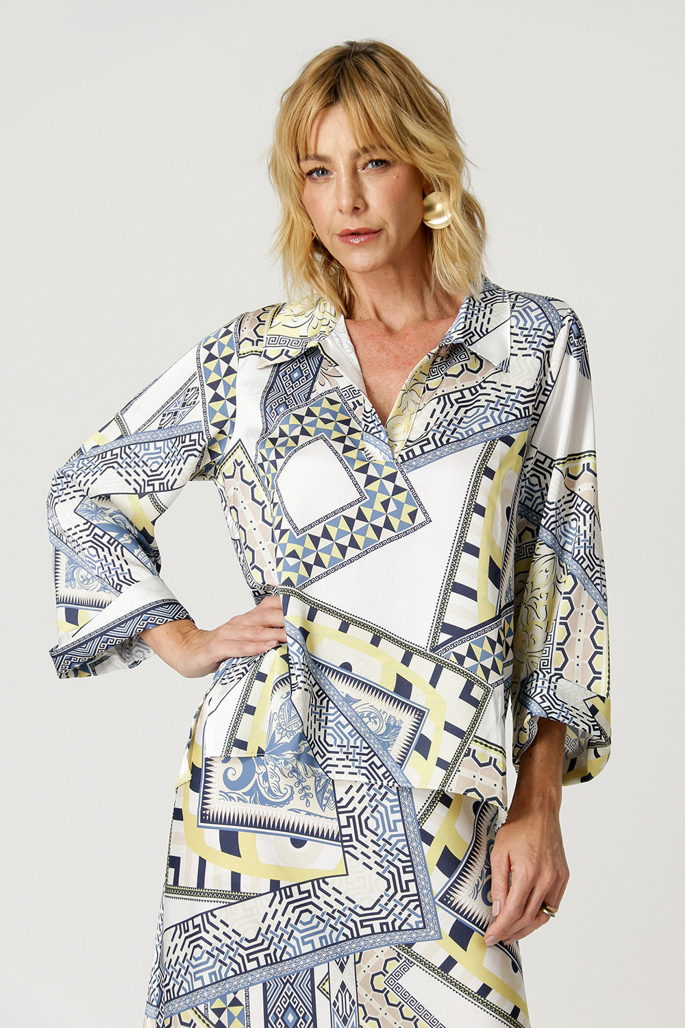 Camisa com manga 3/4. Confeccionada em tecido cetim bubble estampada. Uma peça confortável e fluída ideal para ser usado em dias quentes no mood work.