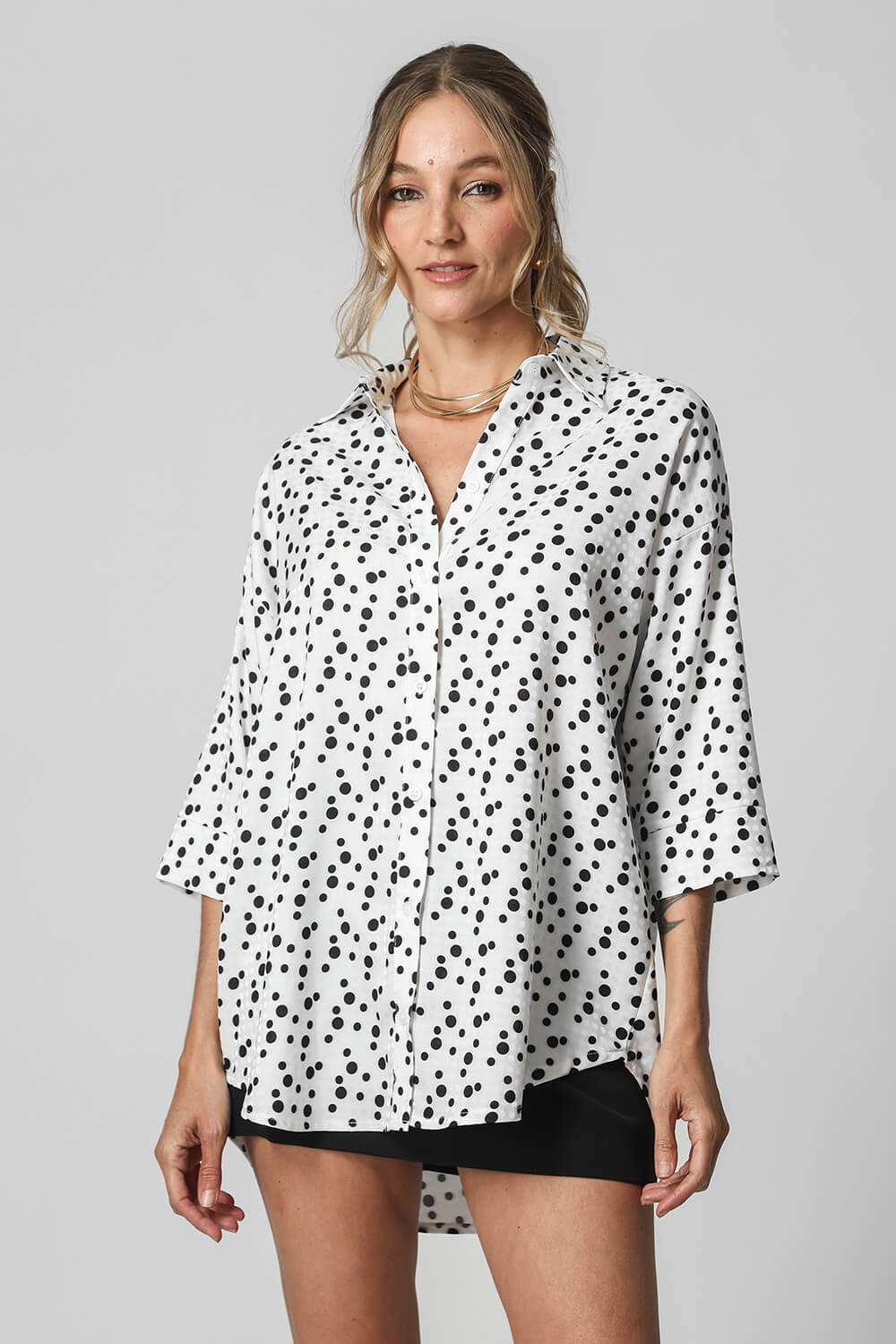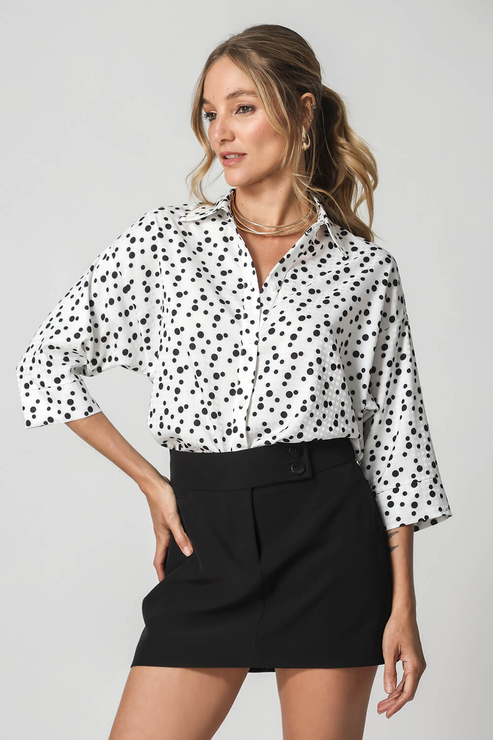 Camisa em cetim maquinetado poa com botões . Uma peça atemporal com estampa exclusiva, ideal para compor looks work!
