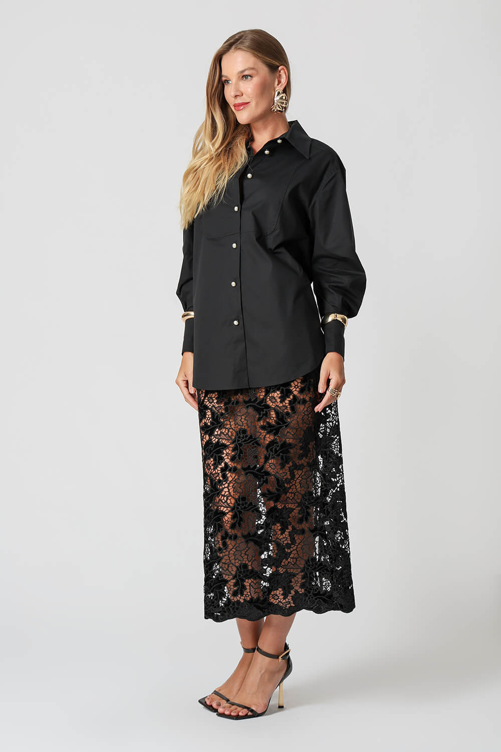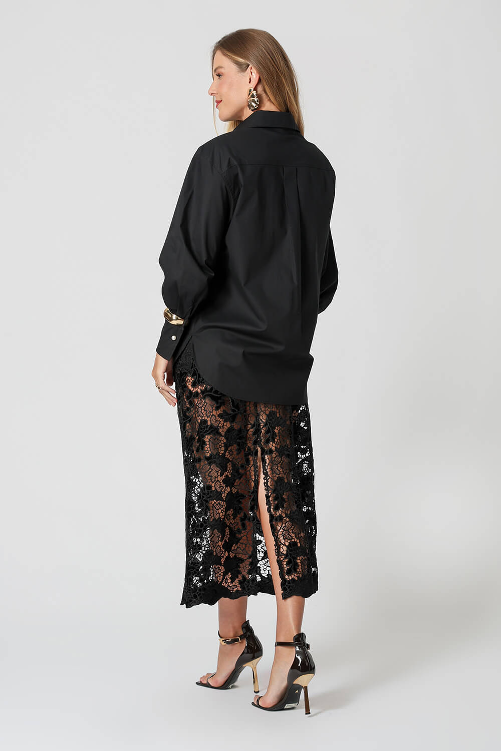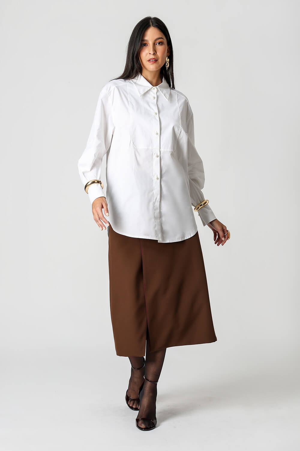 Camisa em tricoline com mangas balloon e pala frontal. Elegante e moderna, ideal para composições sofisticadas e contemporâneas.
