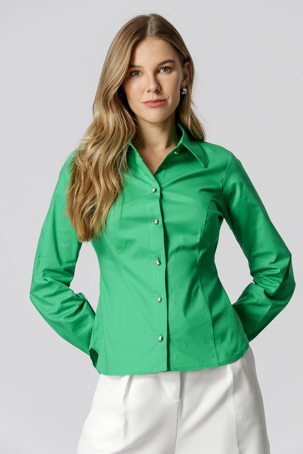 Camisa de manga larga y distintivos botones de pedrería. Pieza confeccionada en tejido tricolina. Una pieza imprescindible en tu armario, una pieza tradicional pero moderna para crear looks casuales llenos de encanto.