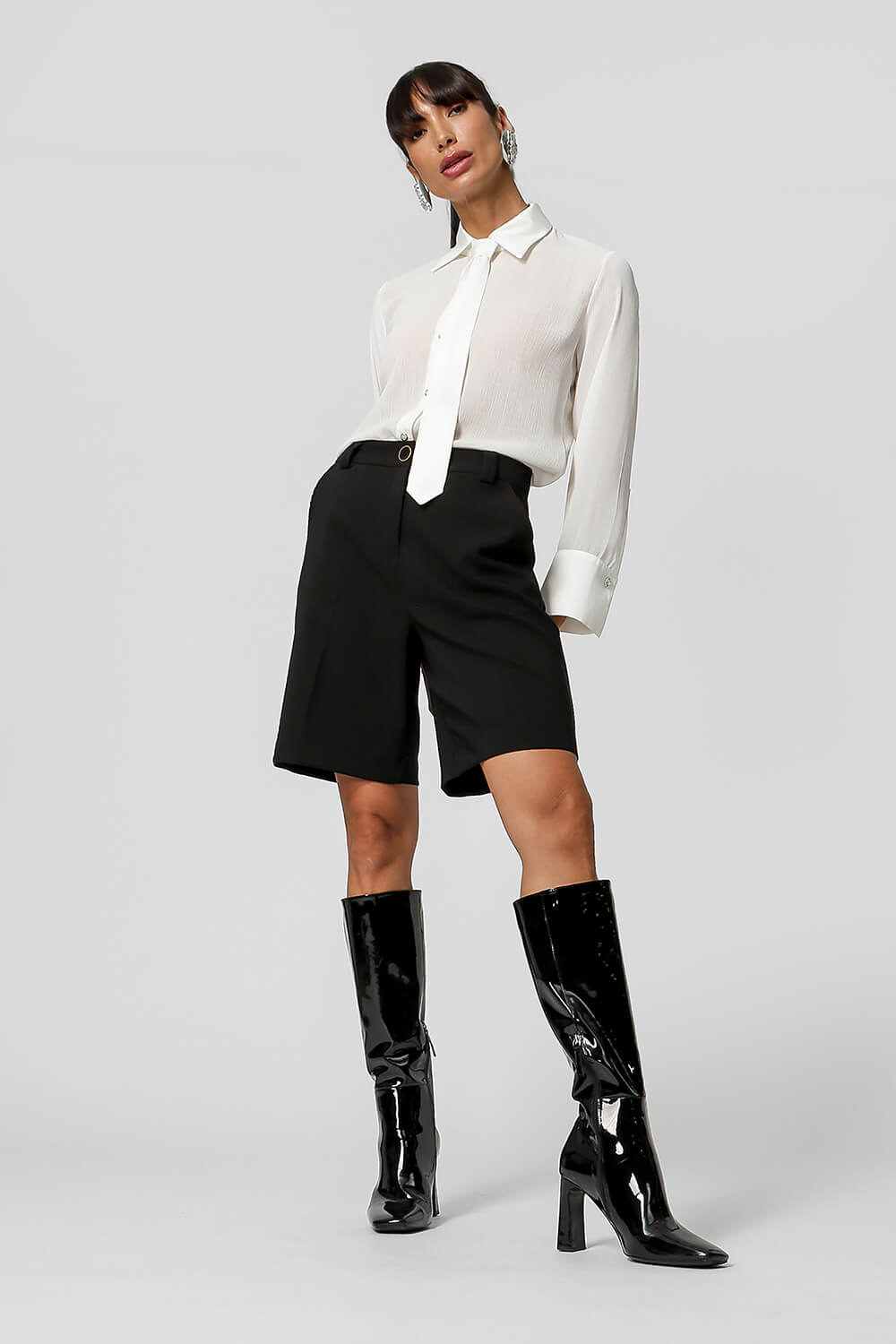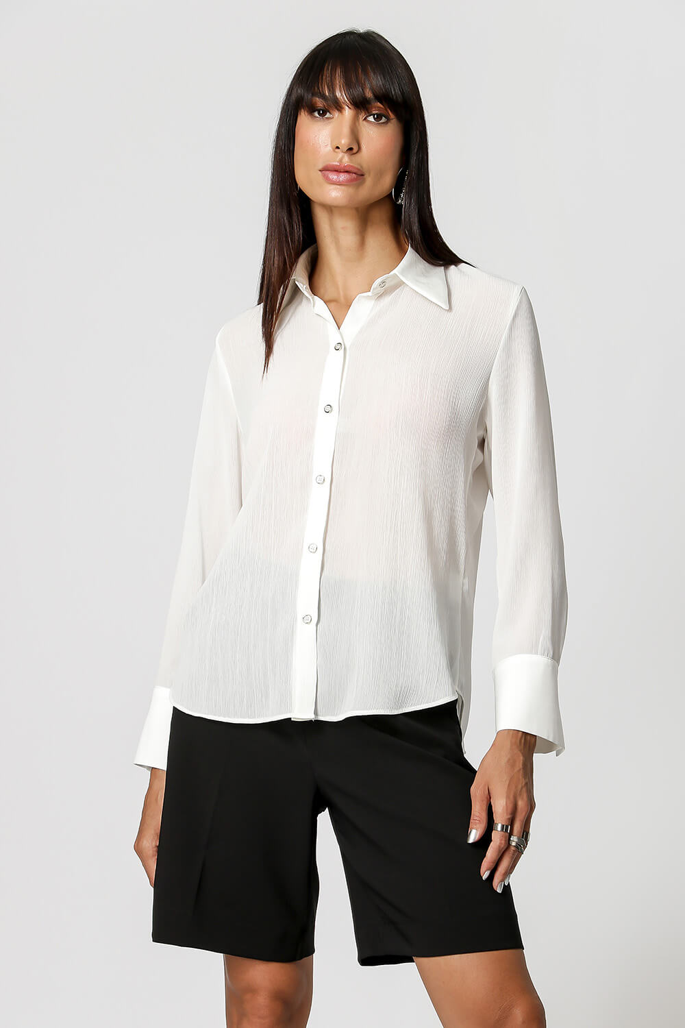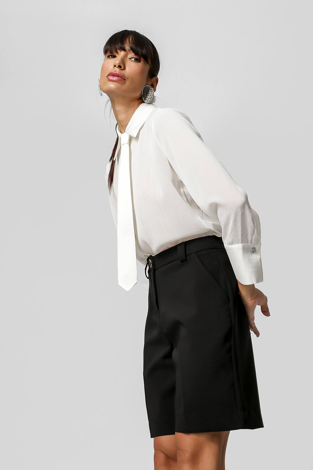 Camisa com uma leve transparência com detalhe de botões e com acessório gravata. Modelo confeccionada em tecido chiffon com leve textura plissado. Modelo elegante, moderno por trazer esse acessório gravata para compor seu look que esta super em alta, aposte.