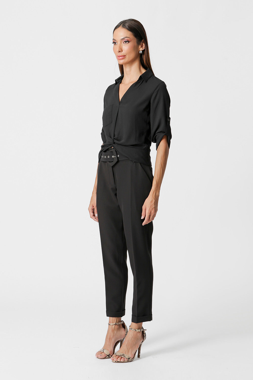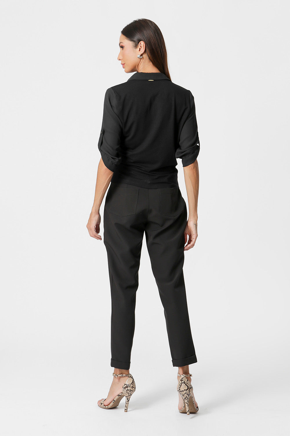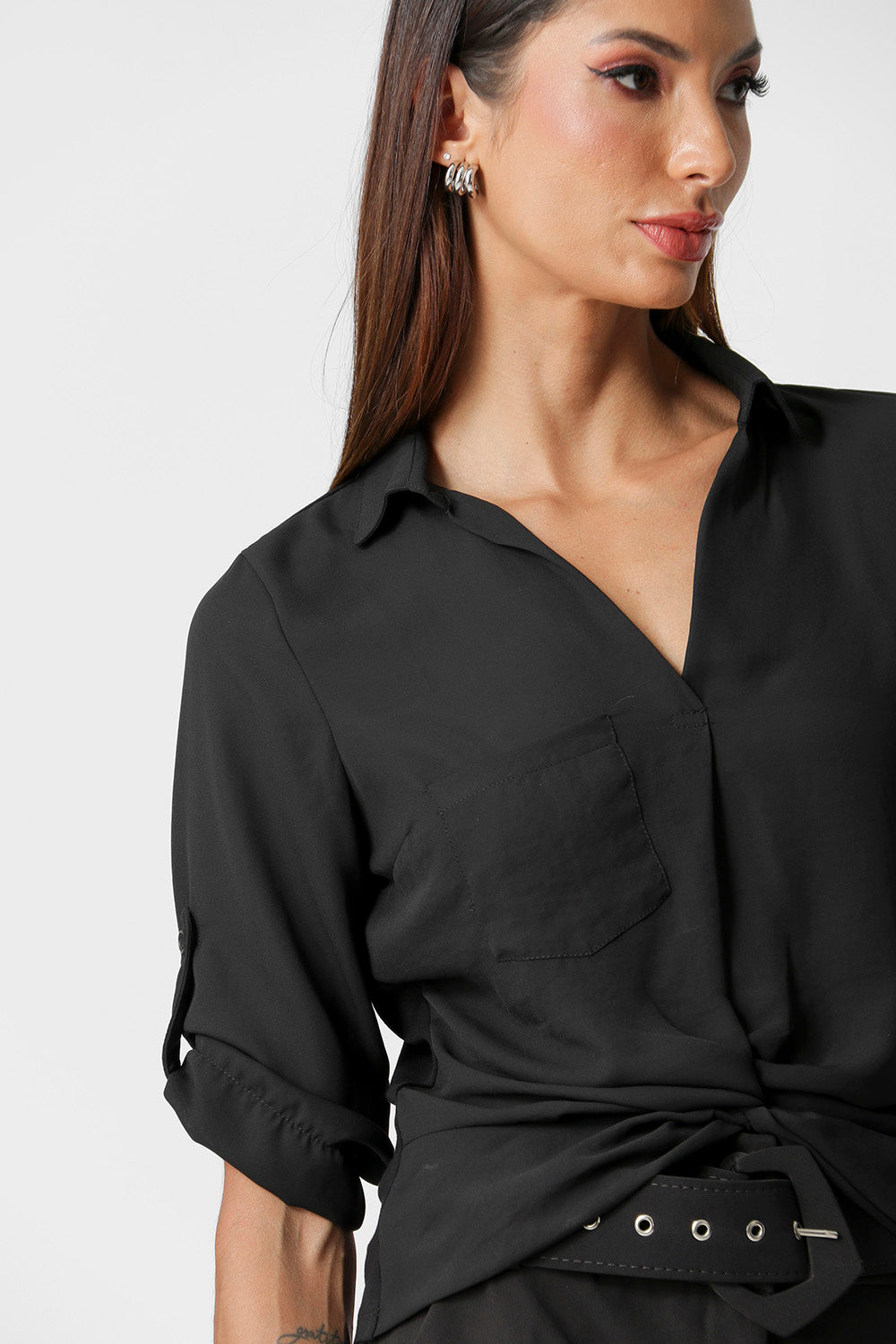 Camisa con mezcla de tejidos. En tejido fluido en la parte delantera y mangas y en malla de viscosa en la espalda para darle mayor comodidad a la pieza. Con mangas 3/4 y martingala, tiene un detalle de giro en la parte delantera.