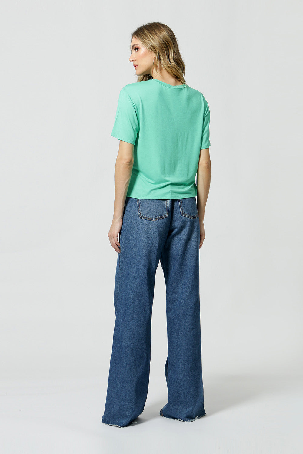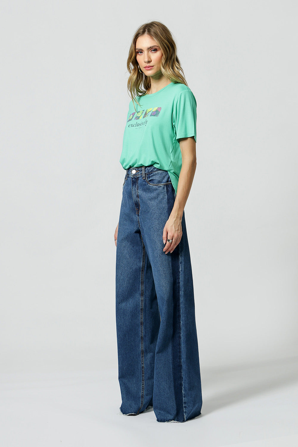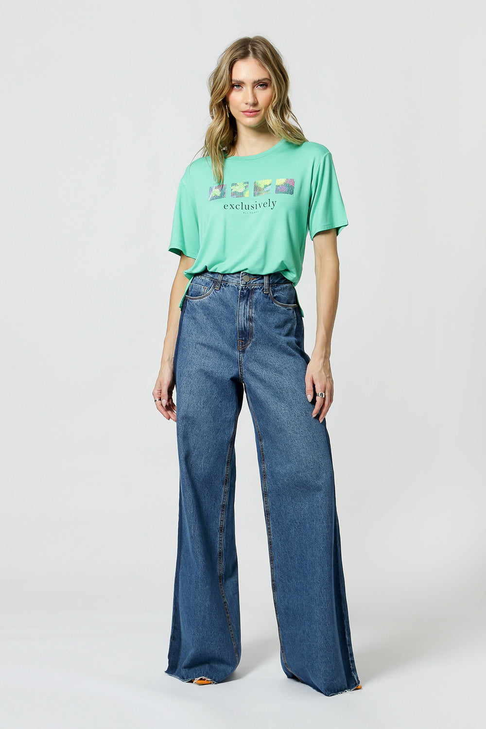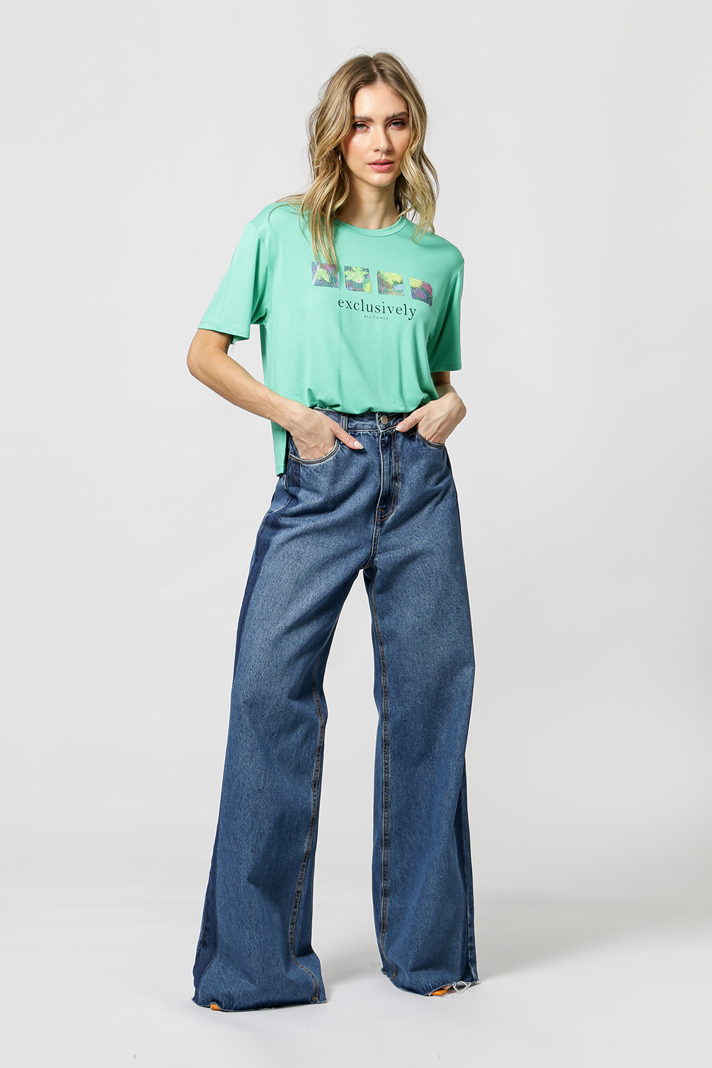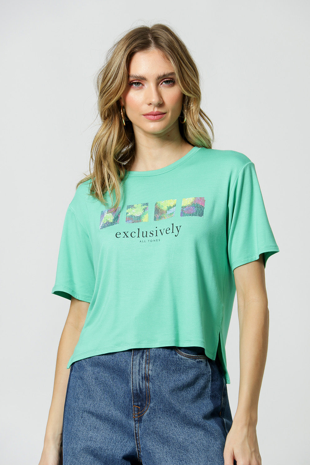 Camiseta básica, alargada en la espalda con estampado localizado y lentejuelas. Pieza confeccionada en punto, combinando comodidad, practicidad y estilo.