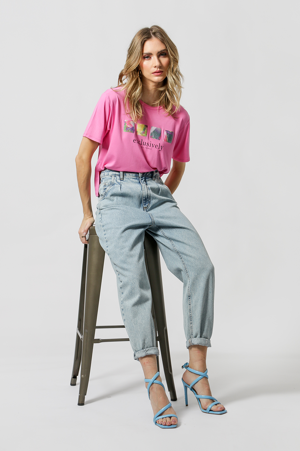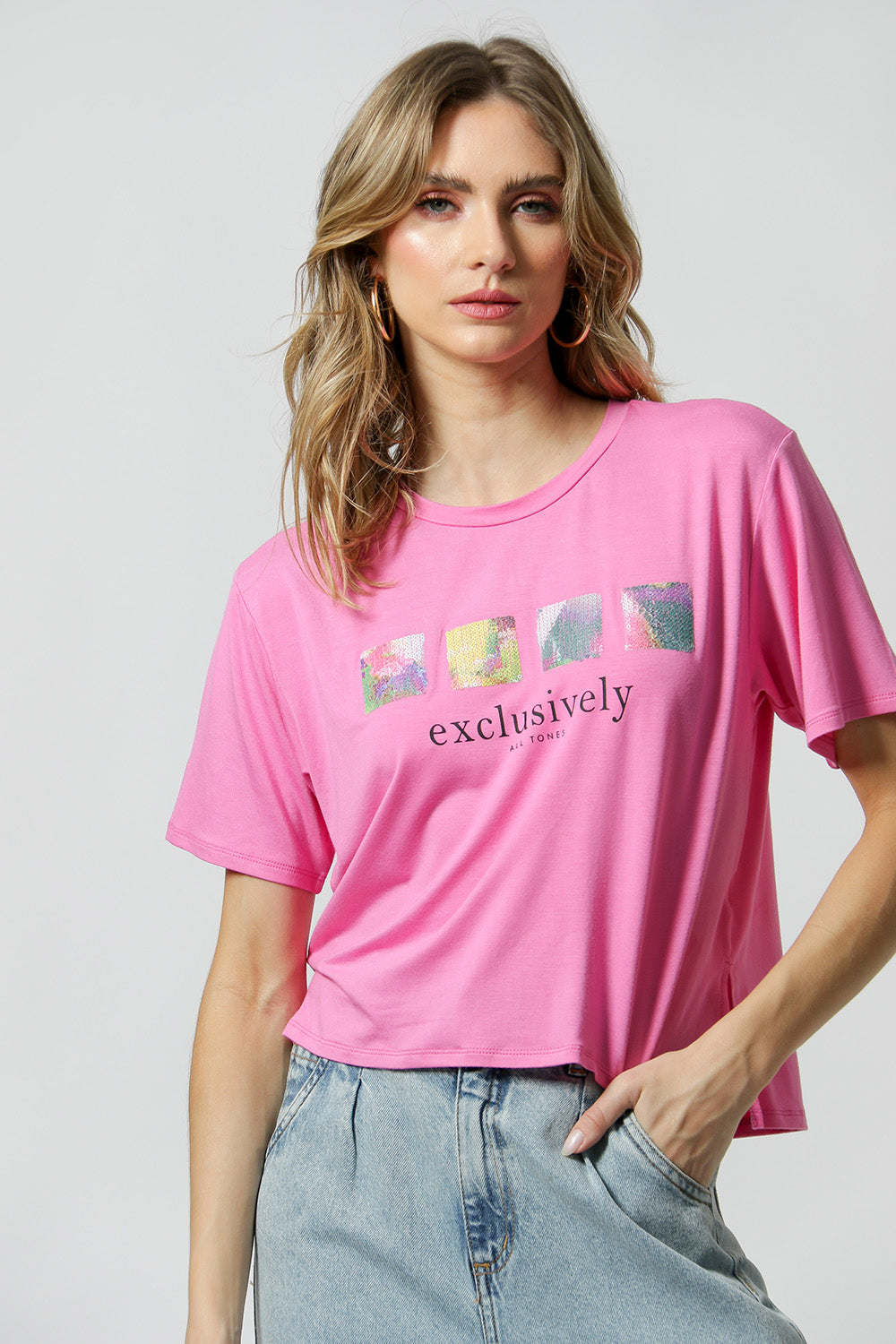 Camiseta básica, alargada en la espalda con estampado localizado y lentejuelas. Pieza confeccionada en punto, combinando comodidad, practicidad y estilo.