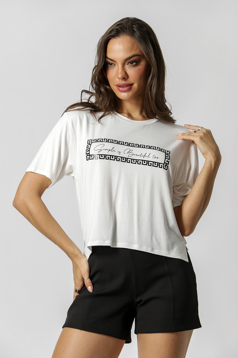 Camiseta básica, alargada en la espalda con estampado escrito y aplicaciones brillantes. Ideal para un look casual sin renunciar al brillo.