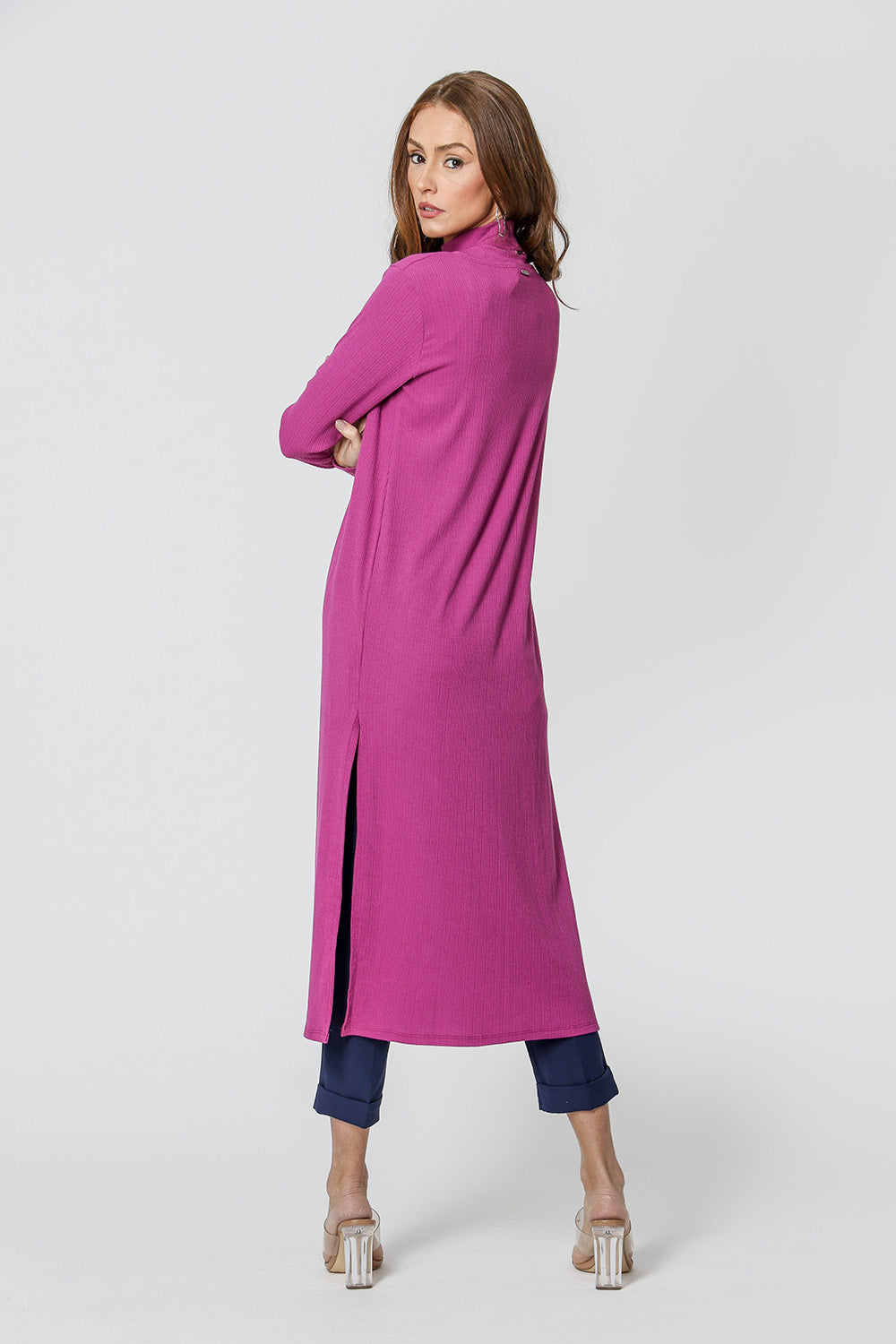 Cárdigan confeccionado en punto canalé, largo midi y detalle metálico. Una pieza que le dará un aire casual chic a tu look.
