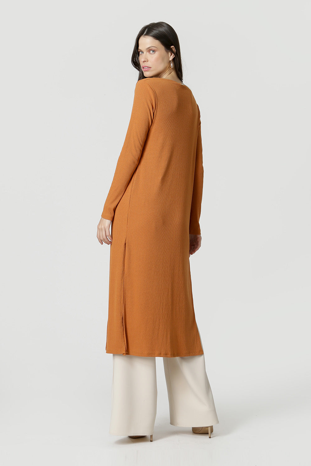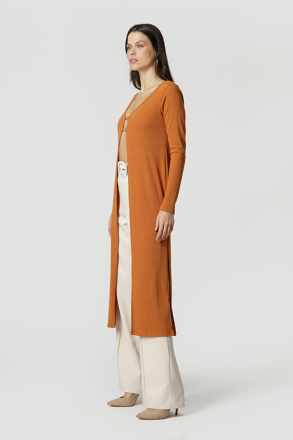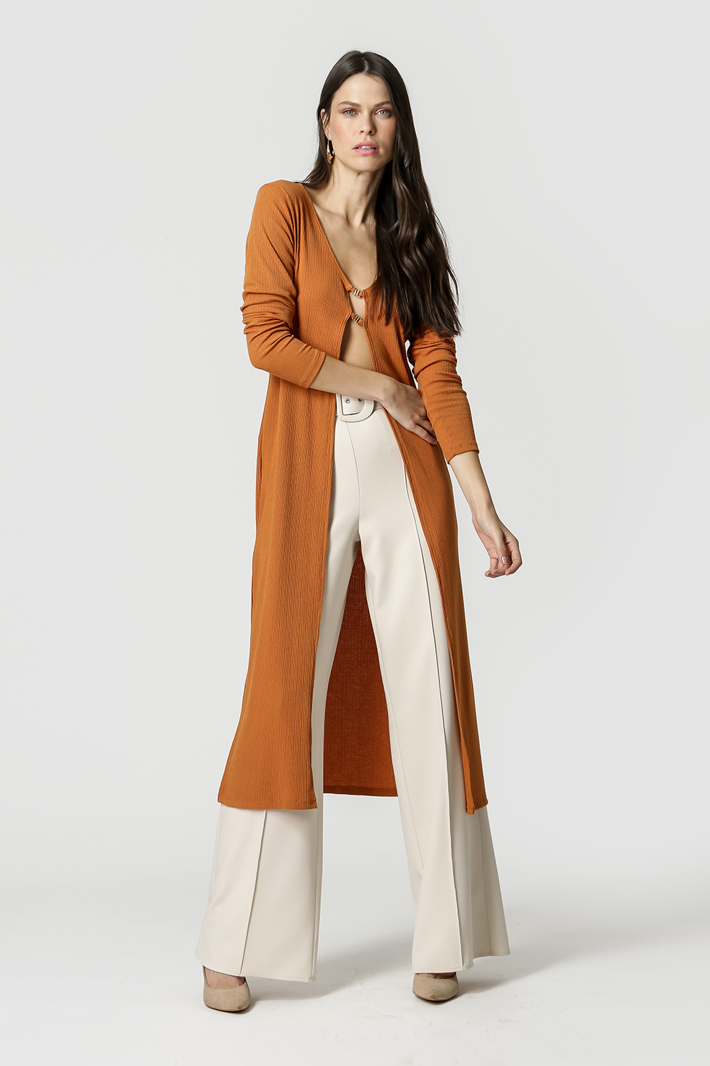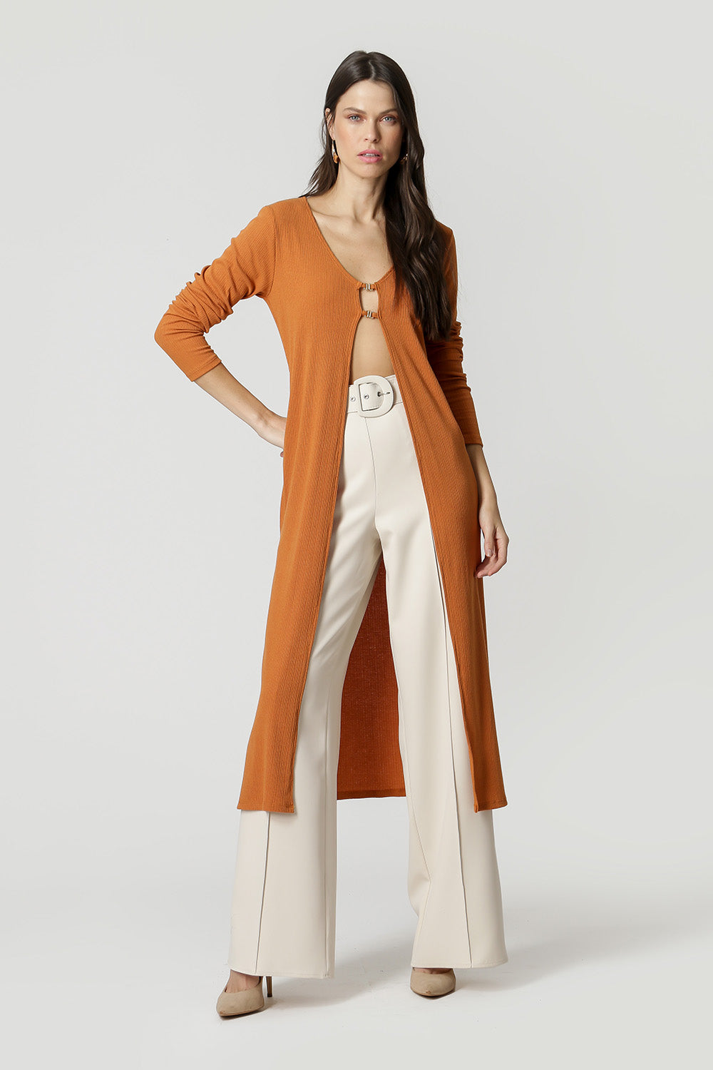 Cárdigan confeccionado en punto canalé, largo midi y detalle metálico. Una pieza que le dará un aire casual chic a tu look.