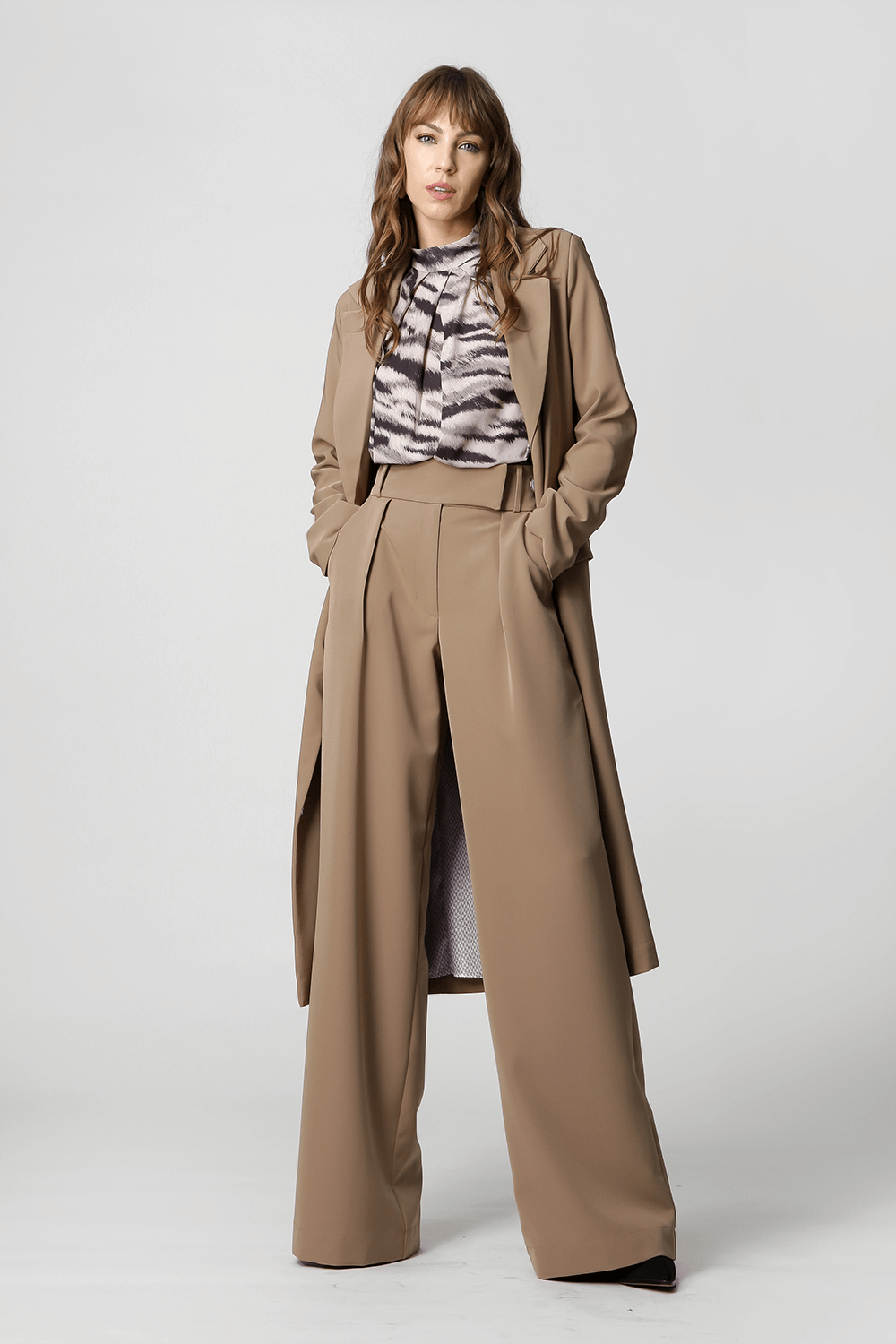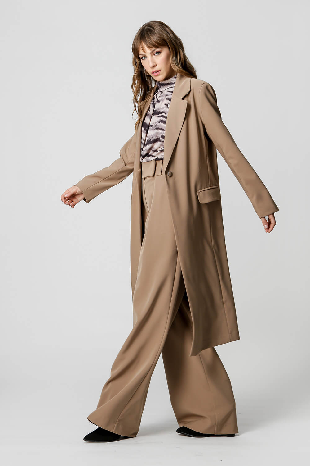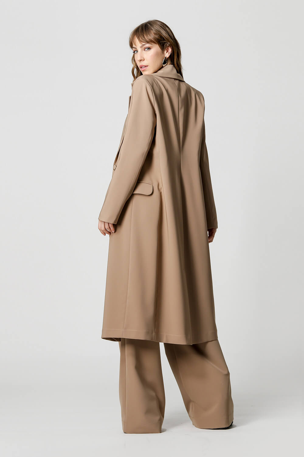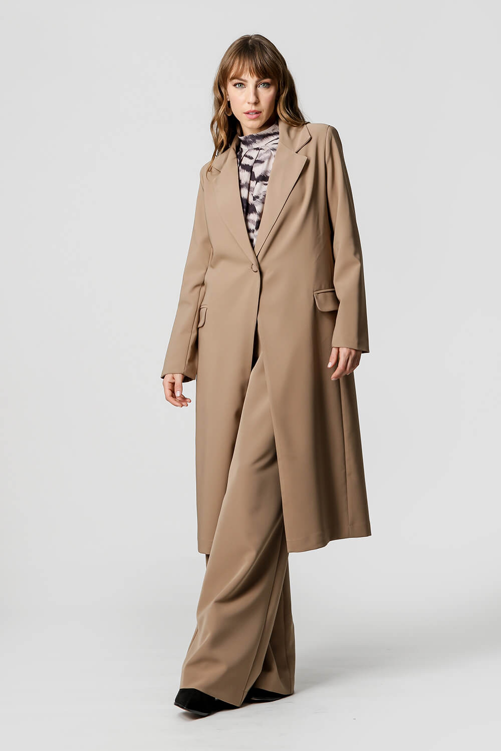 Abrigo sastre de largo medio con un solo botón revestido del mismo tejido con anilla metálica, bolsillos con solapa.