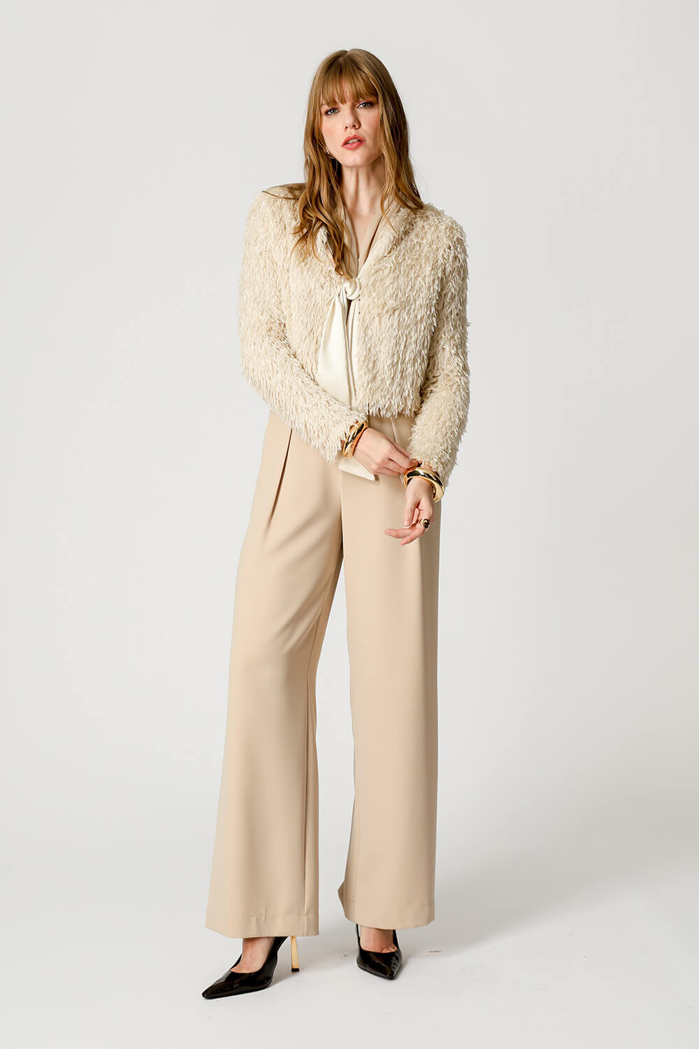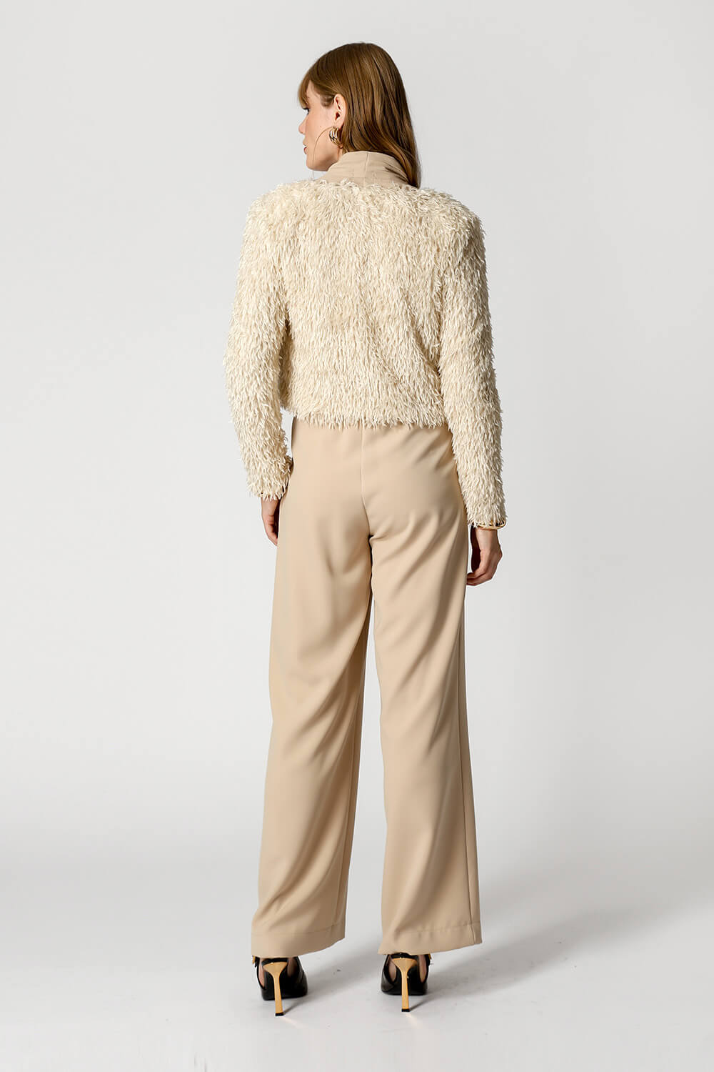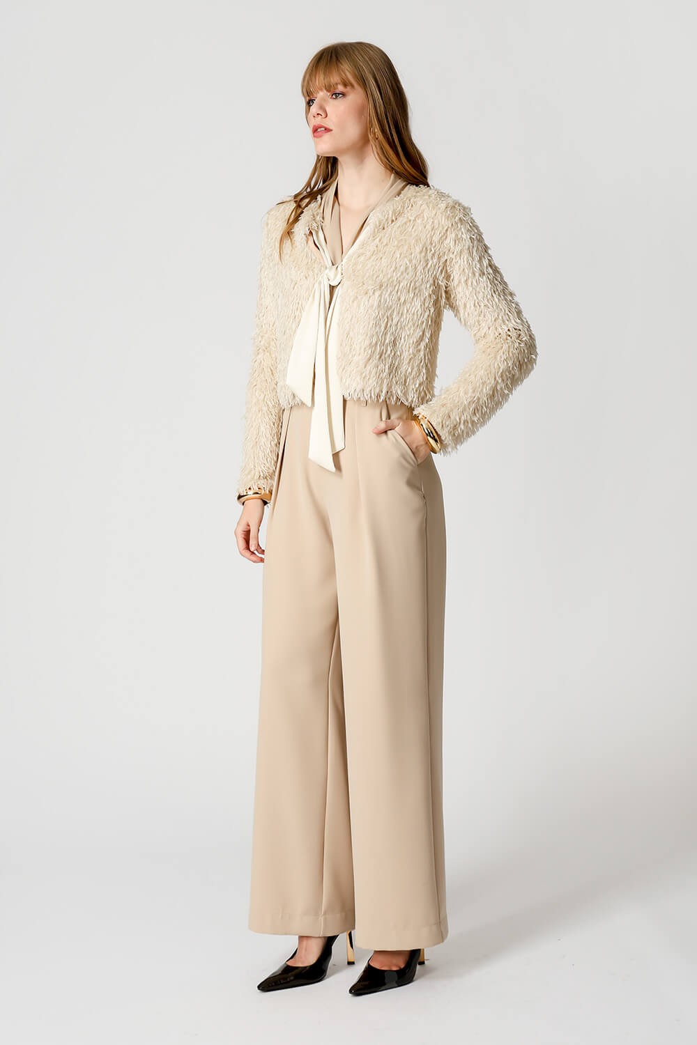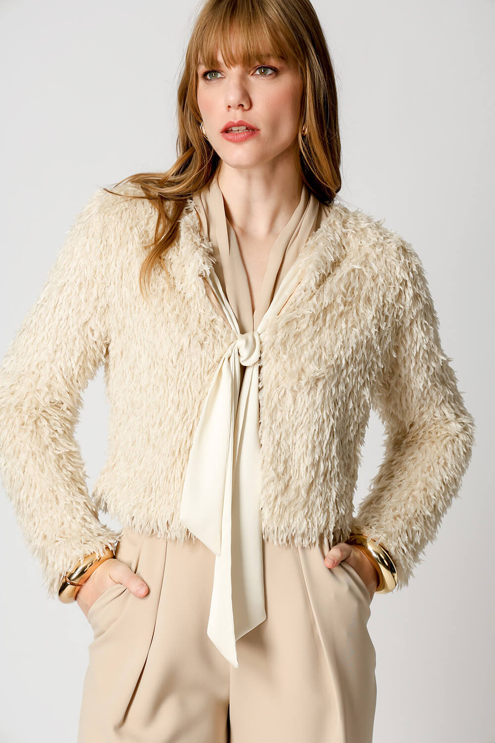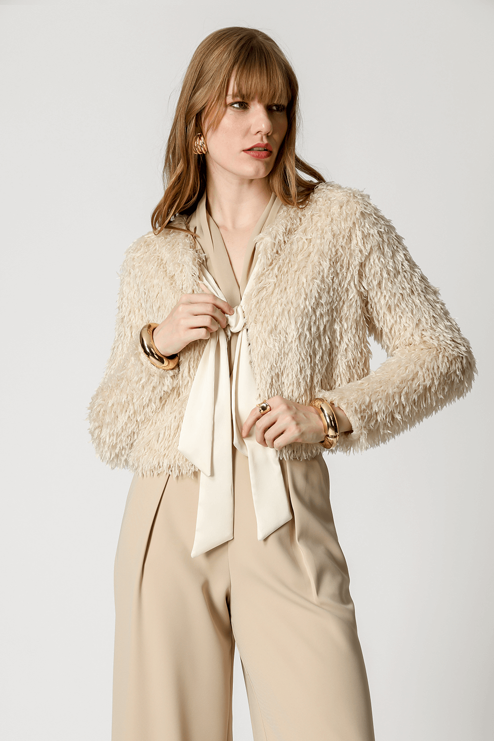 Casaqueto leve e estiloso, confeccionado em tecido de pluma. Possui ombreiras que estruturam a peça e laços delicados que trazem um toque feminino e sofisticado. Ideal para looks modernos e elegantes.