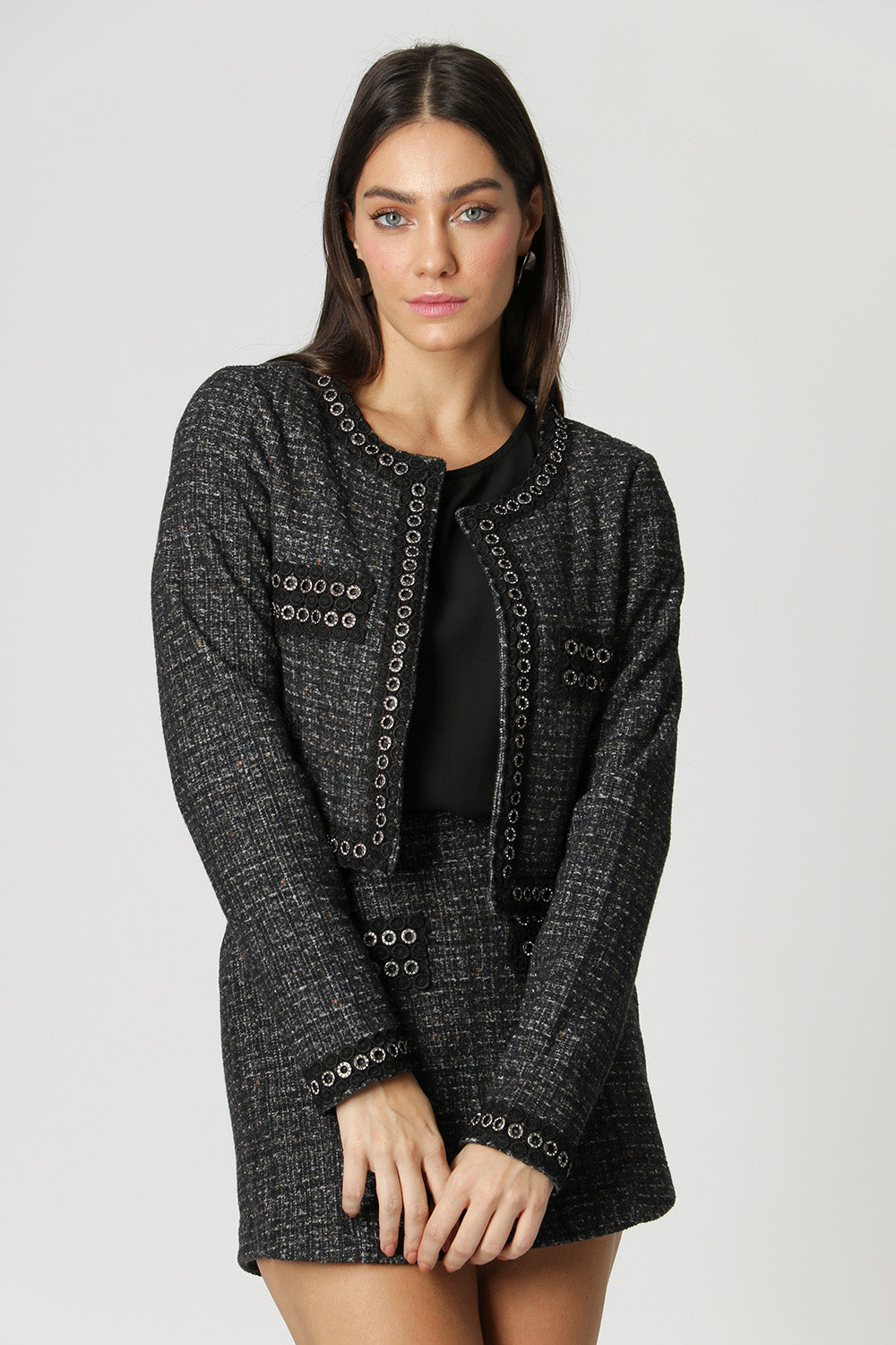 Chaqueta cropped, confeccionada en tweed y con detalle de pedrería. Usa esta pieza para añadir ese toque extra a tu look casual.