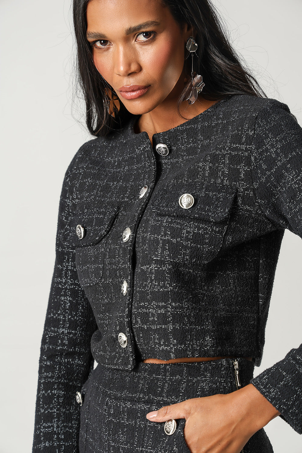 Chaqueta confeccionada en tweed, que combina sofisticación y estilo clásico. La pieza presenta bolsillos de solapa y detalle de botón con escudo, que añaden un toque de elegancia y autenticidad al diseño.