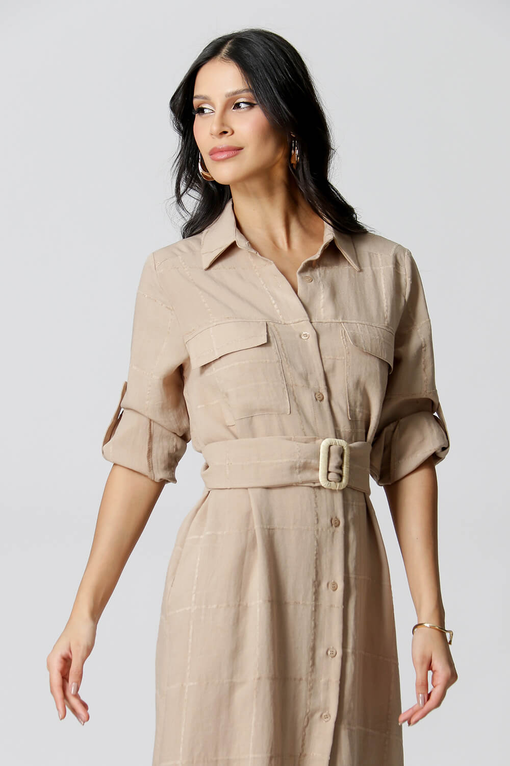 Viene con un cinturón hecho del mismo tejido con una hebilla de metal forrada de paja.