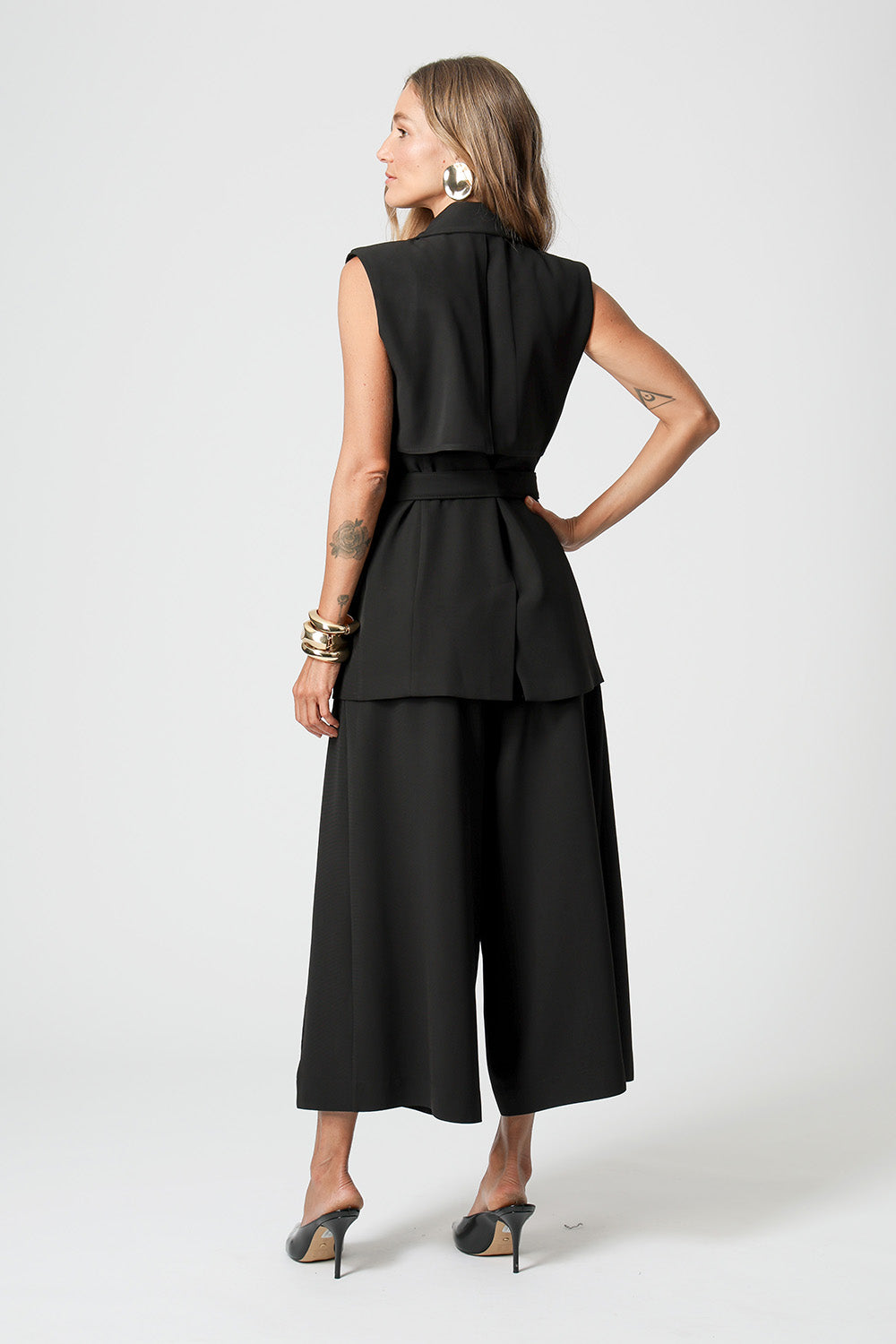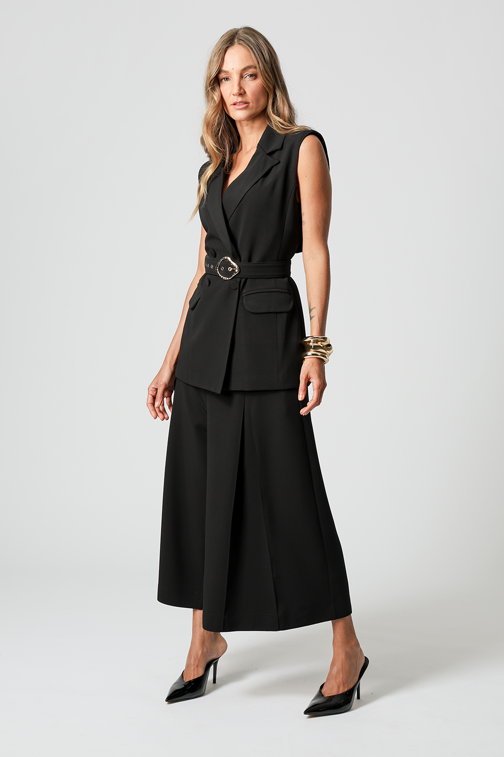 Moderno e elegante, o colete transpassado em alfaiataria fluida traz 4 botões frontais, bolsos funcionais e pala com prega nas costas. A fenda na barra traseira garante conforto e movimento ao look.