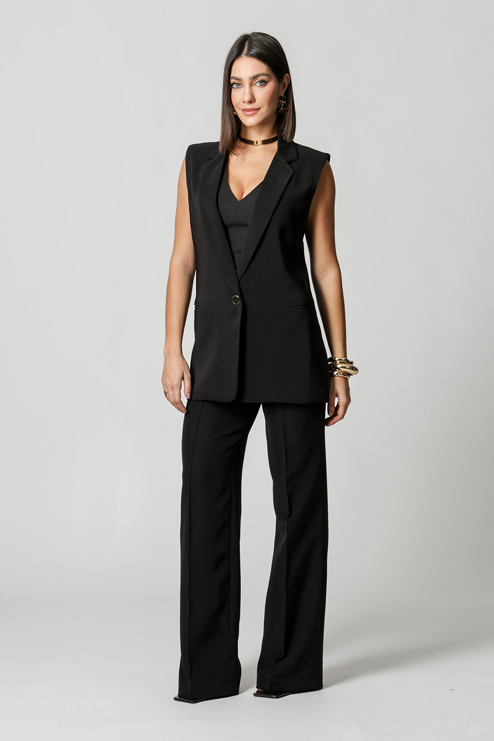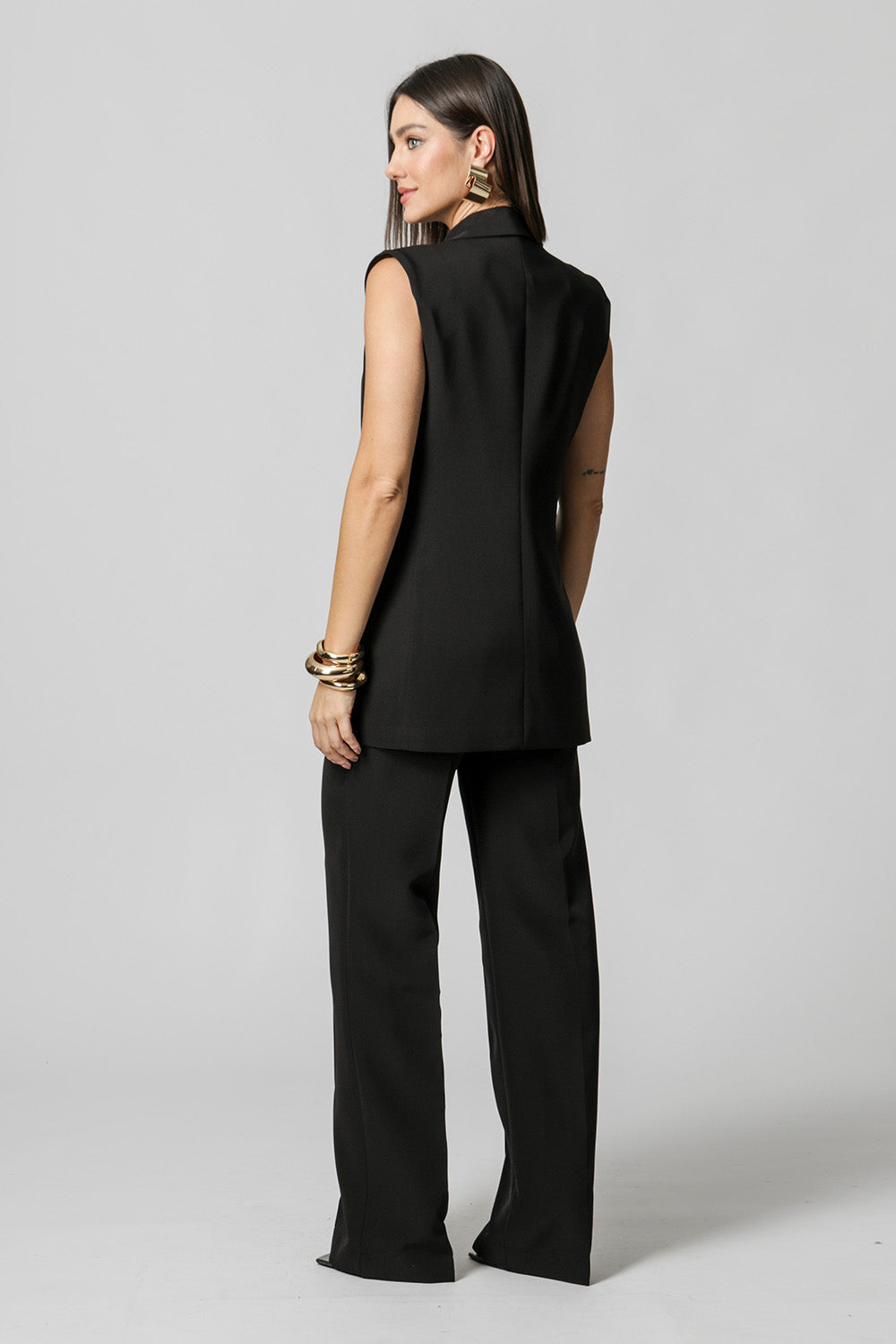 Chaleco largo con detalle de botones metálicos y forrado en su propio tejido. Pieza confeccionada en tejido sastre, forrada. Modelo clásico y versátil que se puede combinar con varios looks.