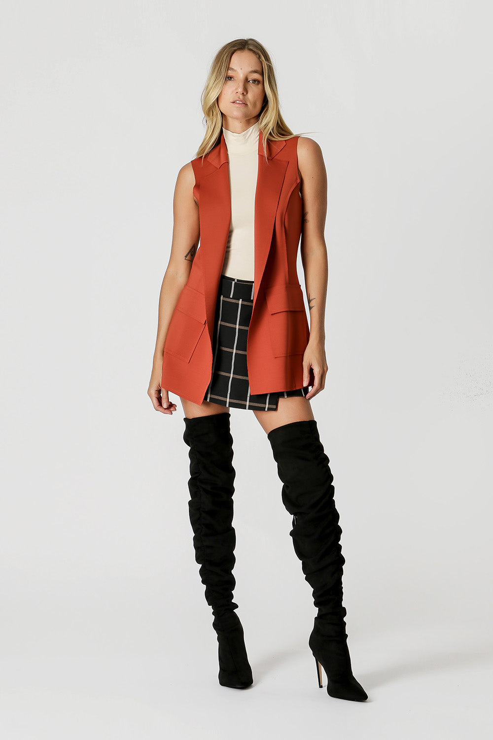 Chaleco elaborado en neopreno, con cortes que realzan la silueta y un largo mayor, cuenta con bolsillos laterales. Una tercera pieza que hace que cualquier look sea súper actual y de moda.