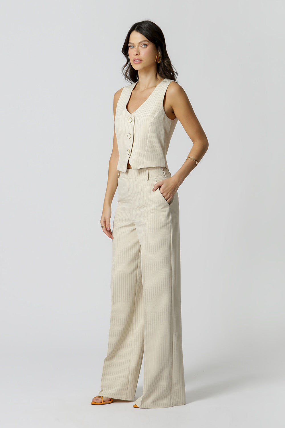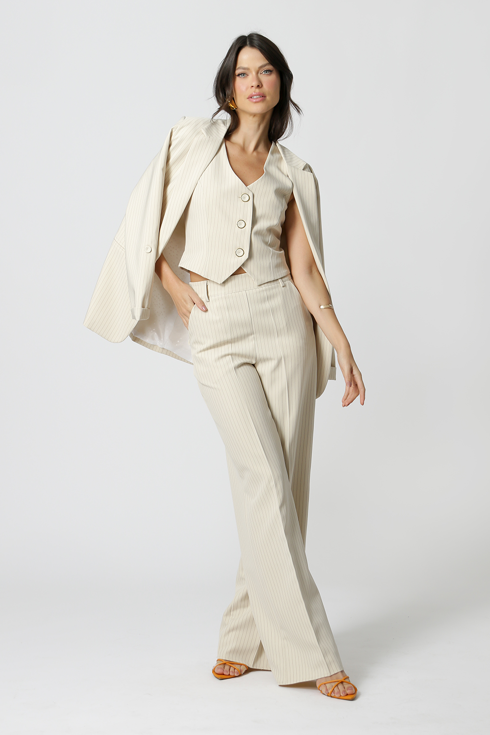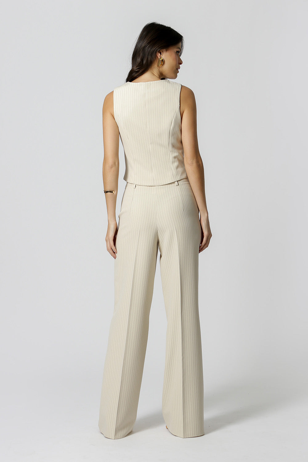 Chaleco de raya diplomática con forro interior y botones forrados del mismo tejido, confeccionado en tejido sastre. Una pieza súper trendy y estilosa para crear looks de trabajo.