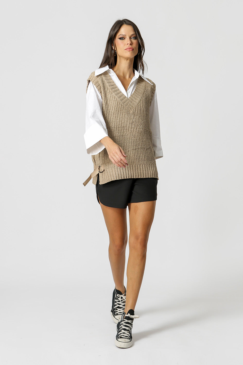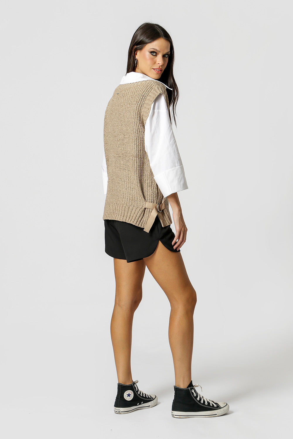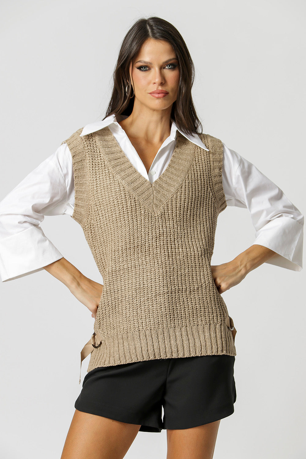 Chaleco de punto con detalle de hebillas en los laterales. Pieza en viscosa y poliamida. Un chaleco es una prenda que se puede usar encima de una camisa o como blusa.